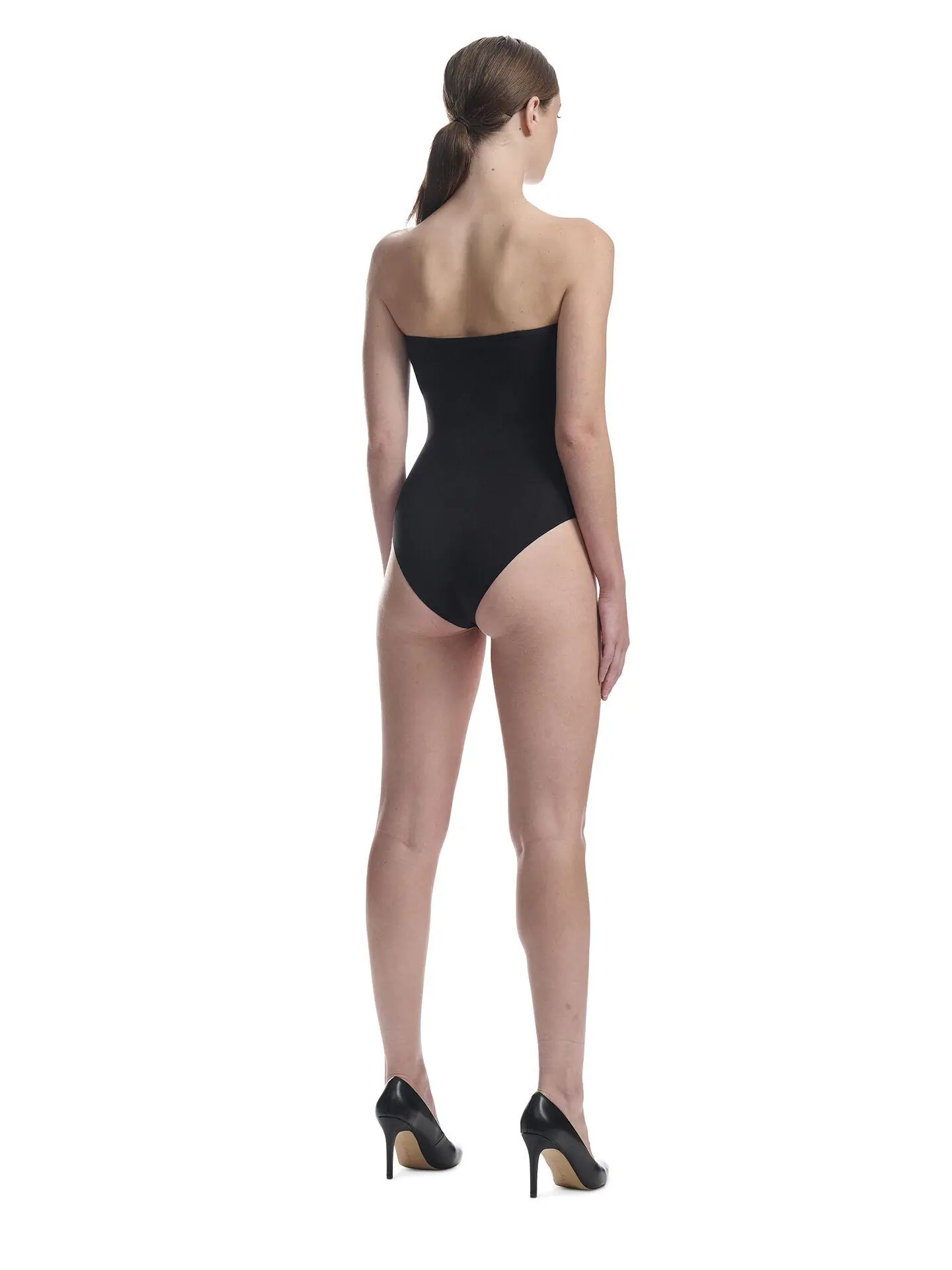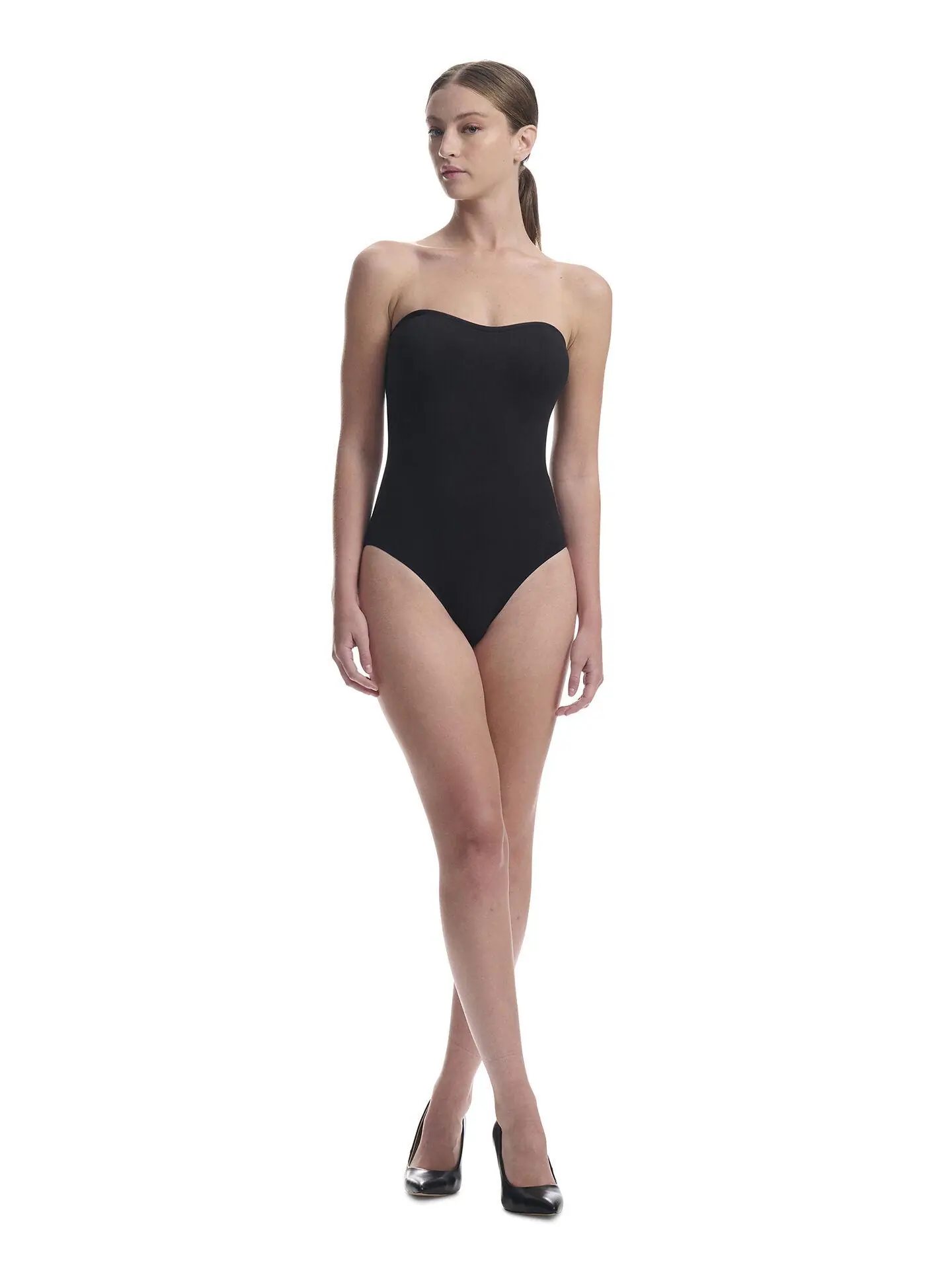 This strapless bodysuit has an architectural shape with built in side tapering panels for light shaping and an all over smoothing effect. Silicone anti-slip elastic at the neckline makes sure this bodysuit will stay put no matter how you move.