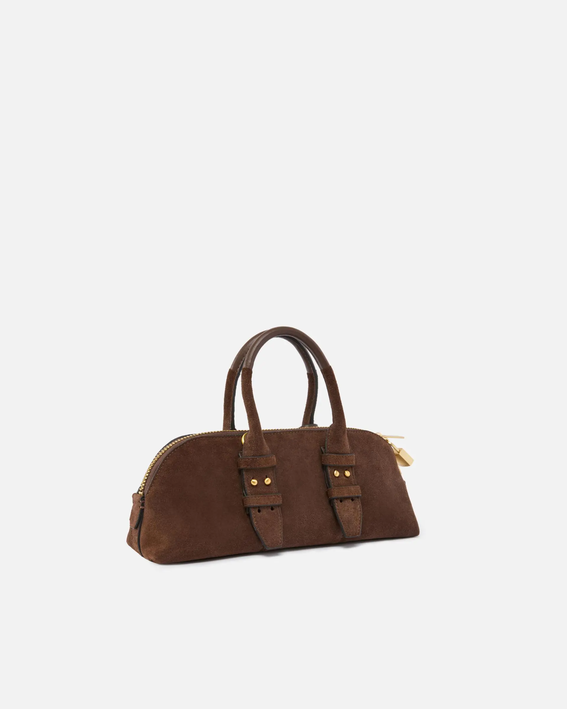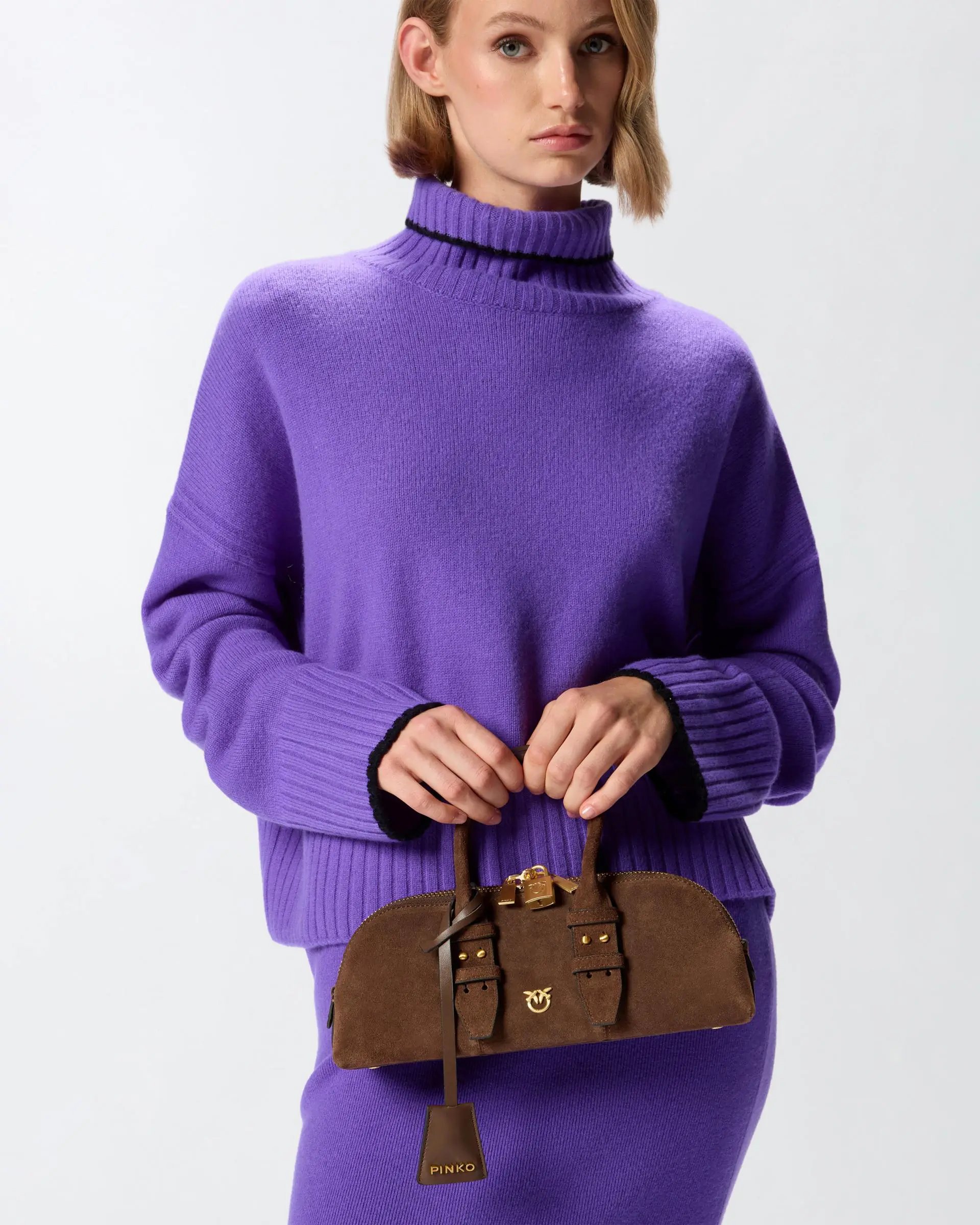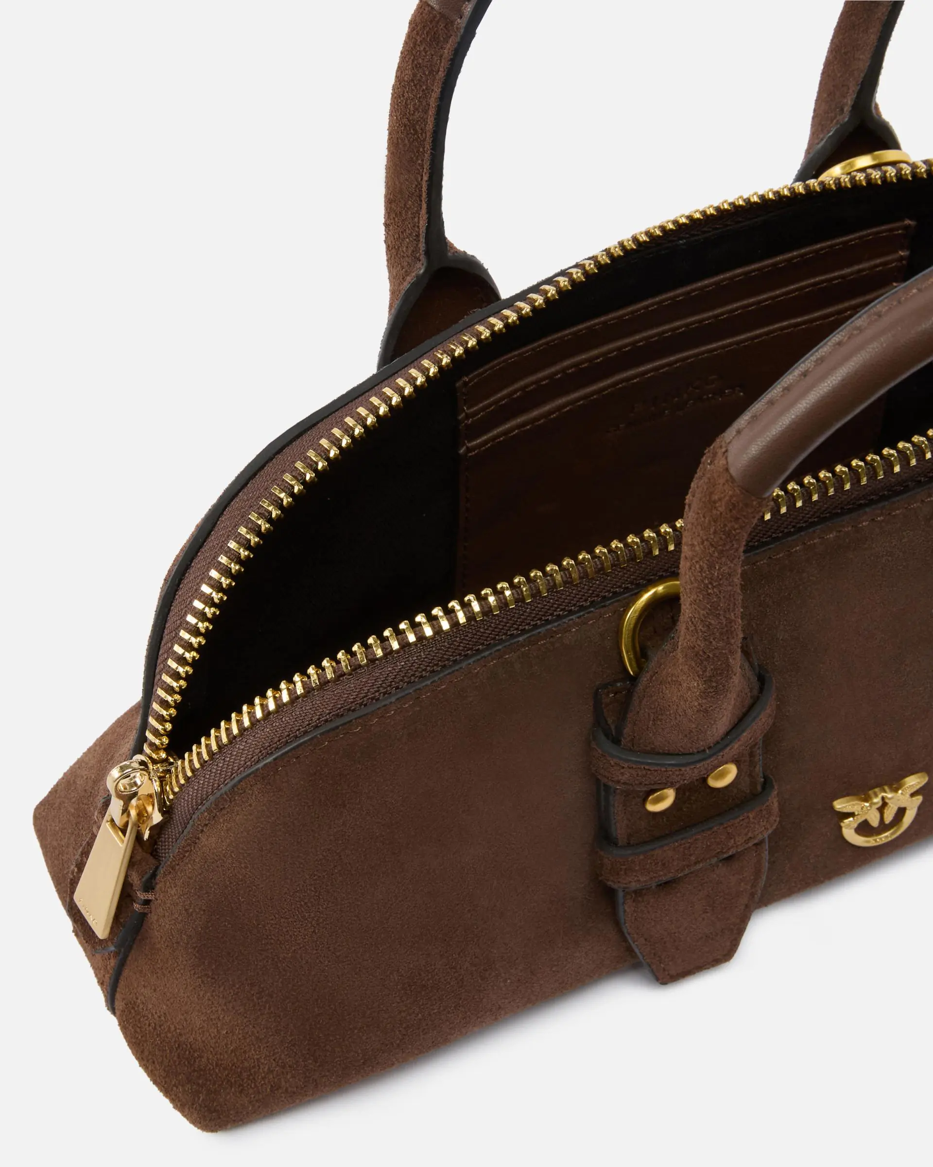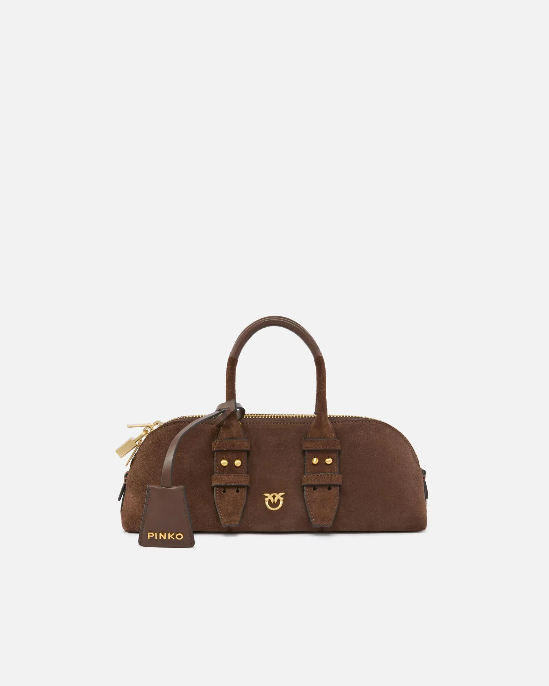 Small Baguette Escape Bag in suede with smooth, silky leather trims and an elegant, elongated rectangular shape. Featuring two handles for hand or shoulder carry, this bag is the perfect accessory for any occasion. The model features a functional padlock that opens and closes with a key contained in the matching charm, while the finishing touch is provided by the small Love Birds logo plaque symbolising the brand's singular style. Activate your PINKO bag: verify the authenticity of your product and access a personalised experience by scanning the Love Birds embroidery on the back of the bag with your smartphone!