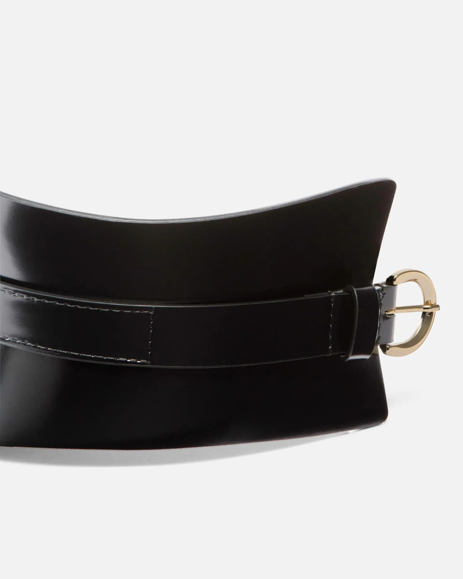 13-cm belt in soft polished leather, with a stretch insert on the back for a more comfortable and customisable fit. This accessory, which resembles the design of a corset, features a simple but striking buckle. Bold and modern, this accessory is the missing piece from your evening looks.