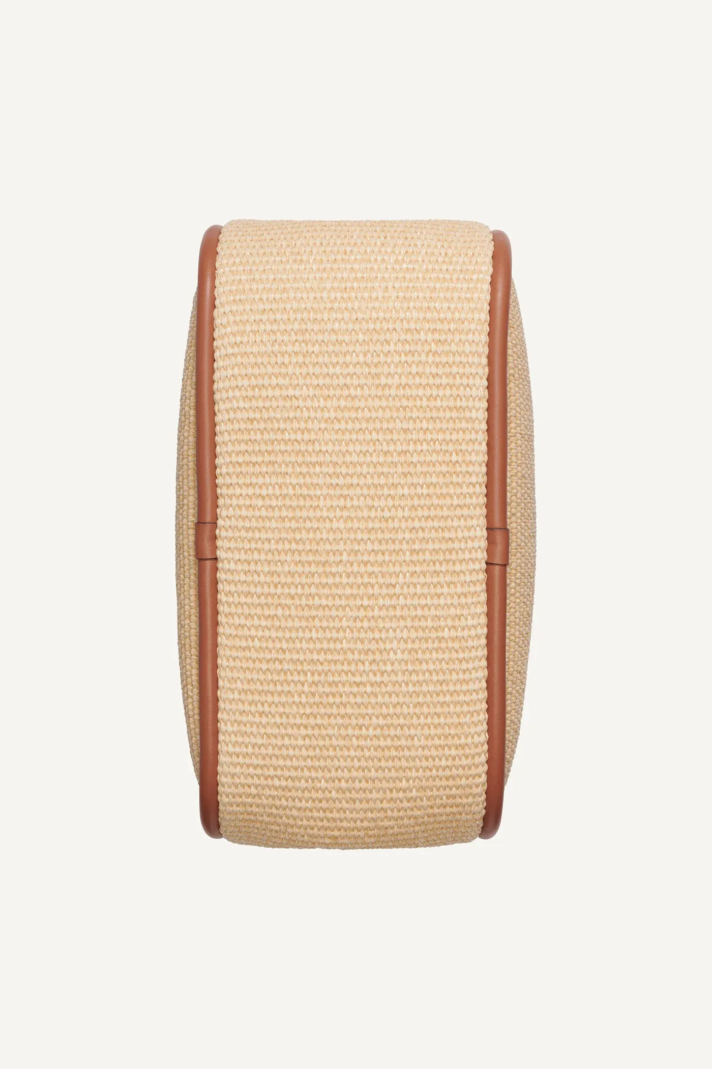Woven straw exterior: 70% polypropylene, 30% polyester; faux-leather trim: 100% polyurethane; logo-jacquard lining