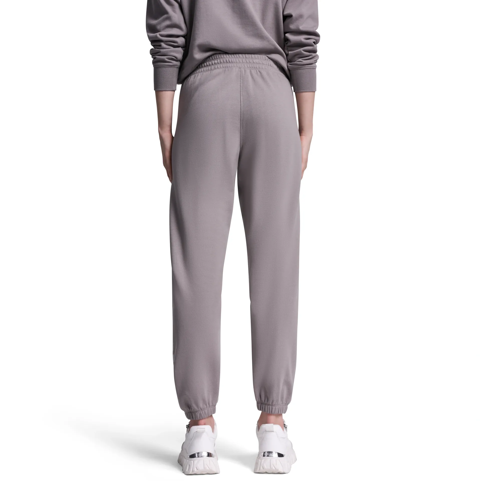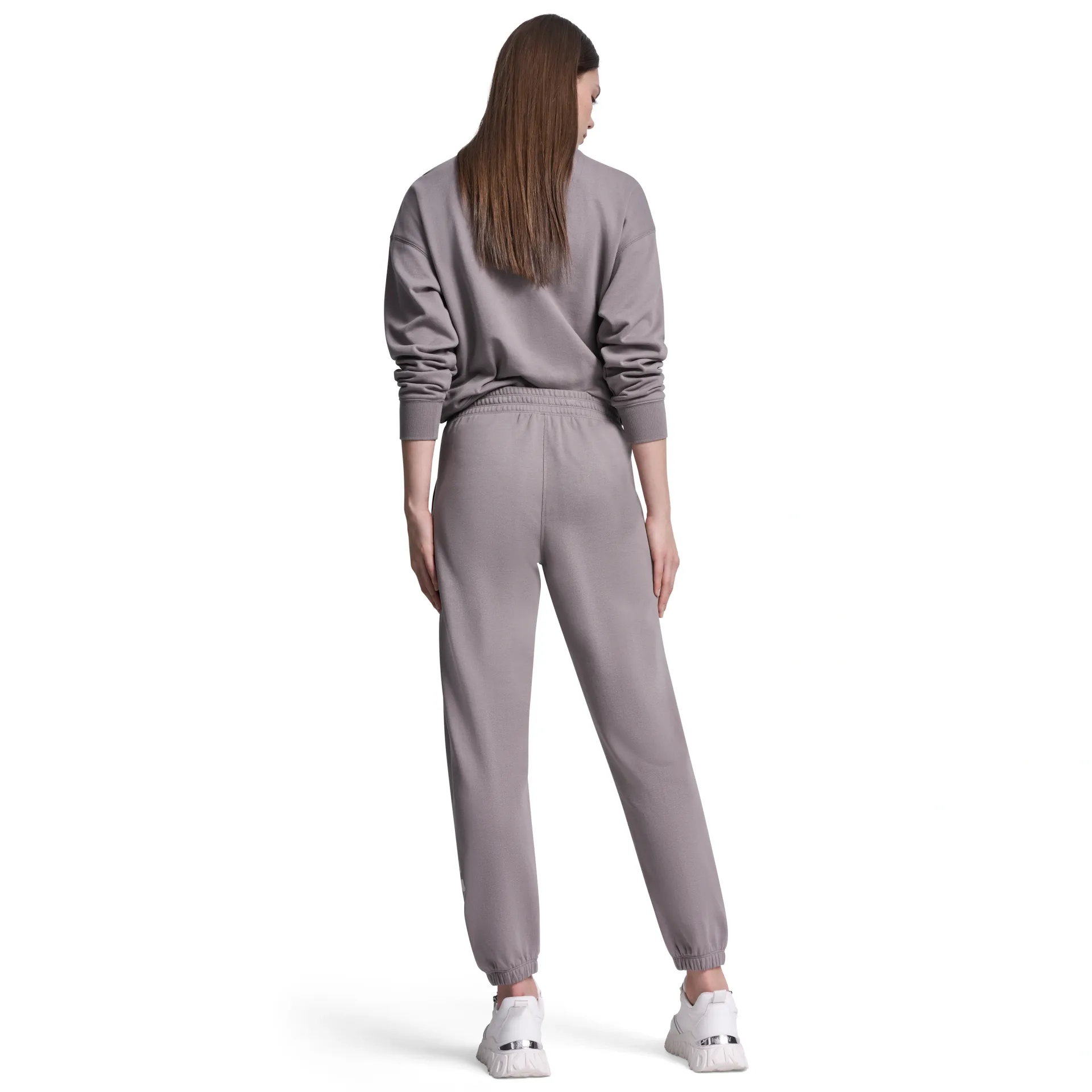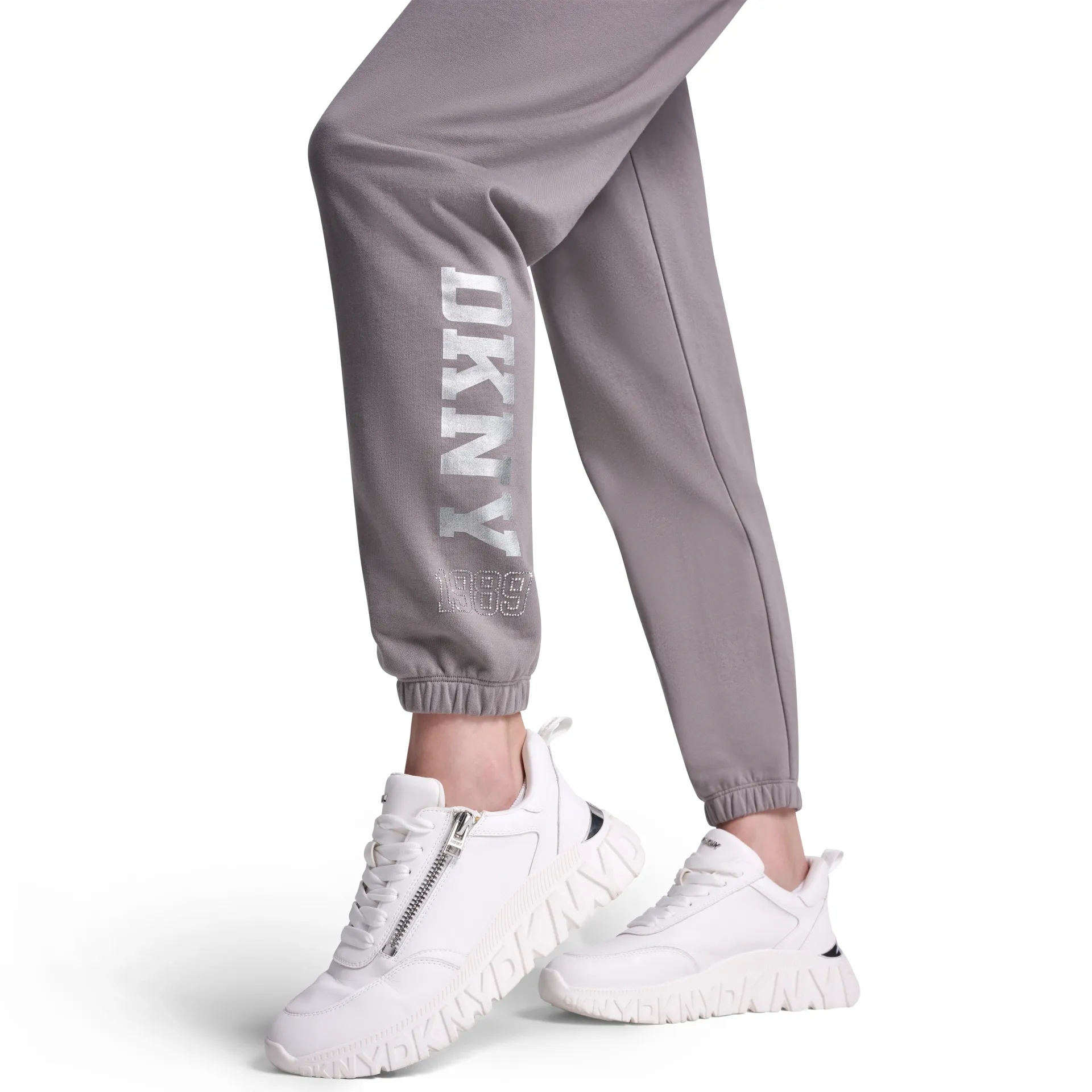 Sporty with a touch of shine, this high-rise jogger features a DKNY 1989 rhinestud logo detail on soft logo terry fabrication. Designed with a relaxed fit for all-day comfort, it’s perfect for elevated casual styling.