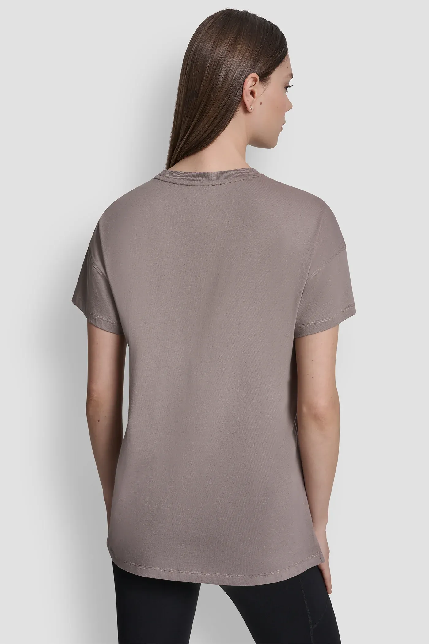 High-low tee measures approx. 26.5" L (front); 28.5" L (back) from high point of shoulder