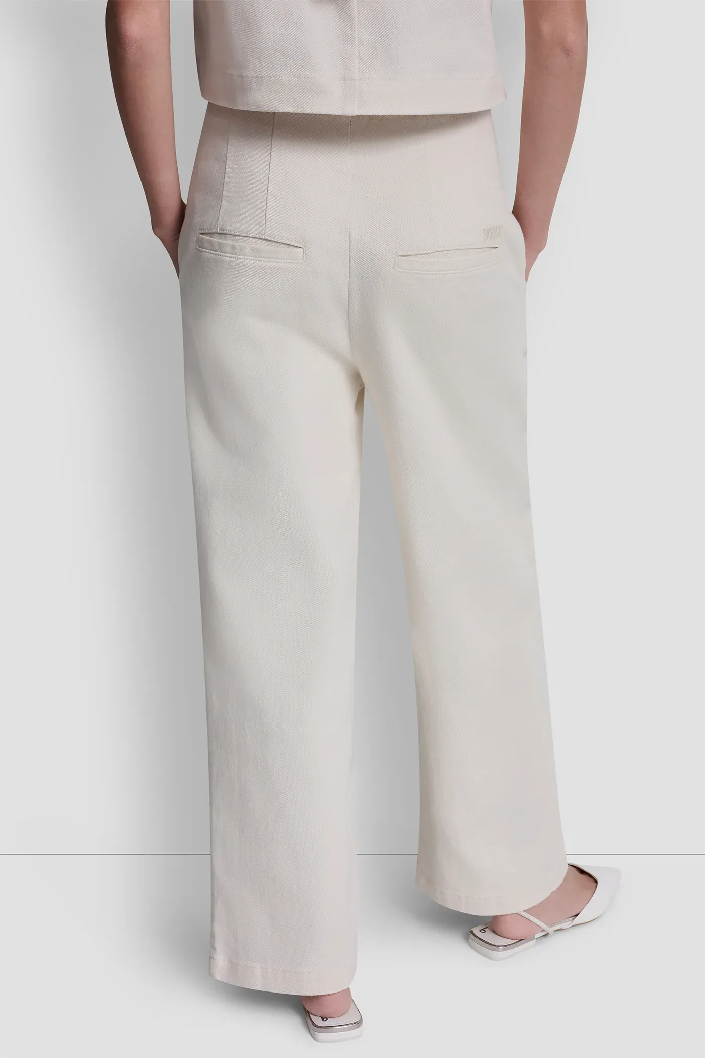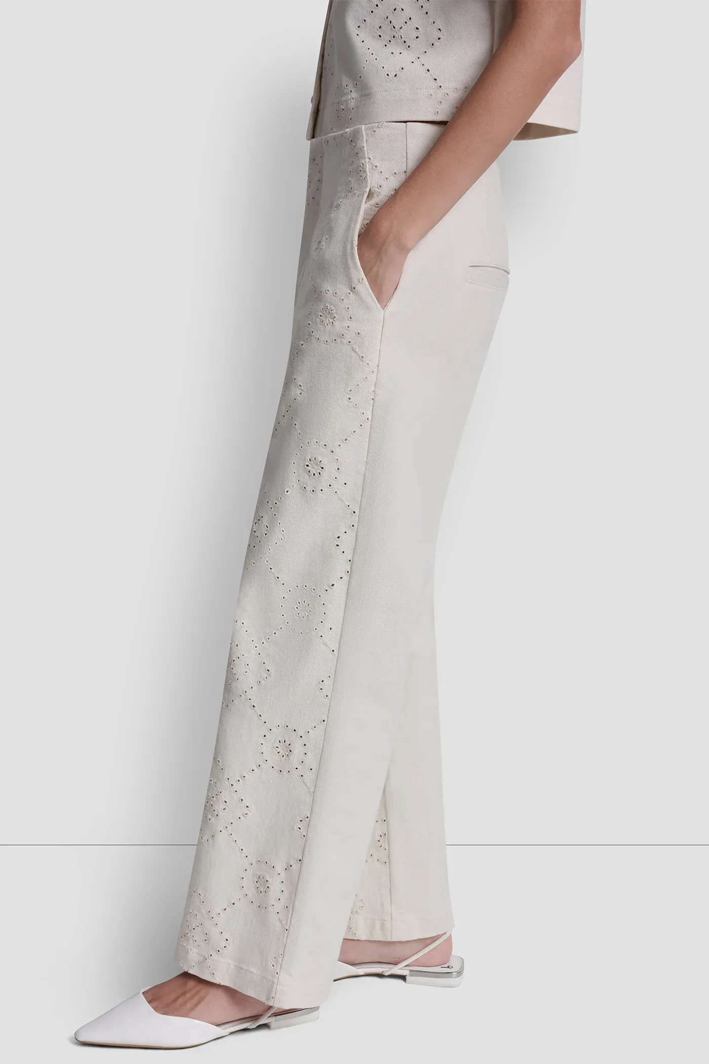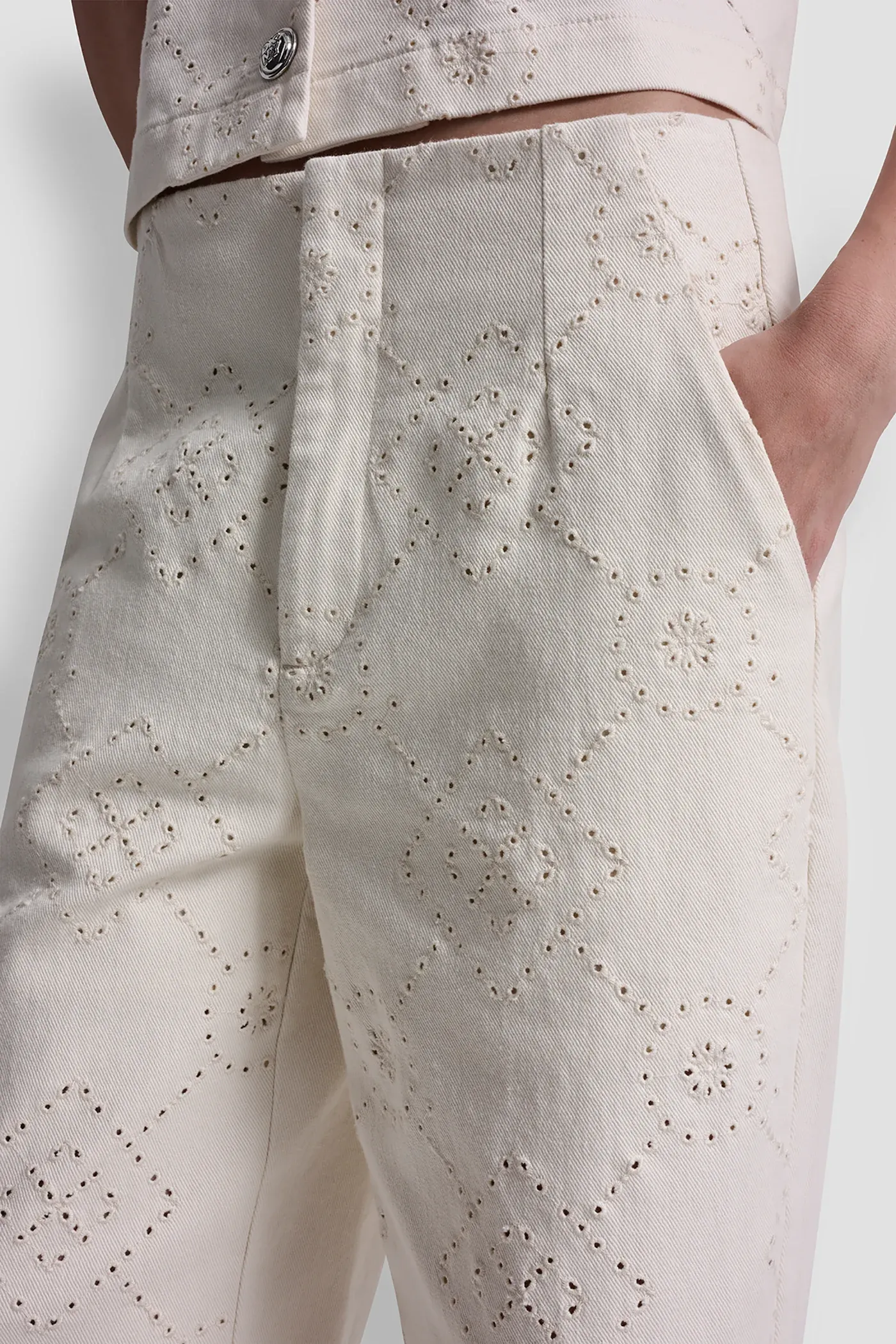 Modern and polished, these high-rise ankle pants feature an eyelet front detail with a solid back for a refined contrast. Crafted in textured stretch twill, the wide leg silhouette delivers effortless sophistication and comfort.