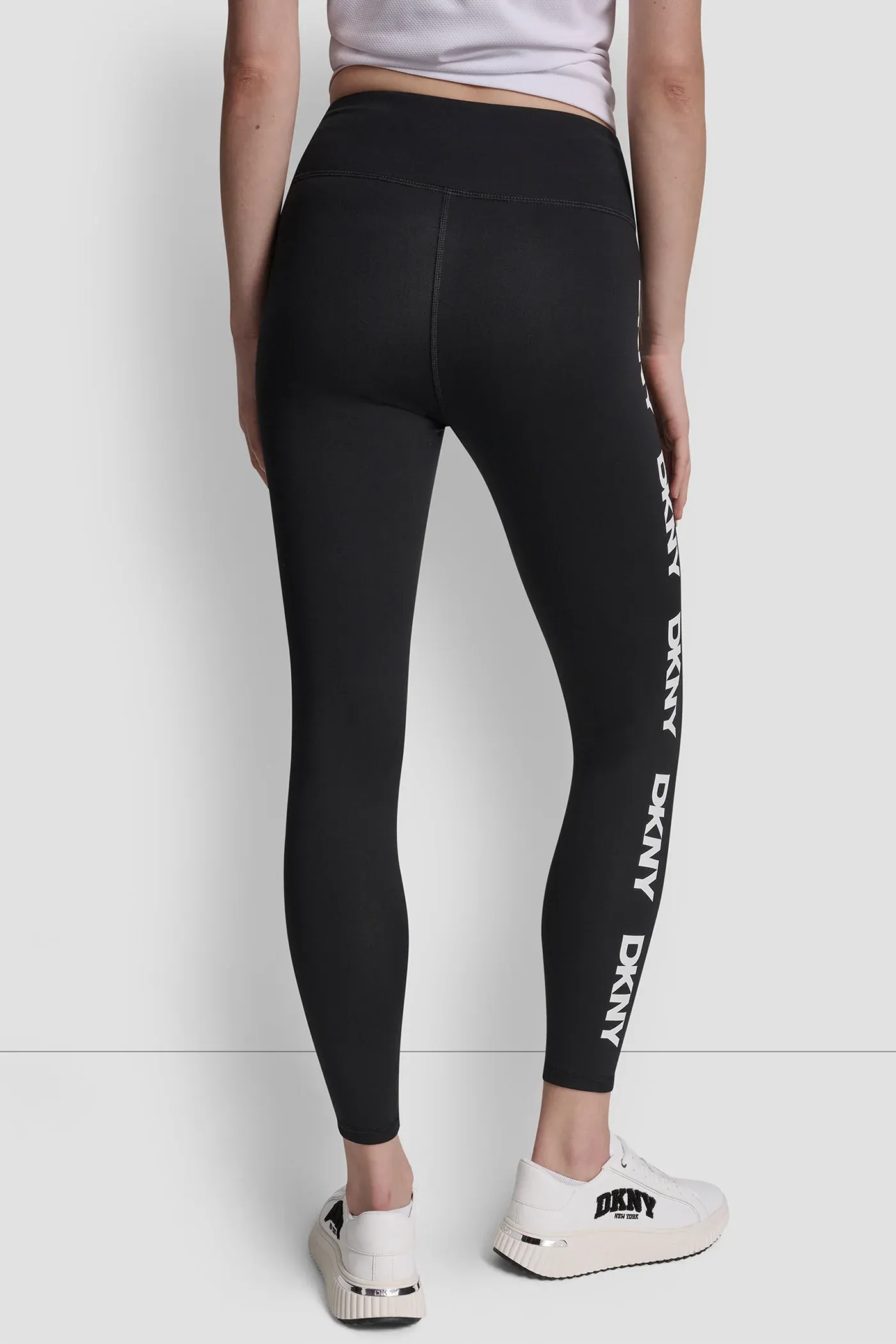 Logo-trim legging measures approx. 24" L (inseam); 9.75" (front rise); 13.75" (back rise); 4" flat-8" total (leg opening)