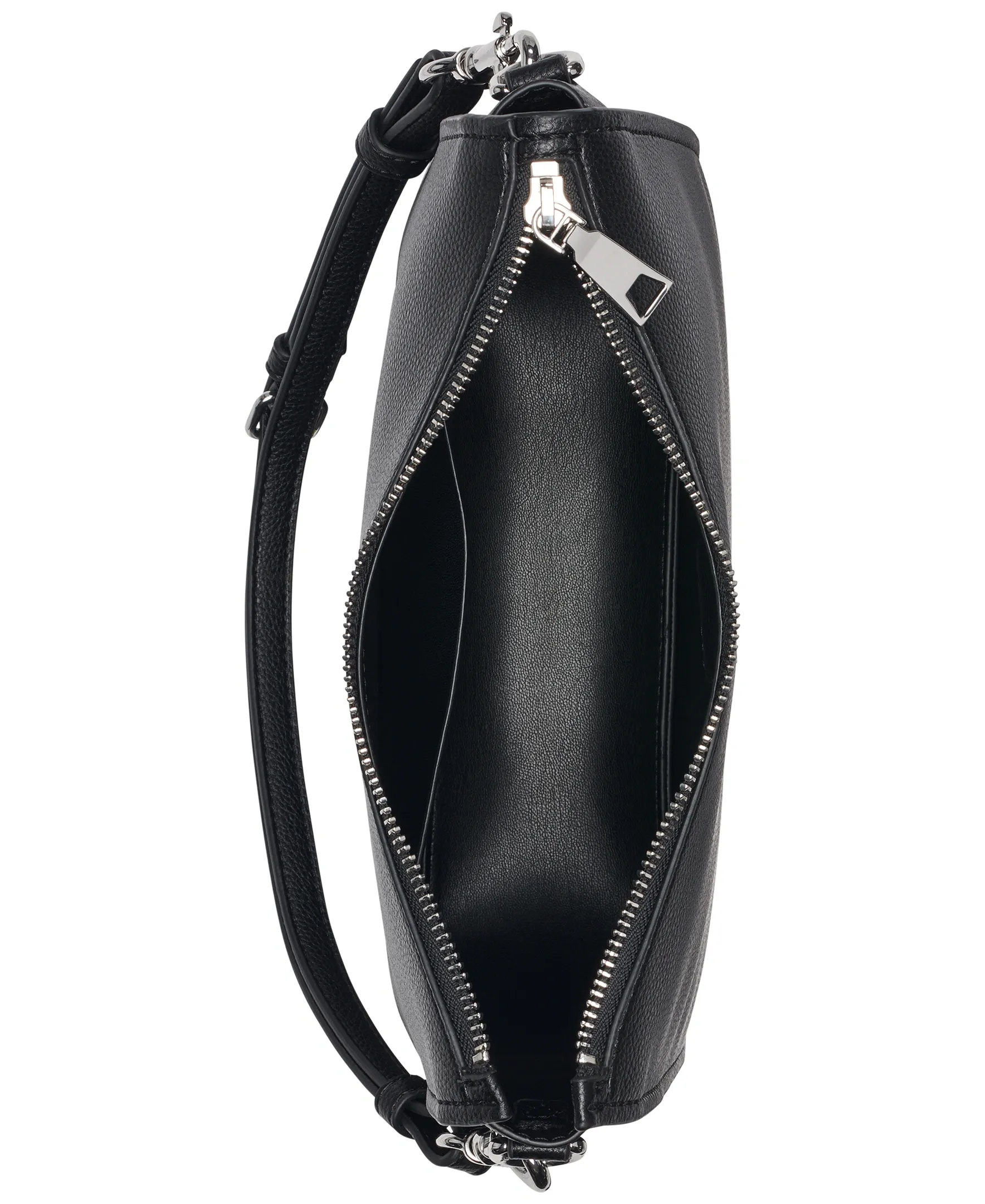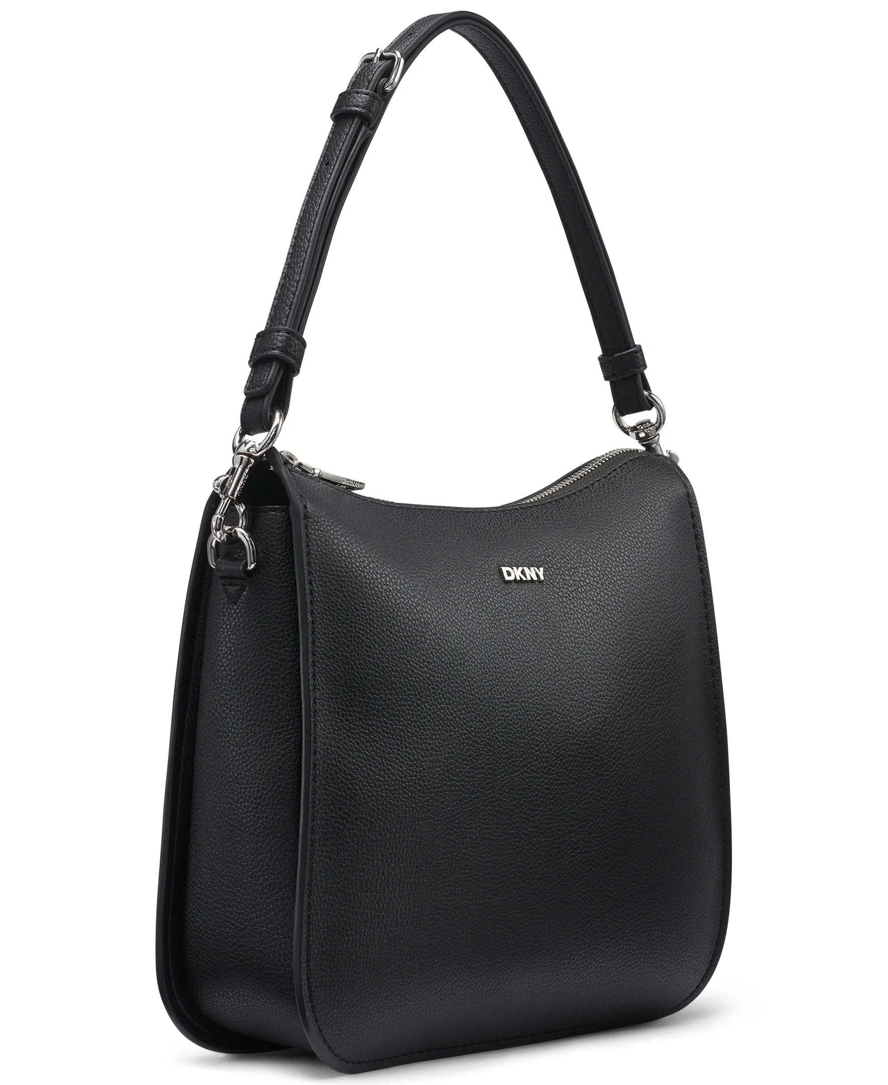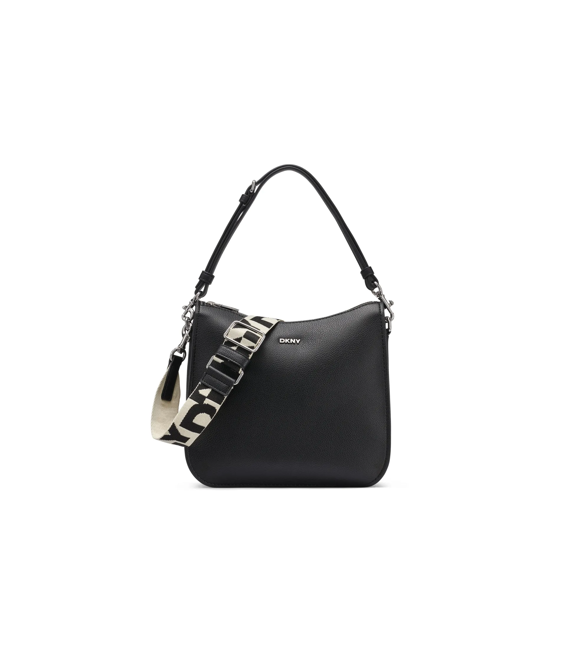 Soft bag with adjustable/removable shoulder strap by DKNY. Adjustable/removable logo strap and gold colored hardware. Zip fastening.