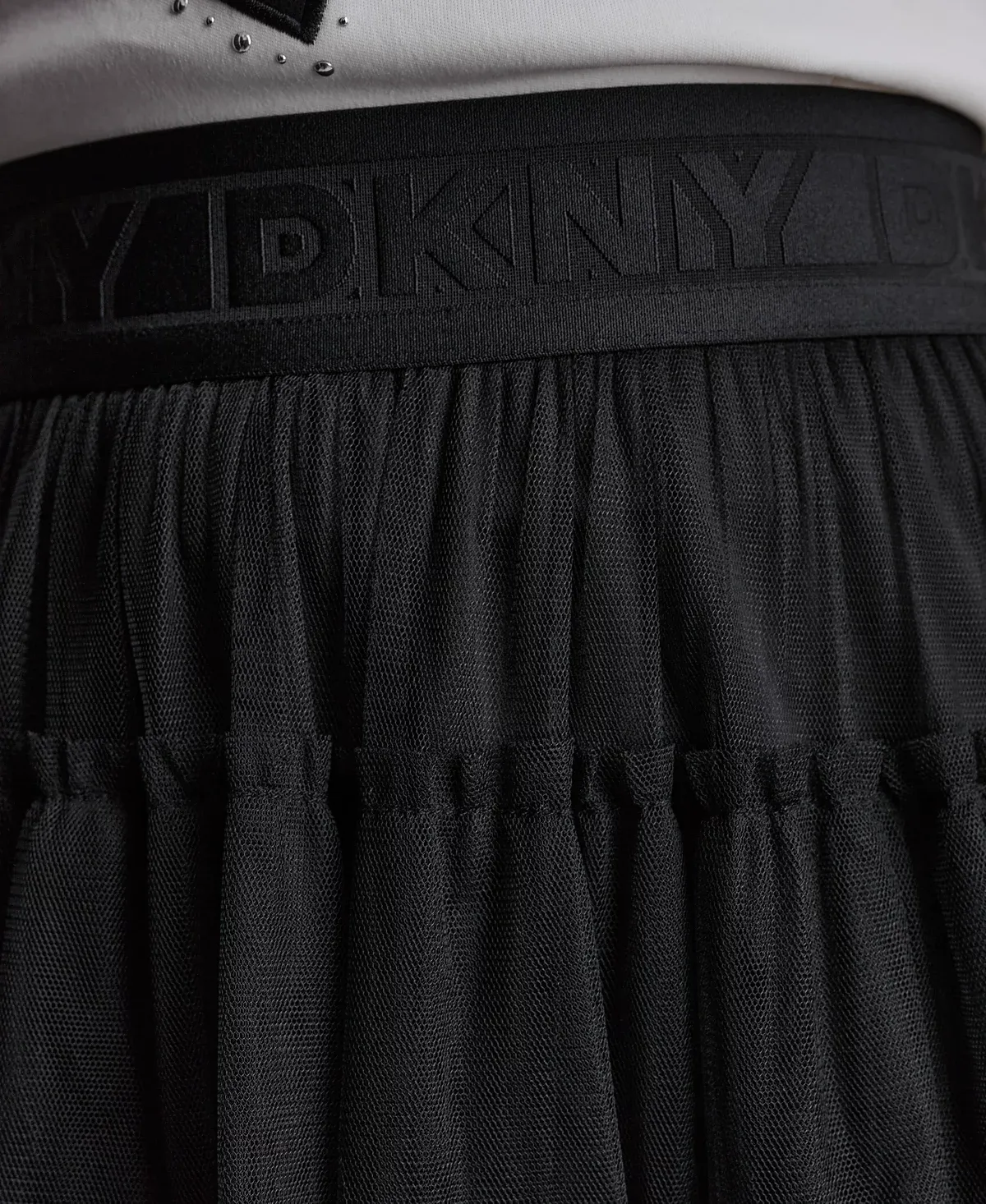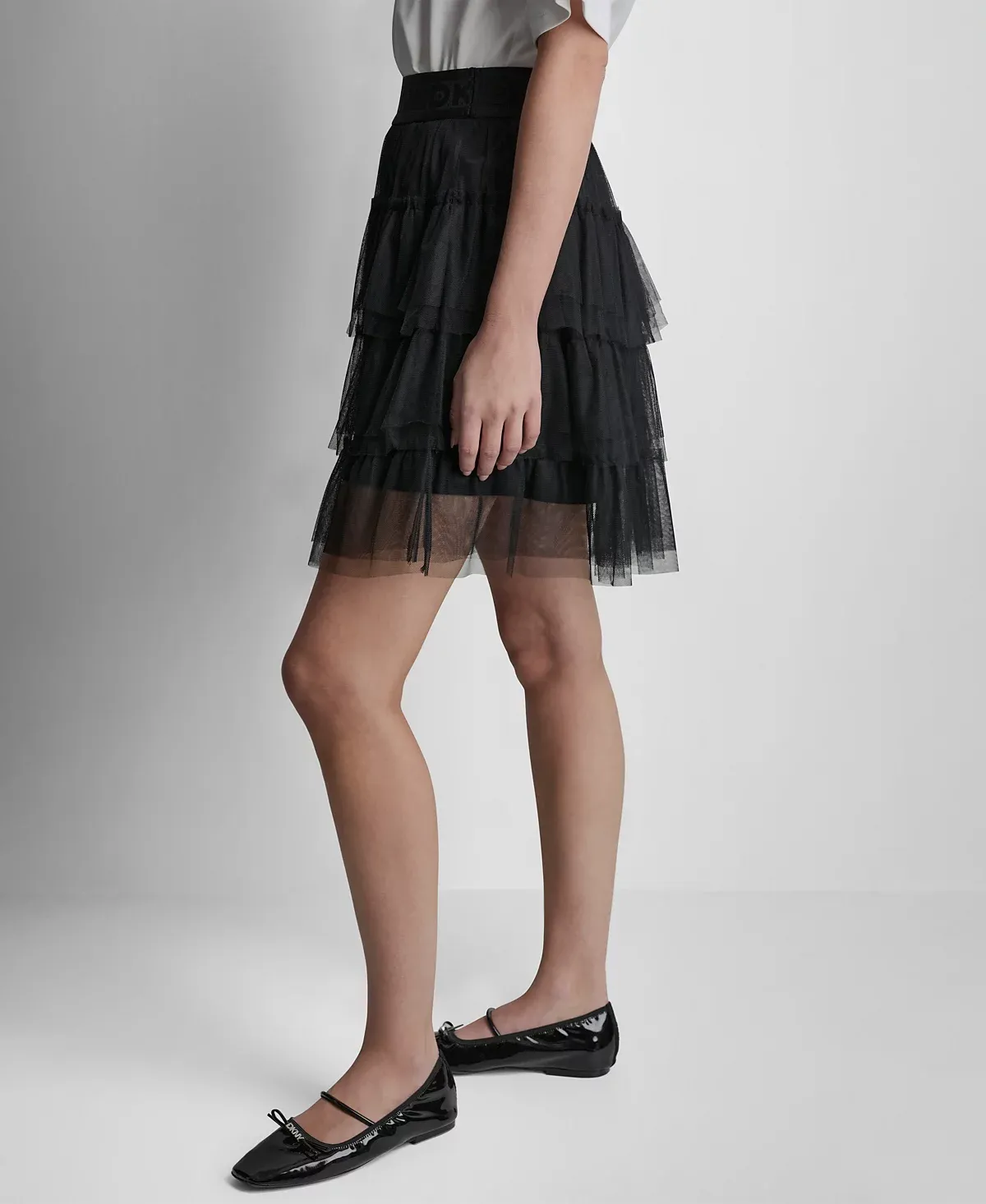 Adding a playful texture, this DKNY mesh tulle mini skirt showcases ruffled layers and an A-line shape that brings lightness and flow above the knee. A pull-on waistband detailed with the brand logo ensures easy wear.