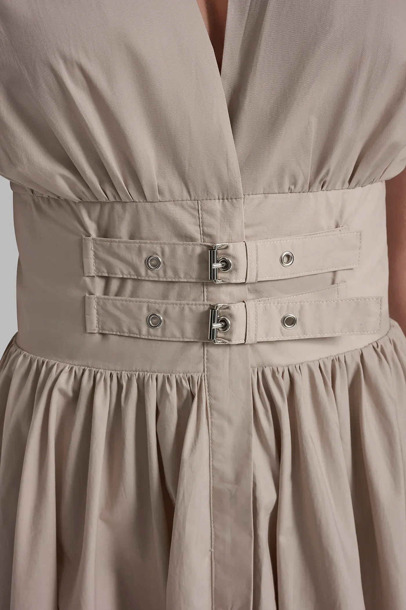 Crisp poplin meets modern structure in this smocked waist midi dress. Designed with a flattering V-neckline and finished with a buckle detail at the waist, it balances tailored polish with effortless wearability for day-to-night styling.