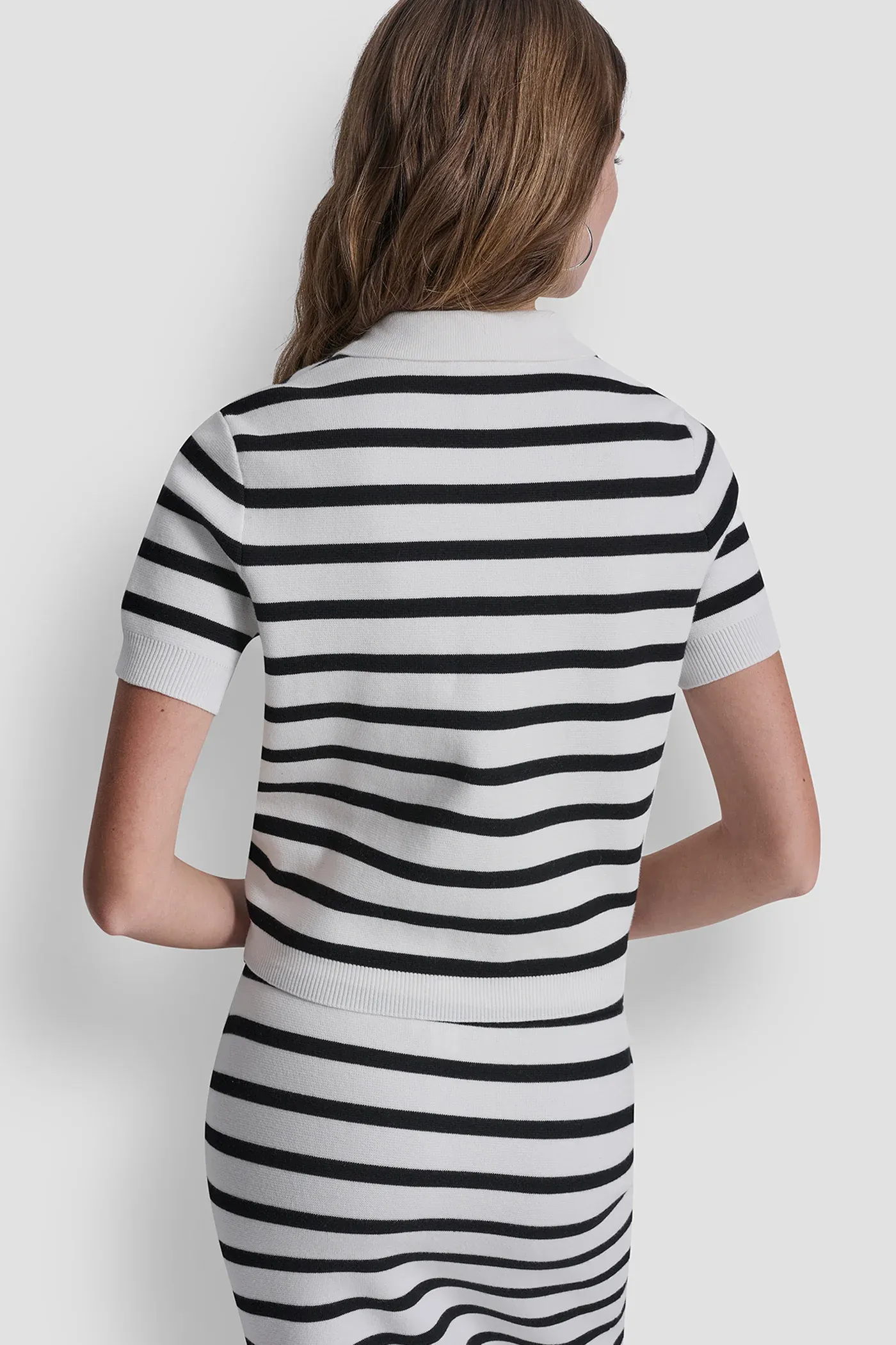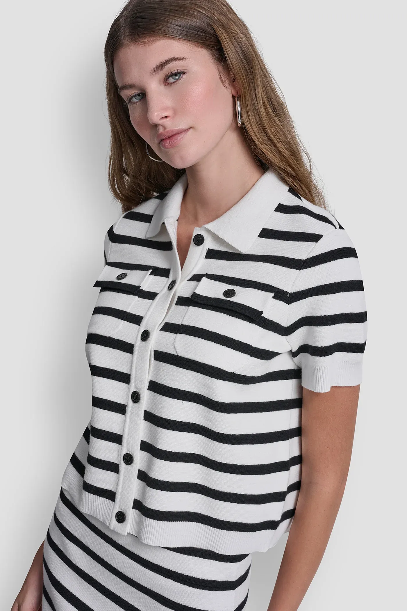A classic striped polo cardigan with short sleeves and chest pockets, perfect for layering over tees or pairing with skirts and jeans.