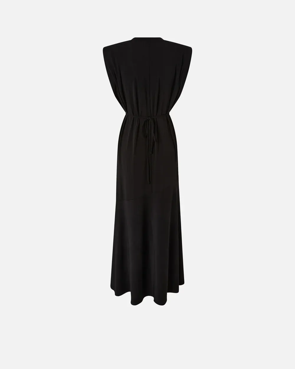 Long round-neck dress with a sleeveless design, made of stretch crepe jersey with a shiny silk-like appearance. This garment features a soft silhouette, accentuated by the wavy-effect hem, and is complete with a removable waistband and is complete with a removable waistband with a fabric front, to be tied as you wish, and a chain back, for an edgy detail that expresses the PINKO DNA. This dress is ideal for a feminine daytime look with a pair of low shoes or a special-evening outfit with a pair of pumps.
