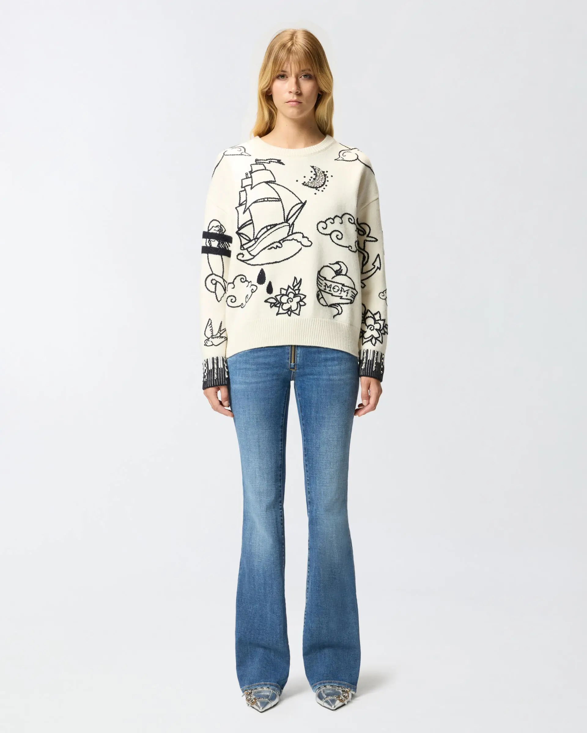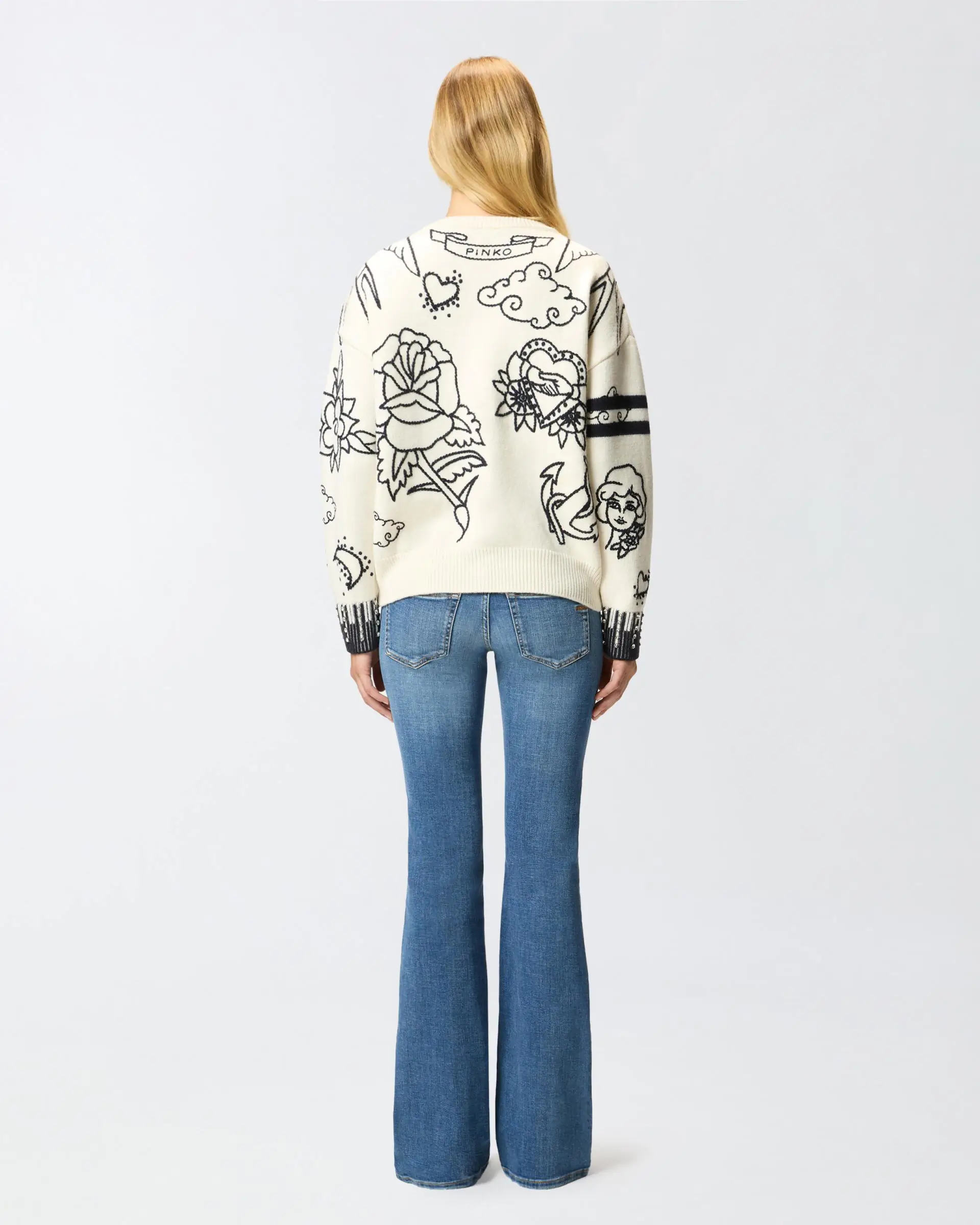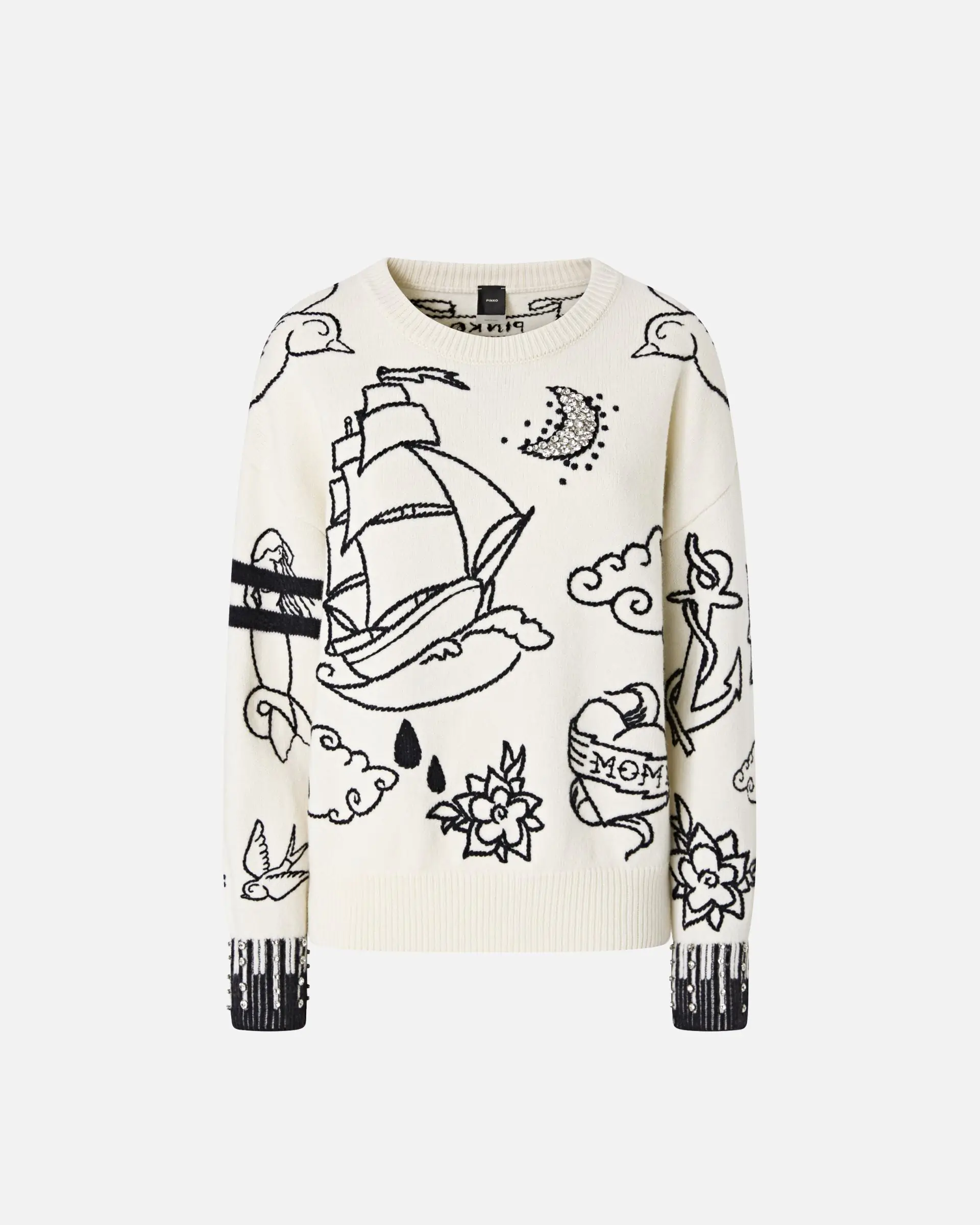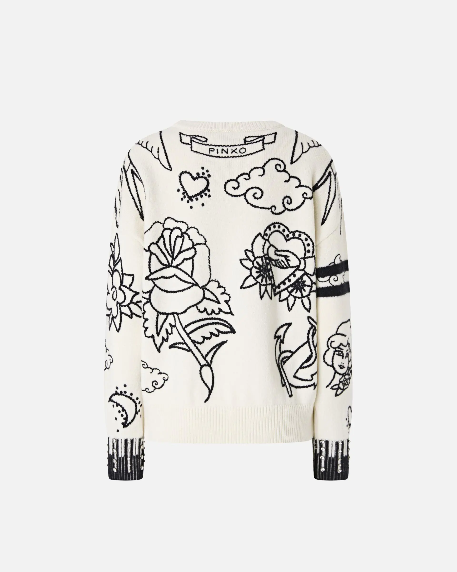 Long-sleeved crew-neck sweater in merino wool: a soft and lightweight yarn for an original wardrobe. Show off a new look with this design that is lush with embroidered patterns and rhinestone details on the cuffs. The crew-neck, hem and cuffs are ribbed, while the final touch is given by the PINKO lettering logo on the back of the design. The piece has undergone finishing tests to minimise the possible formation of pilling, ensuring greater fabric softness and durability.