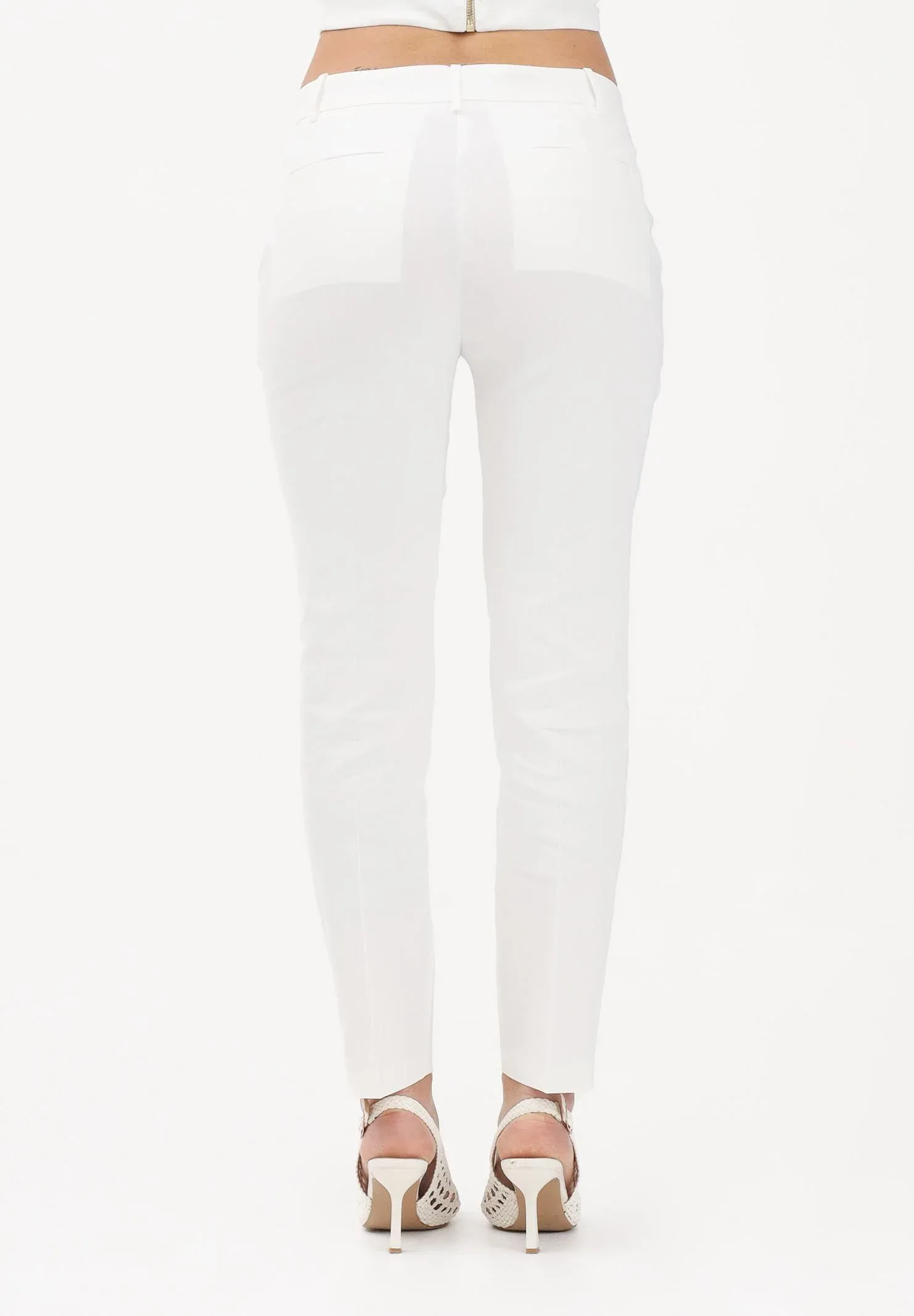 PINKO Elegant white women's trousers featuring a slim fit and a regular fit that accentuates the figure without constricting. The waist is finished with a belt, belt loops, and a front closure, while the straight, tapered leg is embellished with a central pleat that adds structure and slims the figure. The fabric is fluid yet compact, pleasant to the touch and comfortable to wear, ideal for completing refined and contemporary looks, perfect for both formal occasions and more sophisticated daytime outfits. The model wears a size 40 and is 170 cm tall. We recommend washing and ironing at medium heat. Spring/Summer season.