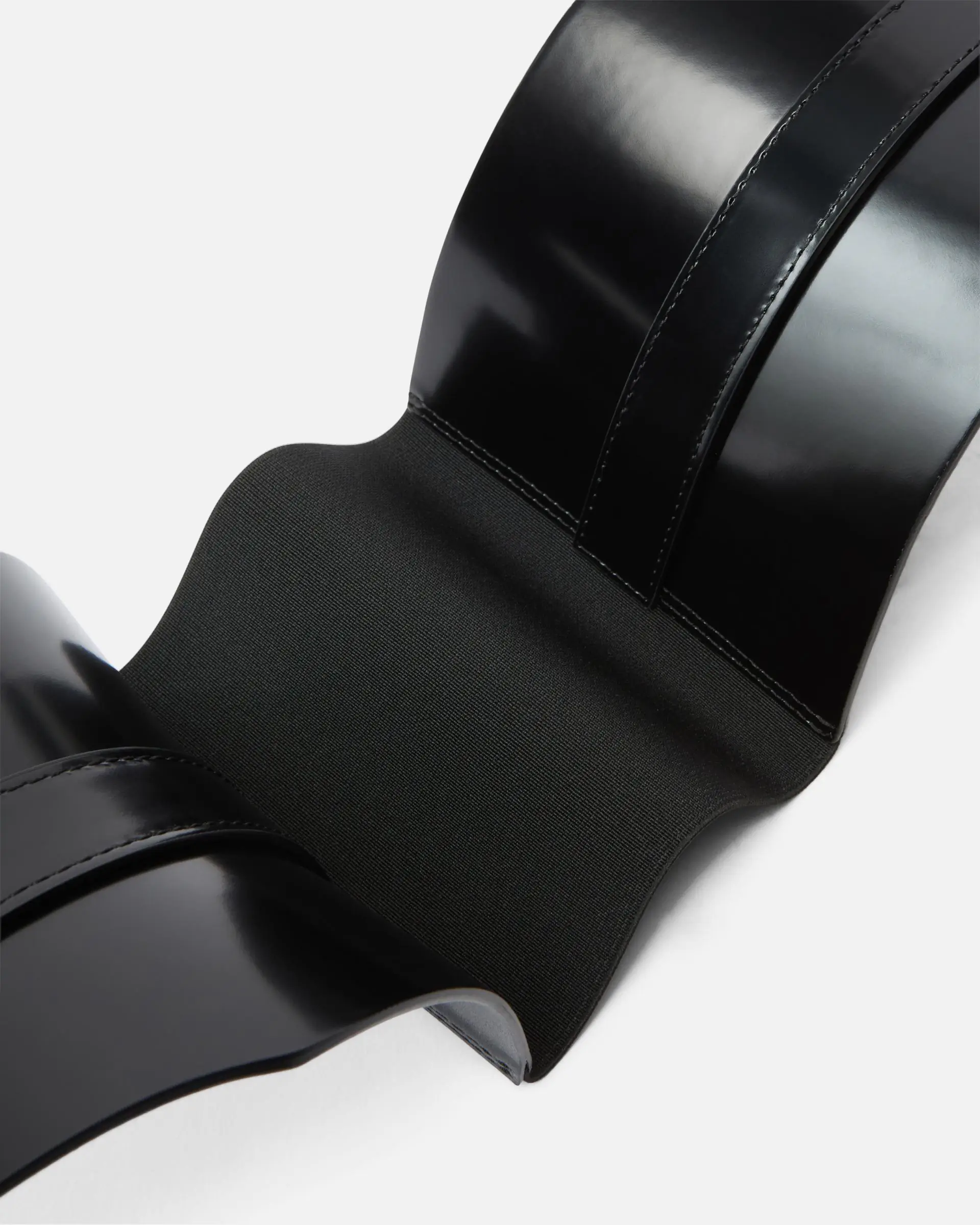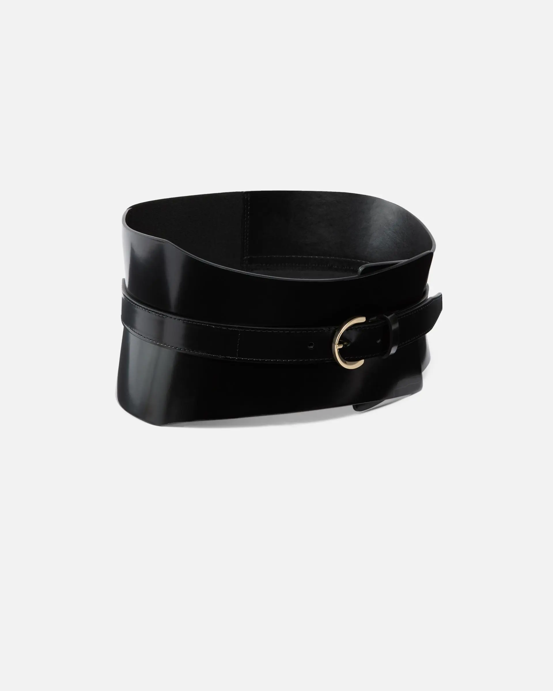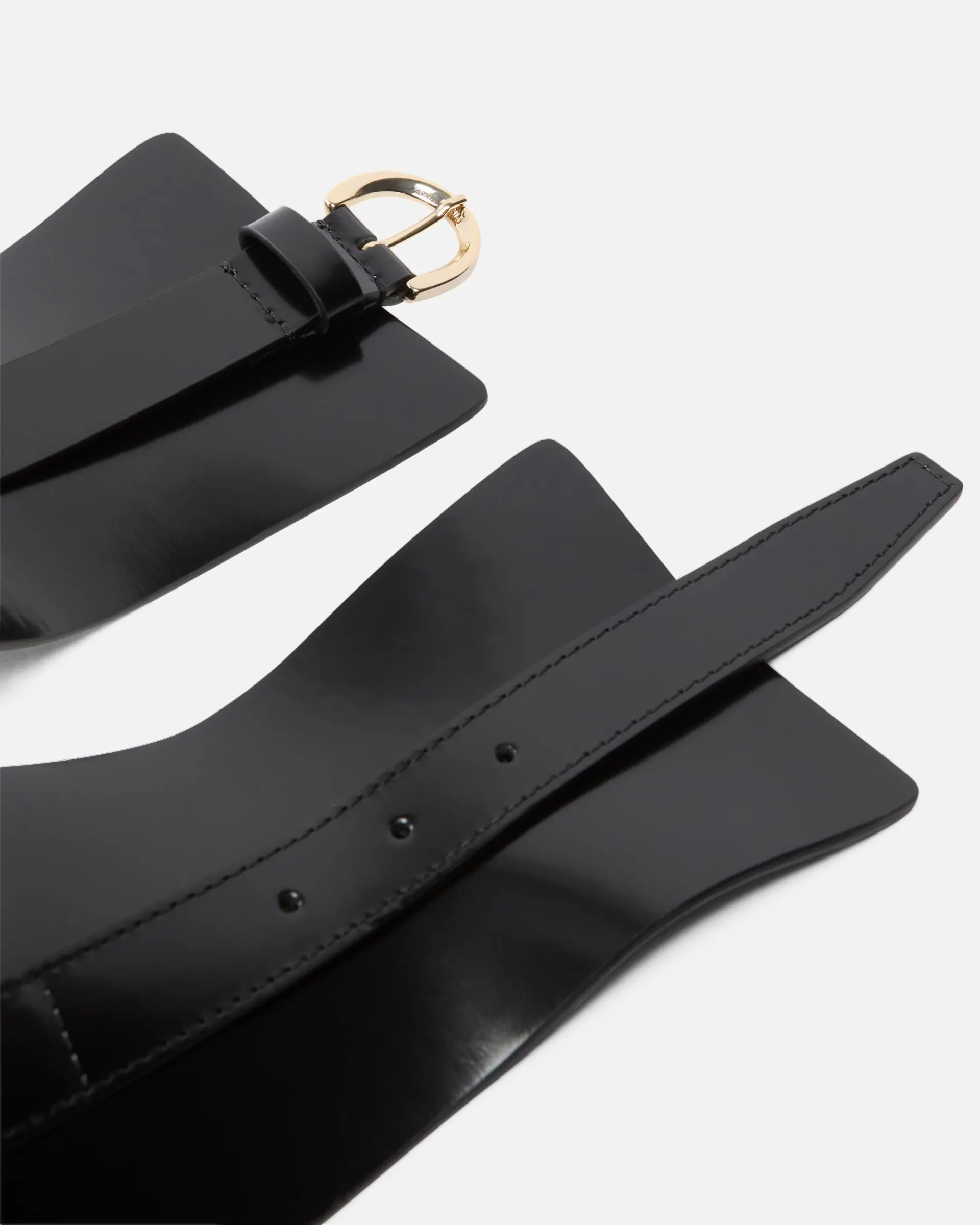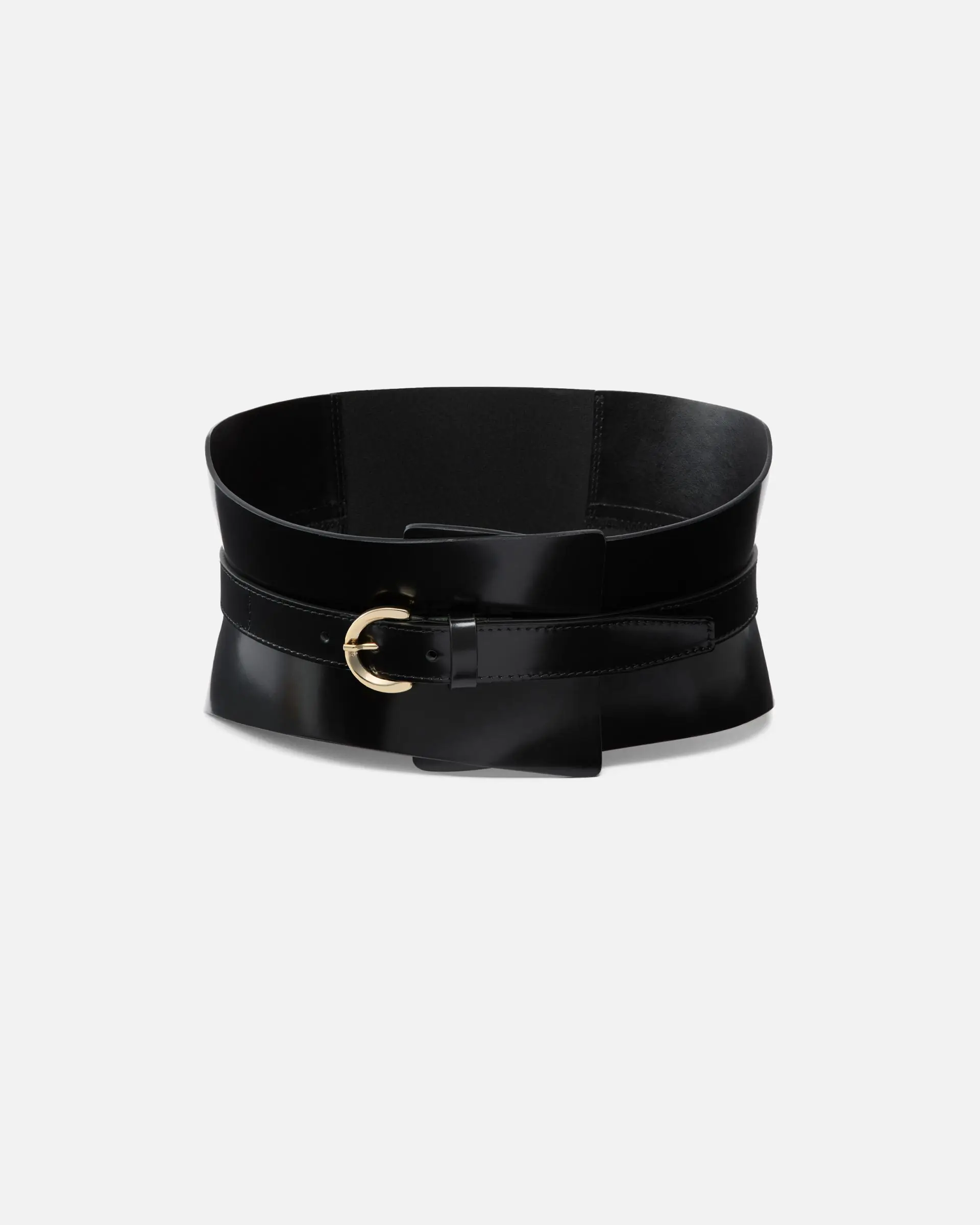 13-cm belt in soft polished leather, with a stretch insert on the back for a more comfortable and customisable fit. This accessory, which resembles the design of a corset, features a simple but striking buckle. Bold and modern, this accessory is the missing piece from your evening looks.