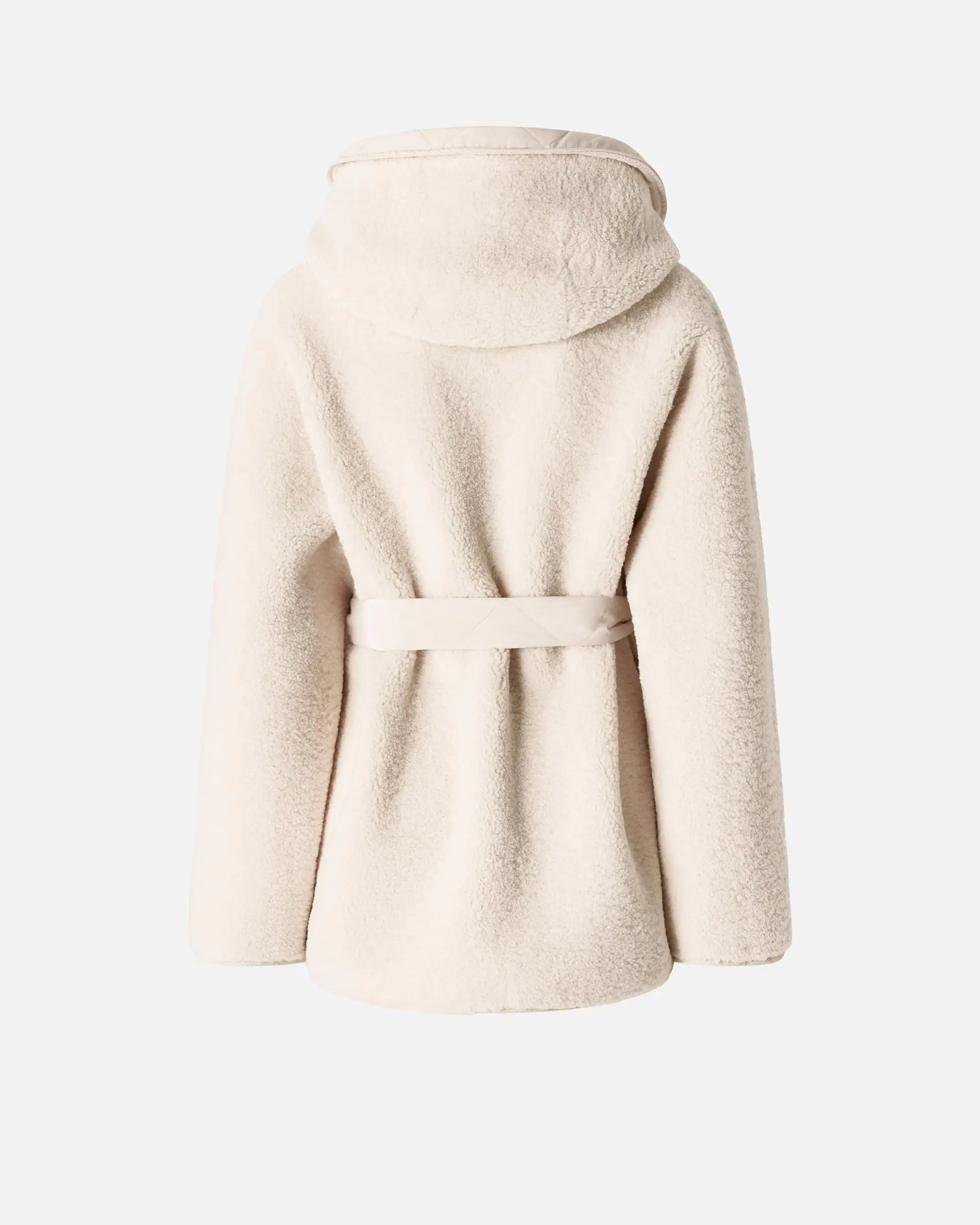 Short pea coat with a wide hood, made from soft faux fur teddy-effect fabric combined with technical canvas details, for a look that combines style and functionality. This garment is complete with a matching belt in the same fabric, which ties at the waist. Metal press-stud fastening.