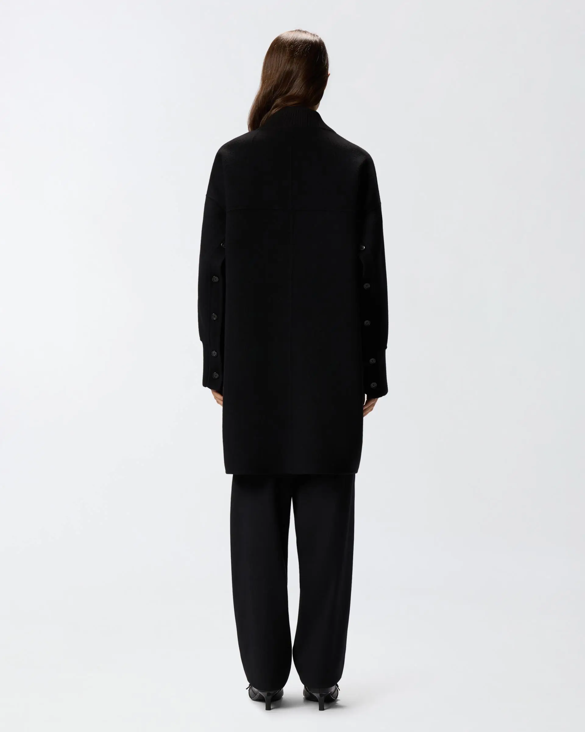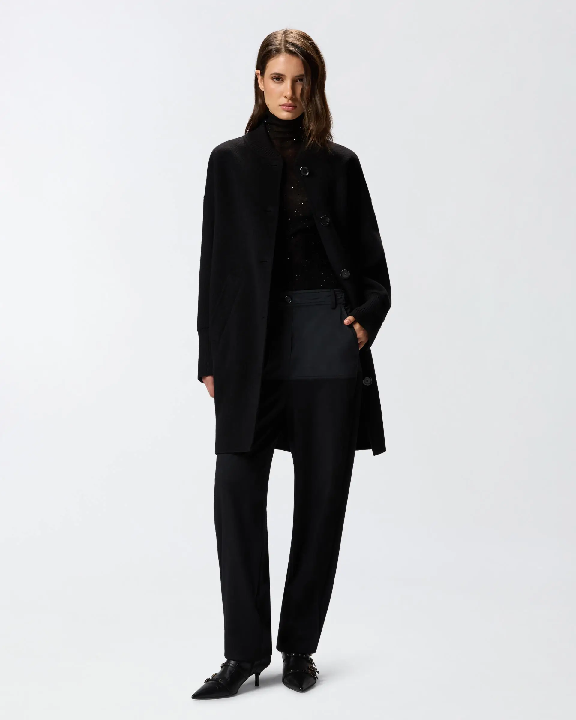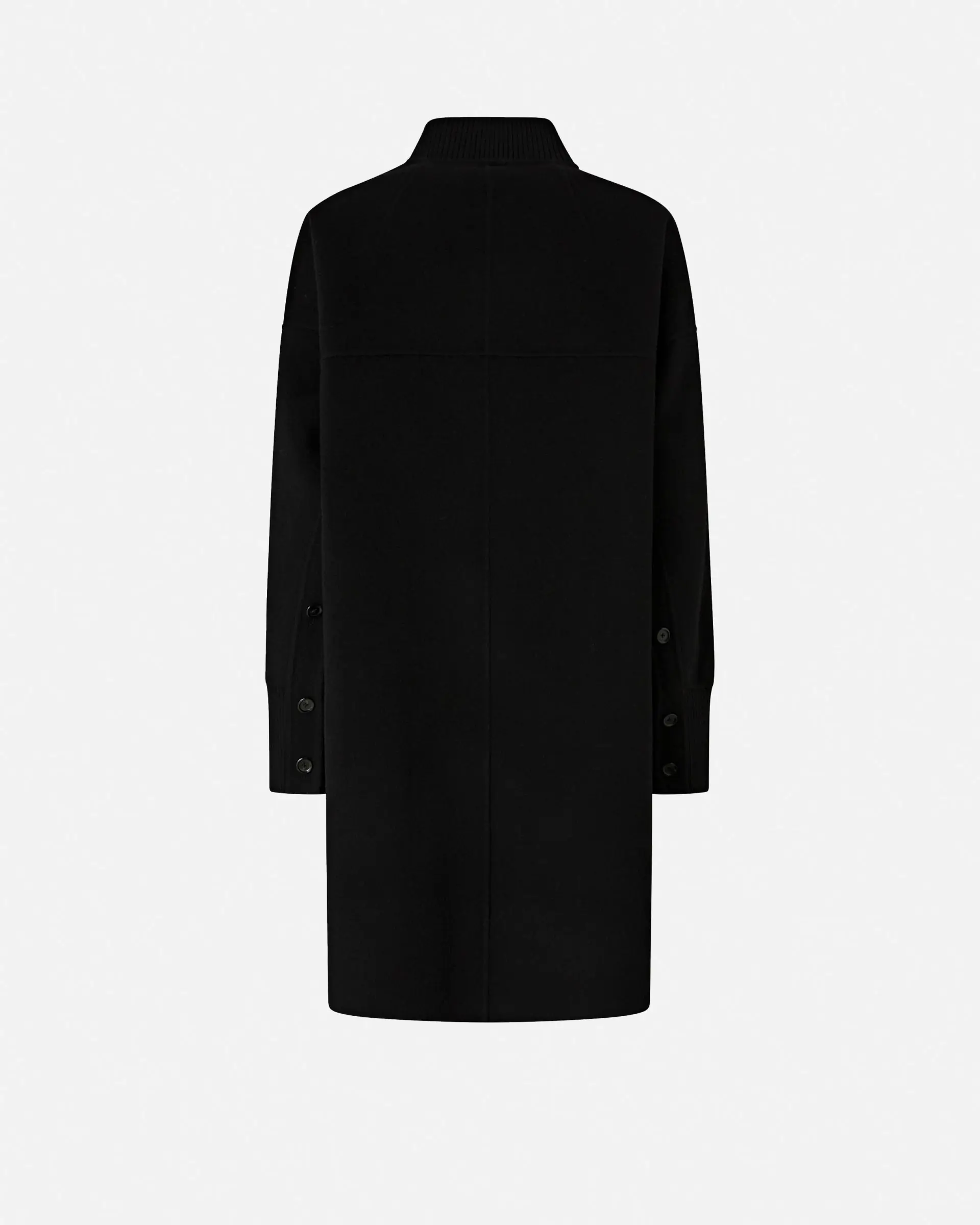 Lined and slightly rounded cocoon coat in double wool-blend cloth. This piece of outerwear is completed with slanted pockets, long sleeves with buttoned cuffs, and a rib knit on the bomber-style collar and wide cuffs. Front button fastening. No other outerwear piece will protect you from the cold in class like this single-breasted coat, the perfect blend of comfort and timeless style.
