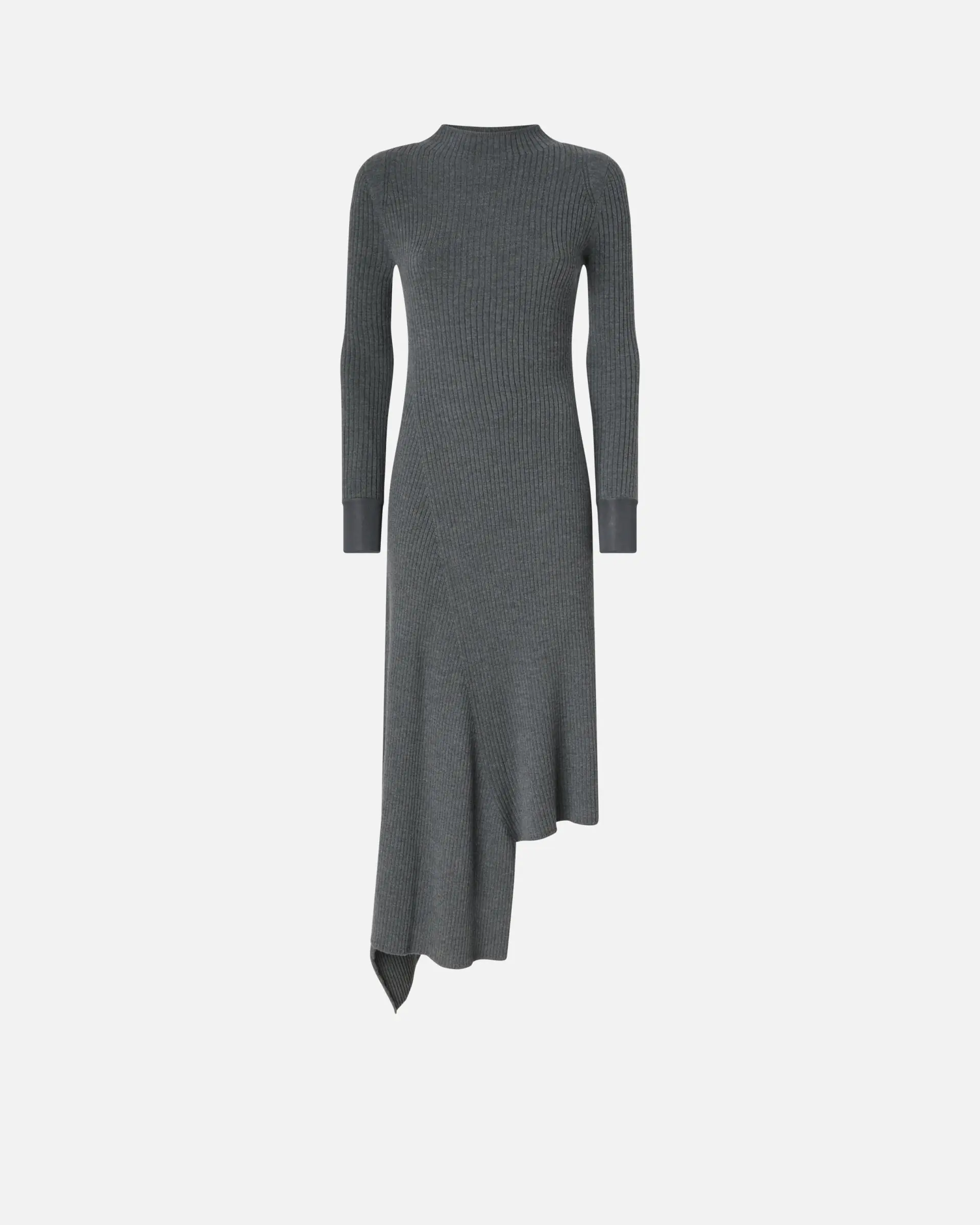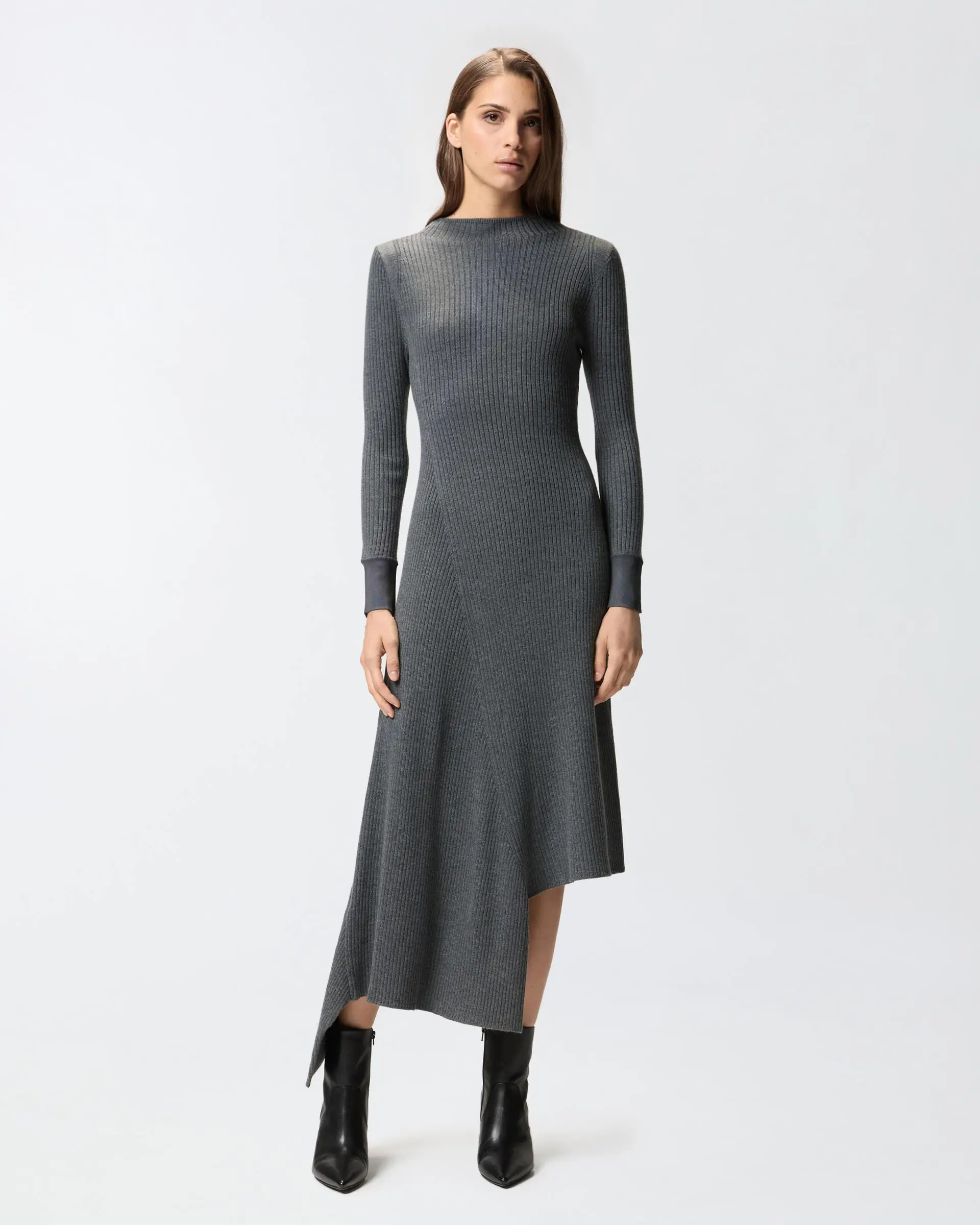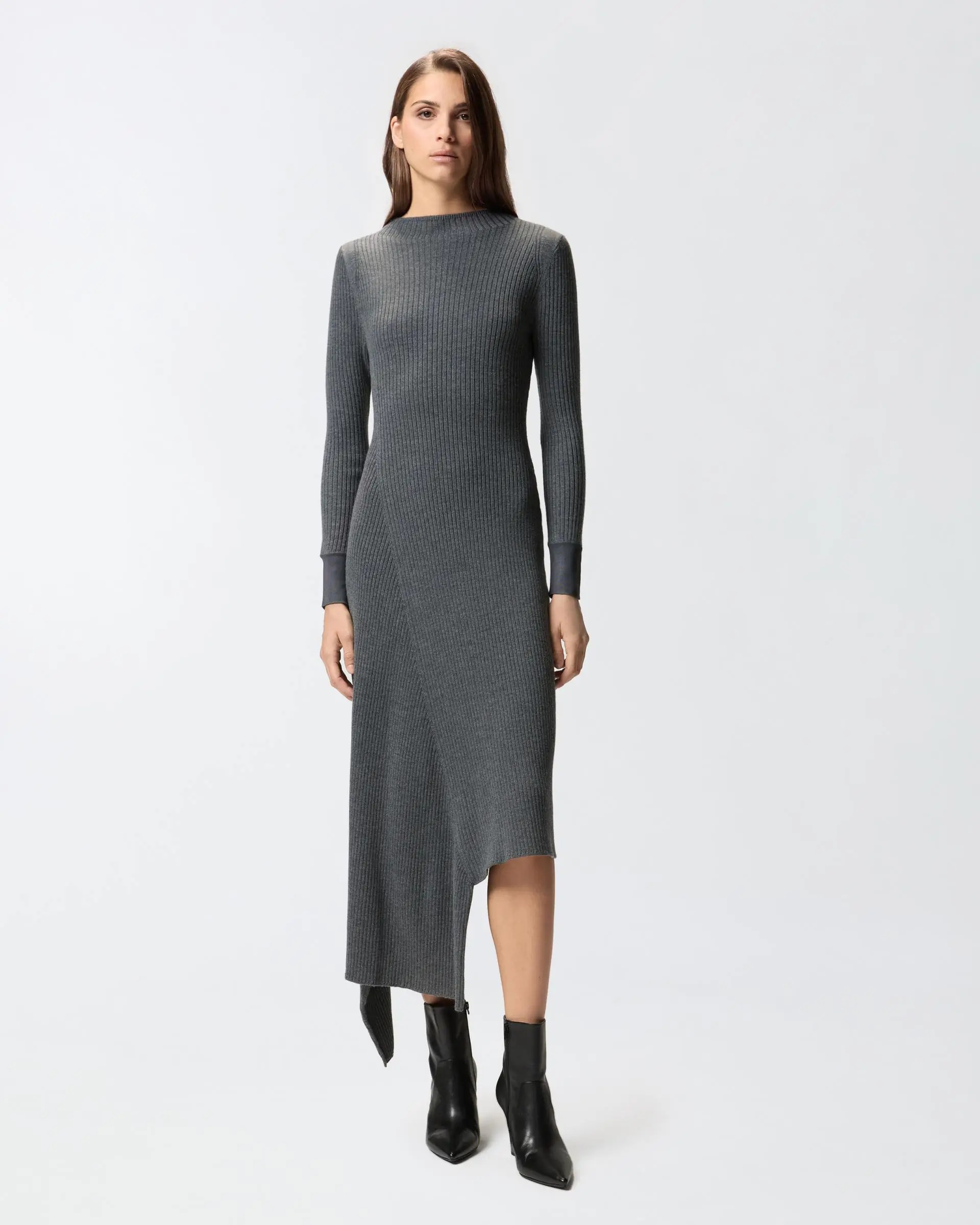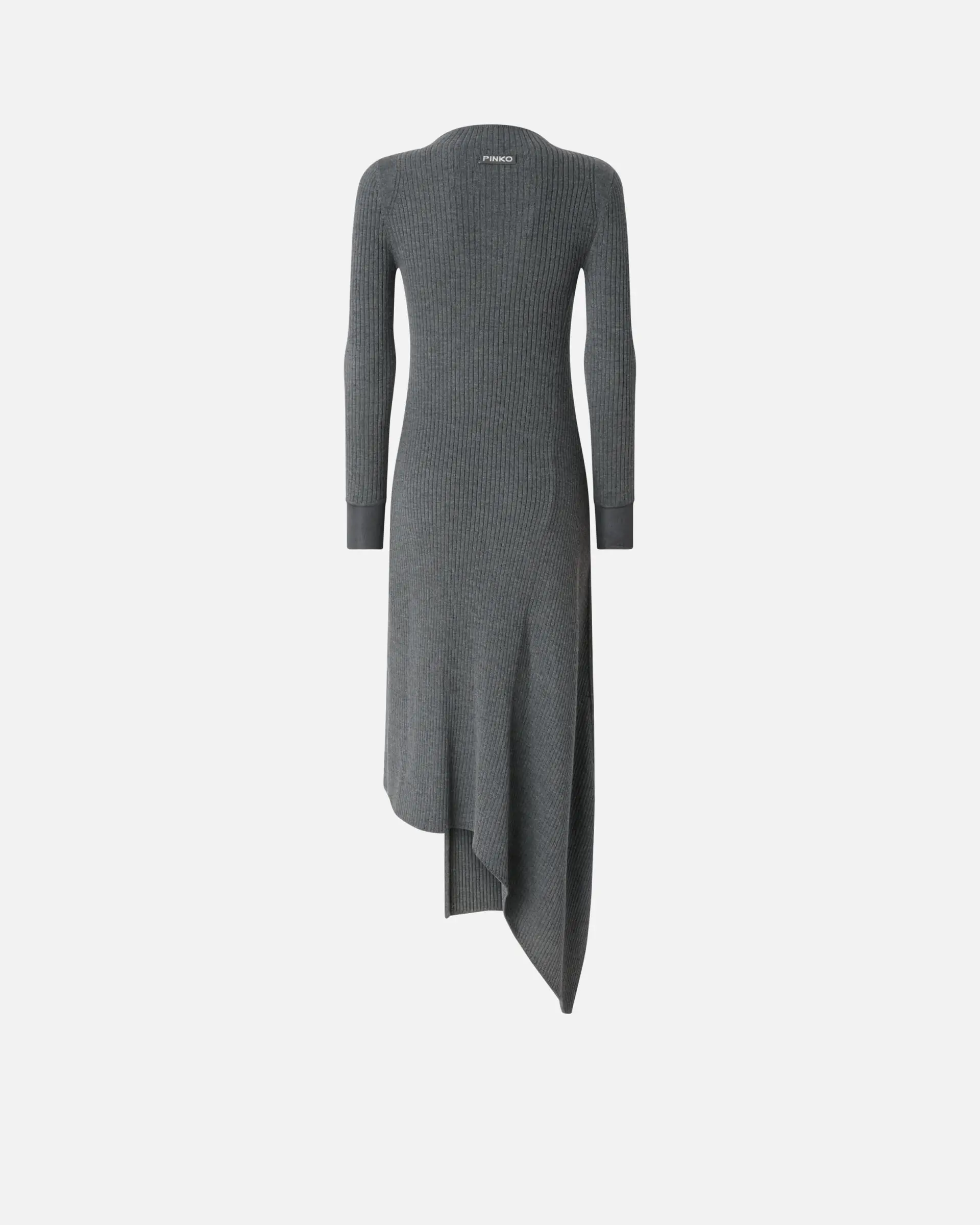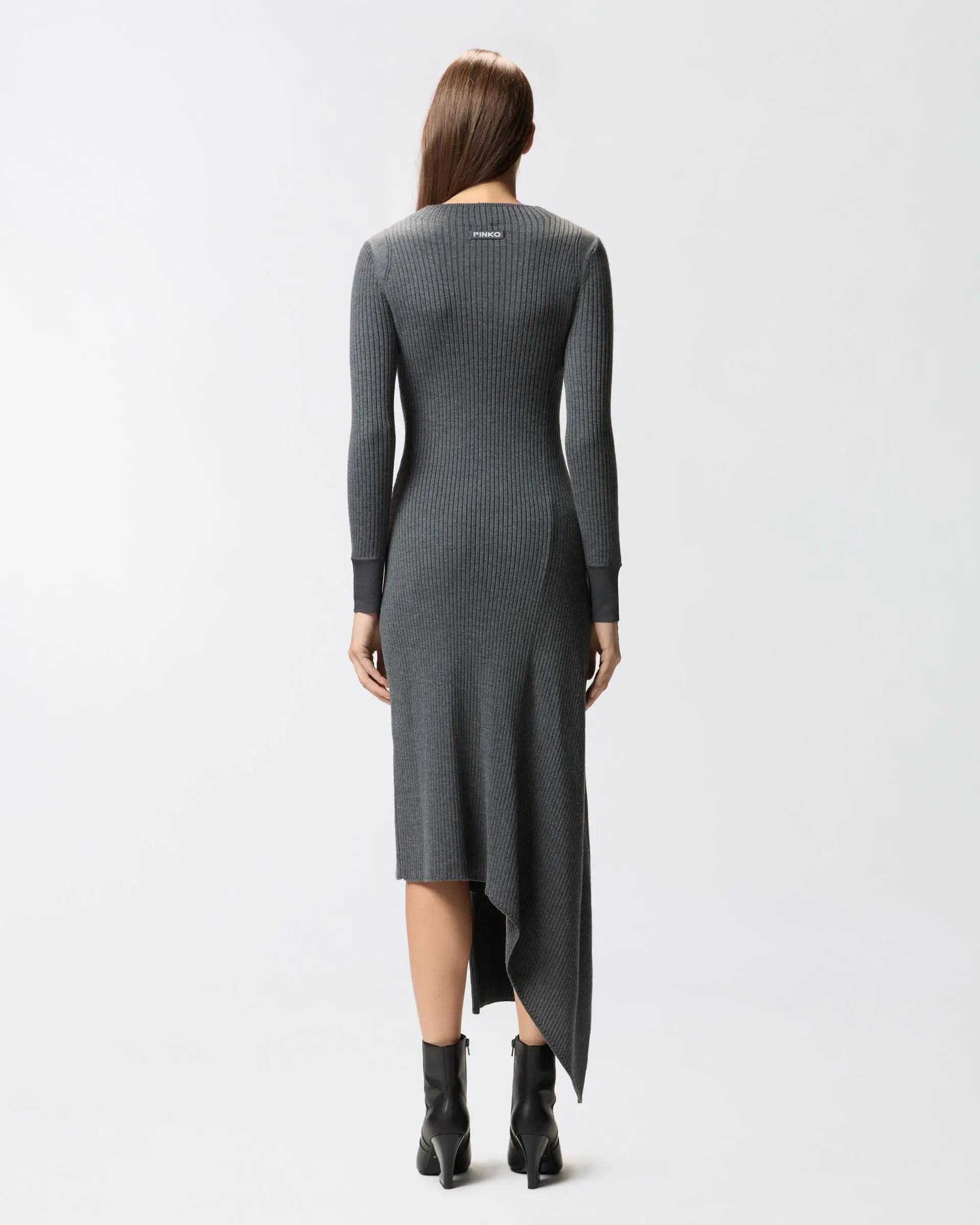 Midi dress made from a wool and viscose knit with flat ribbing. The lightweight, stretchy yarn of the highest quality makes this garment particularly comfortable and versatile. The top with stand-up collar offers a slim fit, while the fluid skirt detail with an asymmetrical cut adds movement to the look: the result is an understated but unexpected design. The final touch is given by the tone-on-tone label with PINKO lettering logo behind the neck. The piece has undergone finishing tests to minimise the possible formation of pilling, ensuring greater fabric softness and durability.