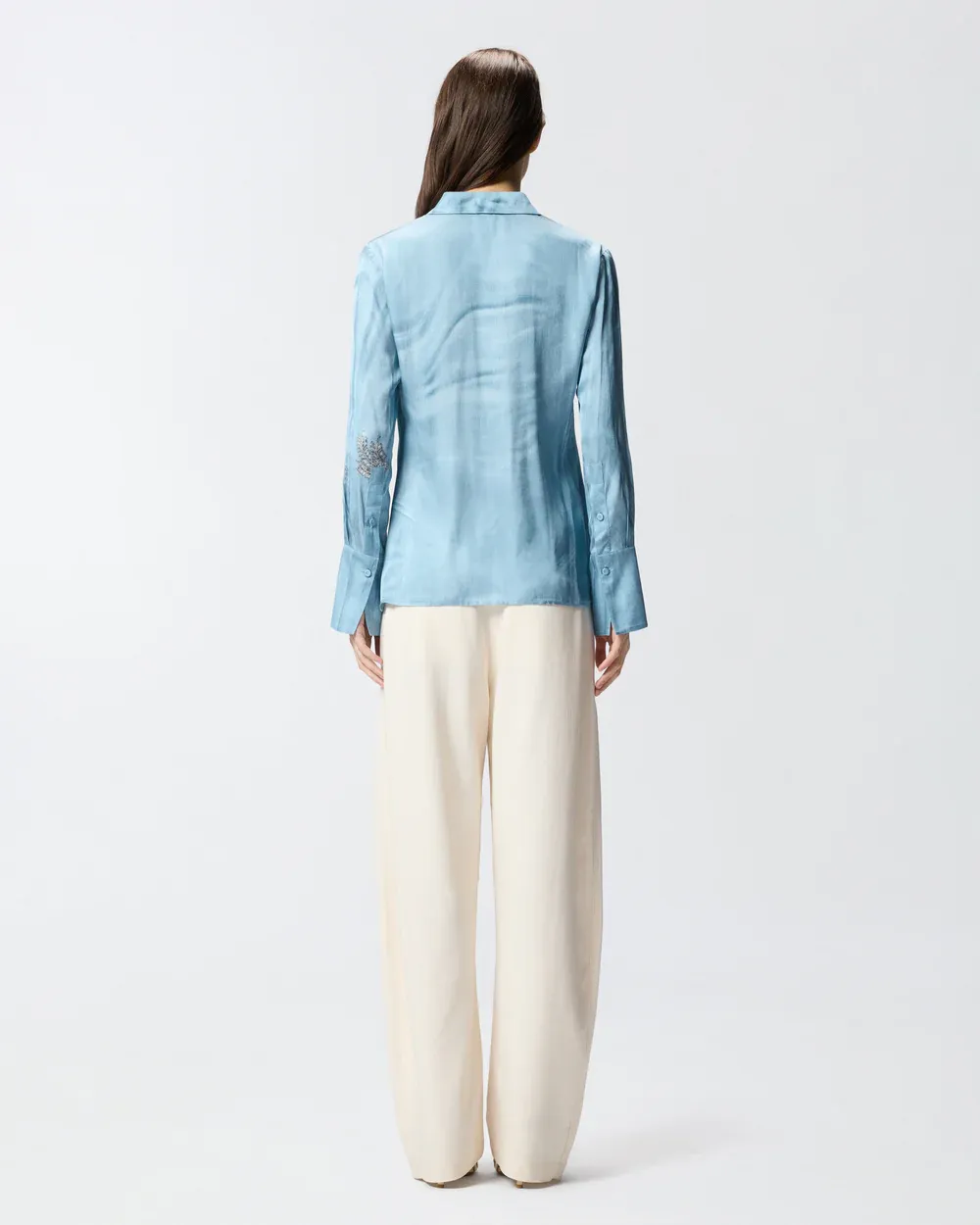 Flowing shirt with classic collar, long sleeves with buttoned long cuffs and fabric-covered button fastening at the front. This model is made from fluid viscose satin featuring a placed, denim-effect trompe-l'œil effect print enhanced by a jewel-brooch motif. Turn your outfit into a work of art and wear this shirt with its matching trousers for an original head-to-toe look that won't go unnoticed. - CHRISTA SHIRT