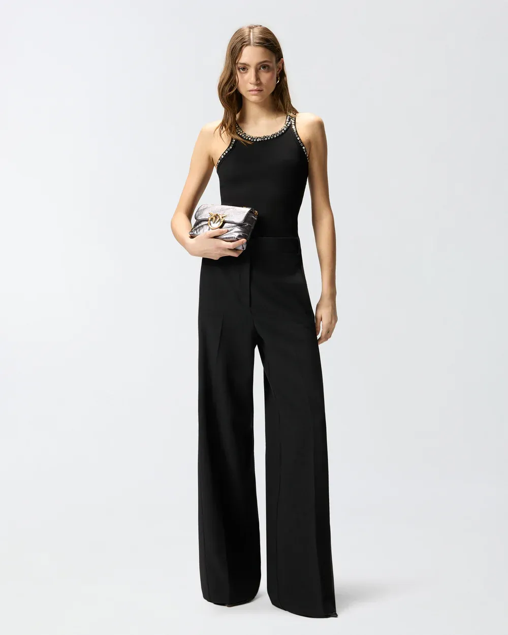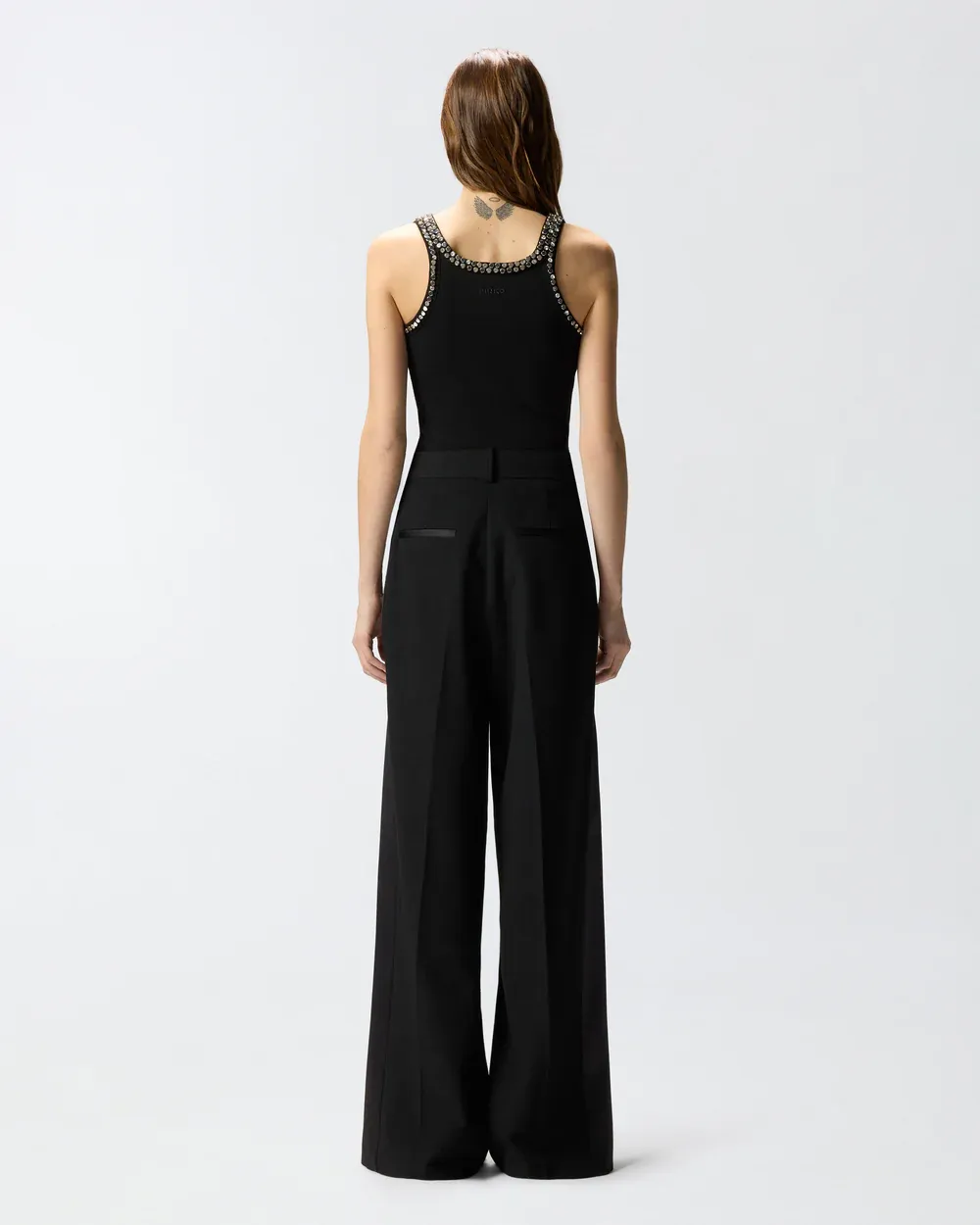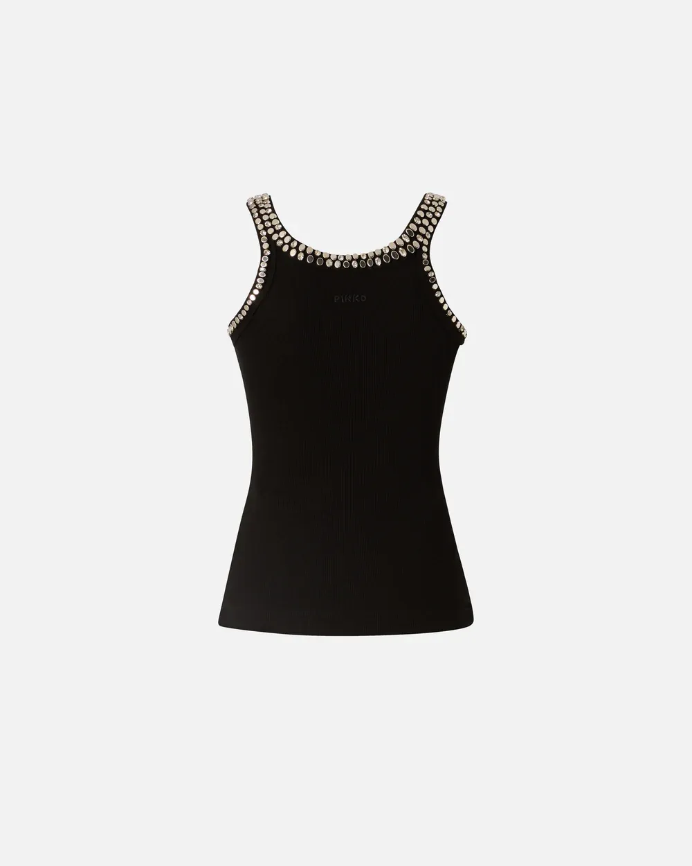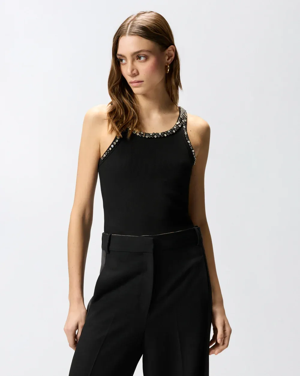 Vest top in ribbed cotton-blend jersey. The front and back necklines and shoulder straps are covered with expertly hand-embroidered crystals and shiny studs that add shimmer and exquisiteness to the garment. Make any outfit extra elegant and feminine with this top, which is perfect to wear under a jacket, paired with either tailored trousers or even a pair of special jeans. - CORIANDOLI TANK TOP