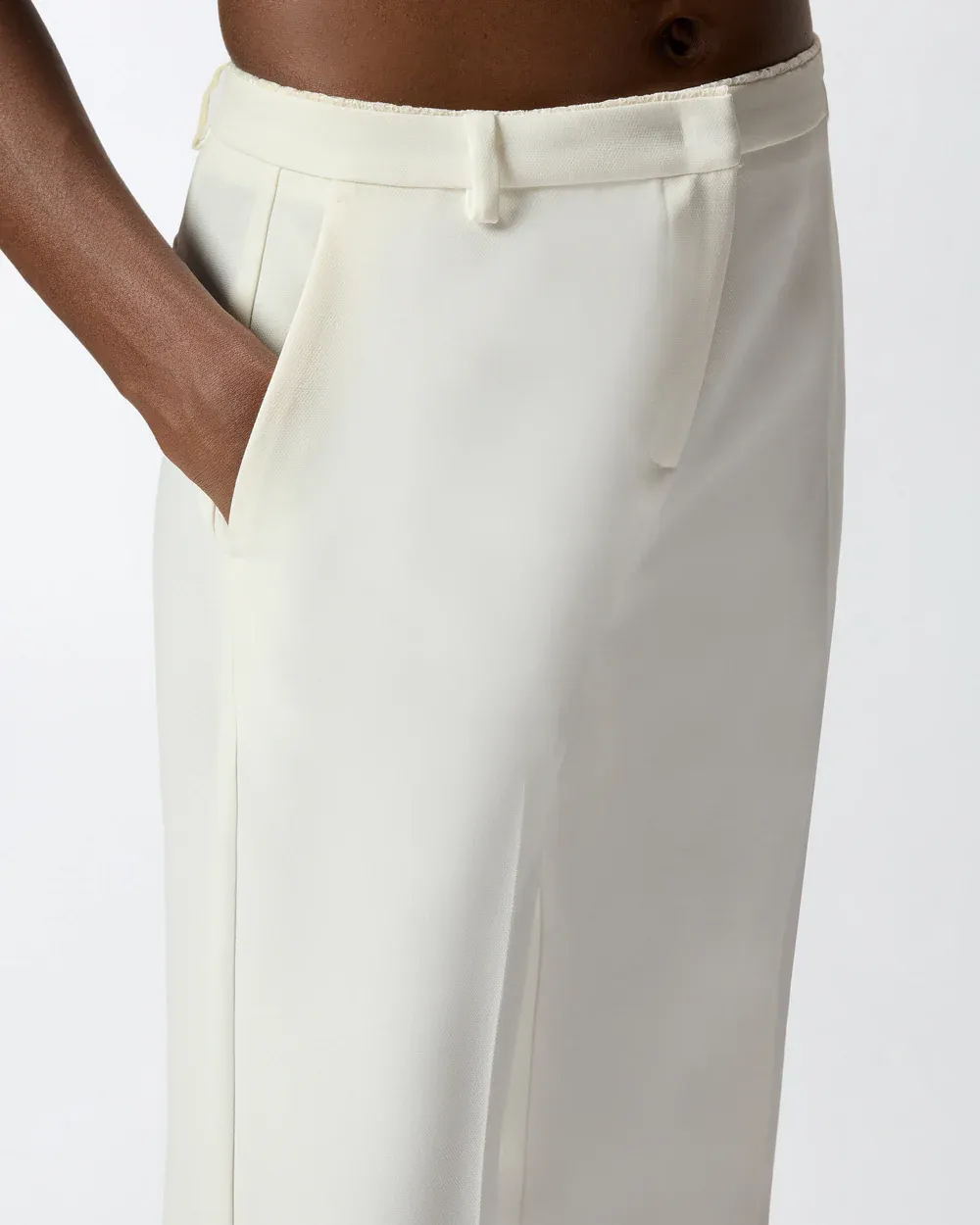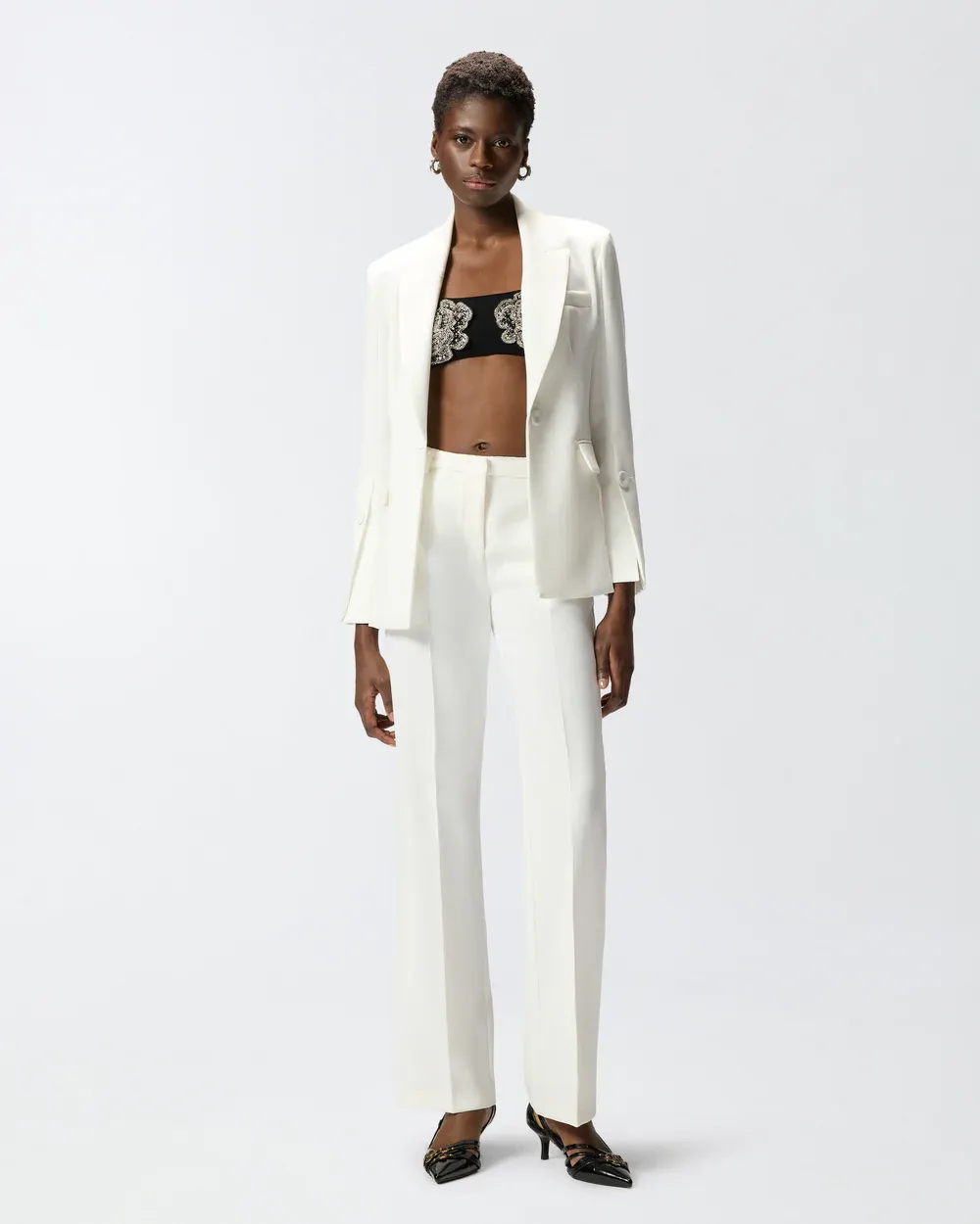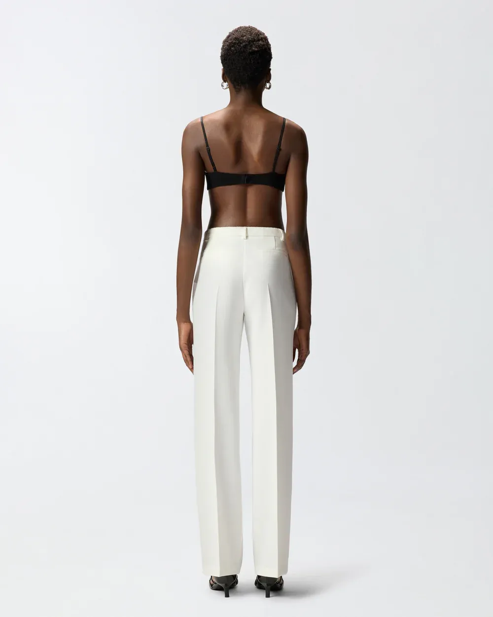 Straight-cut trousers with refined pressed central pleats down the legs and two welt pockets on the back. This garment, lined with lightweight georgette, is made from technical canvas—a comfortable, breathable fabric that provides an irresistible combination of functionality and modern elegance. The hidden front fastening completes the model while keeping the silhouette clean and simple. Pair the trousers with the matching jacket for a refined suit to wear to ceremonies and special occasions. - EUCALIPTO TROUSERS