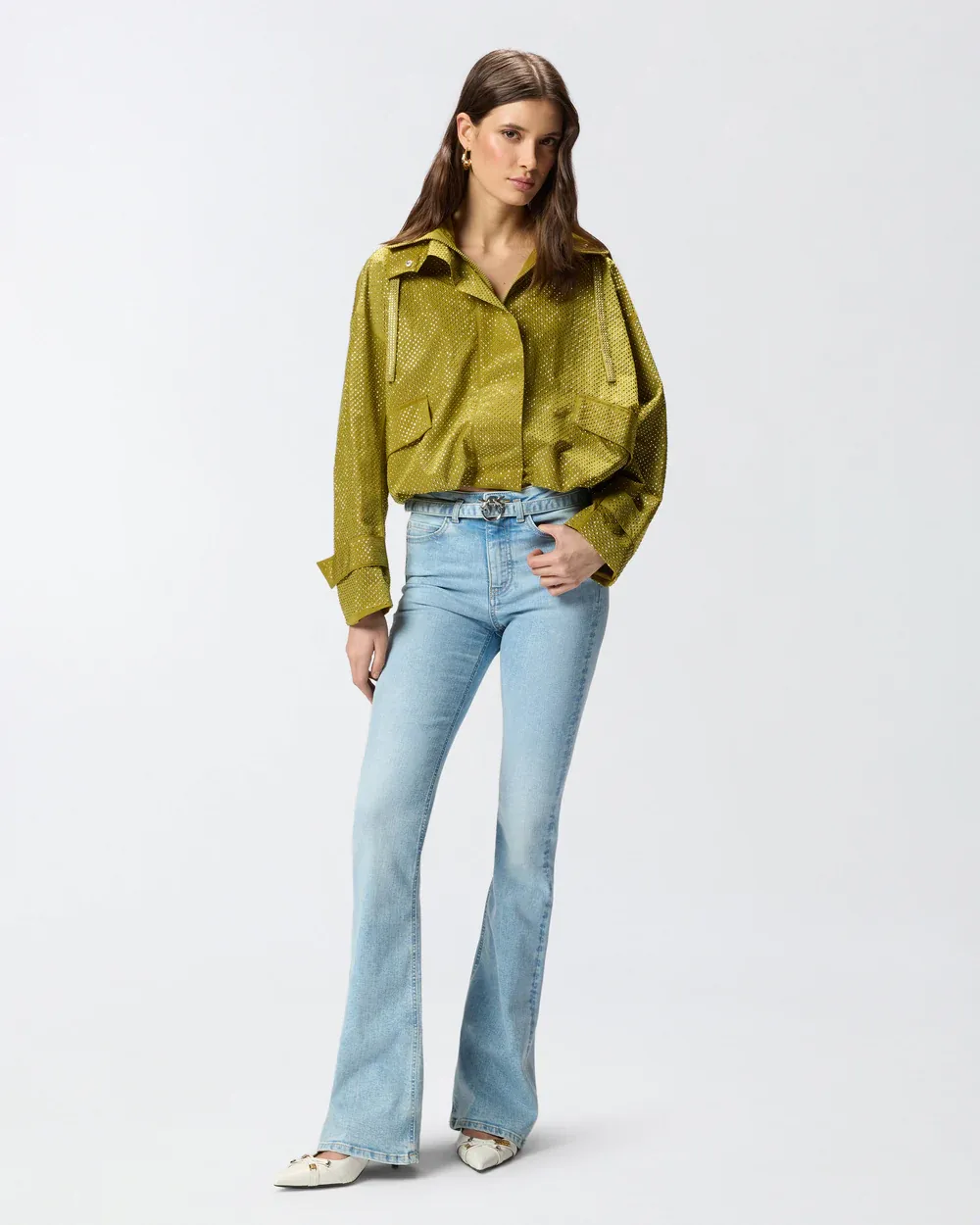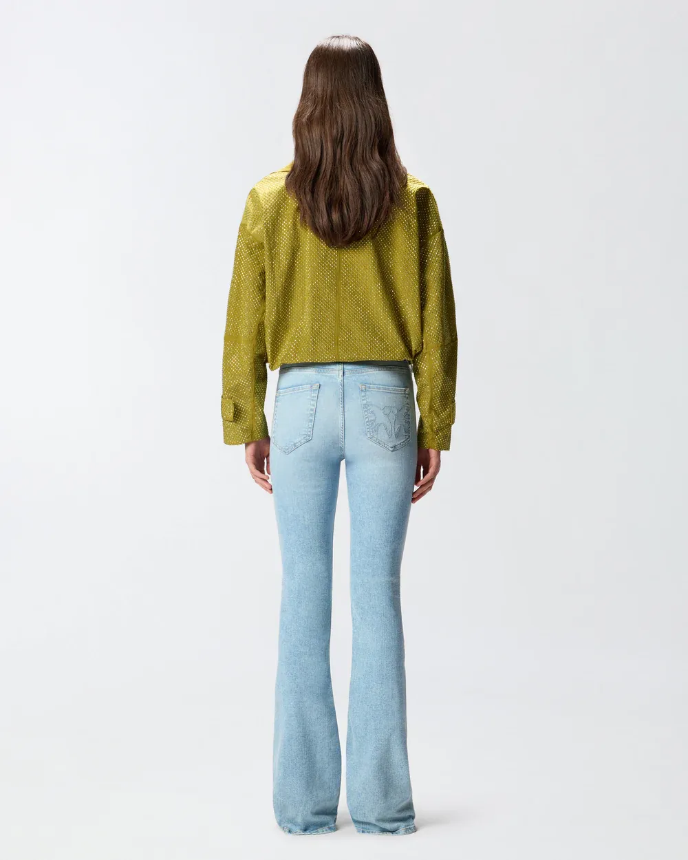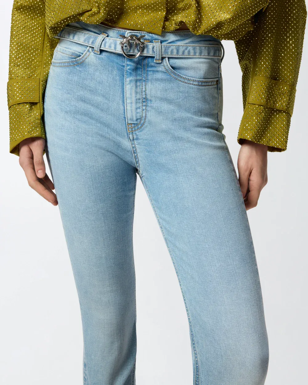 Flared five-pocket jeans with legs that are slim-fitting down to the knee and flared at the bottom, made from cotton-blend power stretch denim with soft feel and light wash. The brand's logo lettering embroidered on the back of the waistband and the Love Birds logo with embroidered birds on the right back pocket add pure PINKO style to the design. Complete with a matching-fabric belt with the metal Love Birds Diamond Cut buckle. - FLORA FLARE