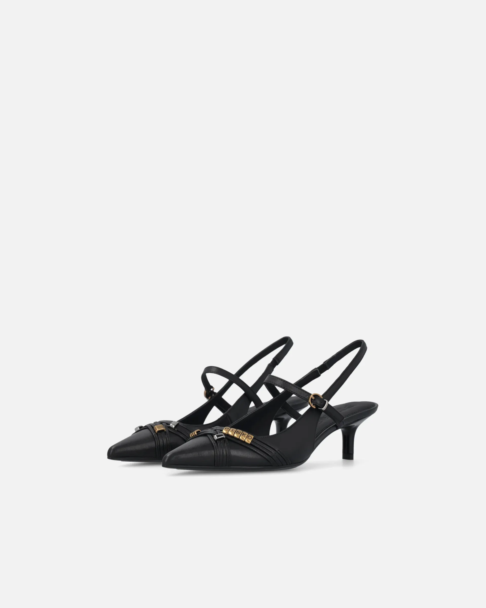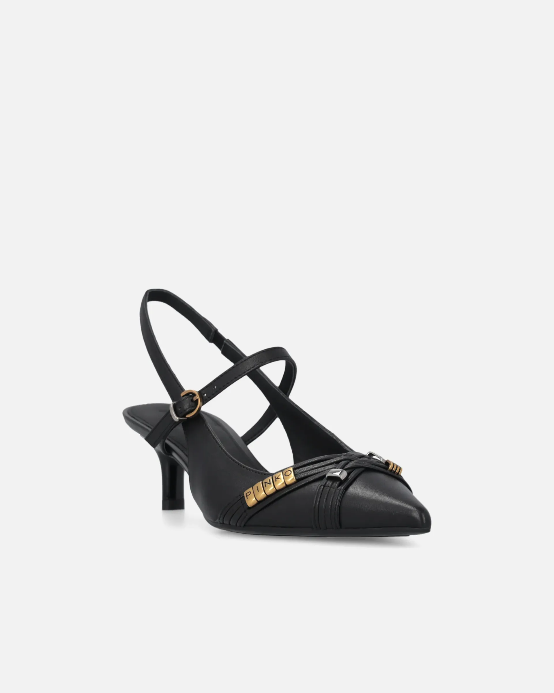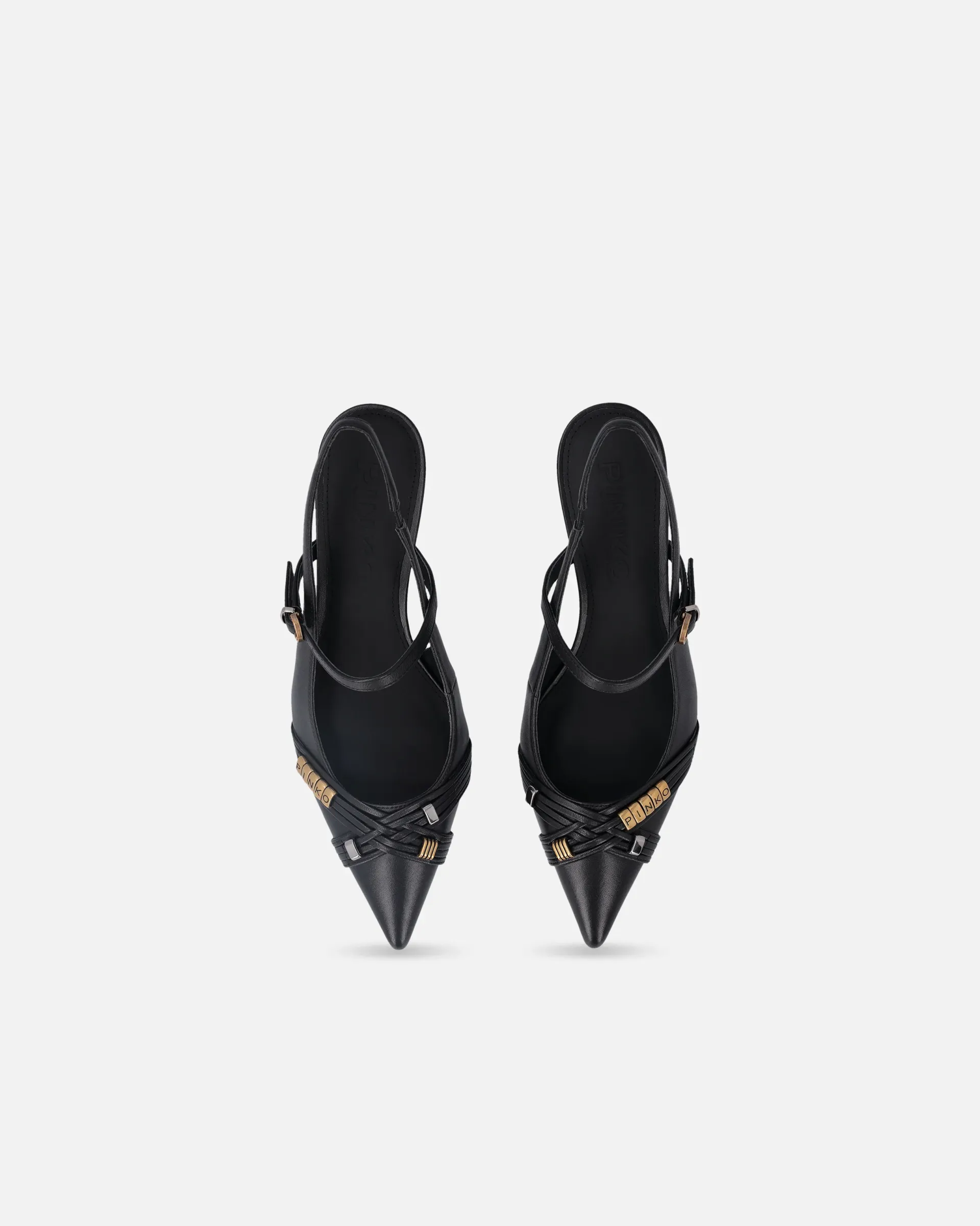 Slingbacks in soft nappa leather with low heel and a sophisticated, contemporary vibe. The tapered design with a pointed toe is accentuated by slender straps that delicately criss-cross over the foot, providing support and a touch of sensuality. The straps are enhanced with precious metal details, including gold rings arranged to form the conical PINKO logo lettering. A versatile style, ideal for formal looks, elegant evenings or to elevate a casual outfit with a bold, glamorous touch.