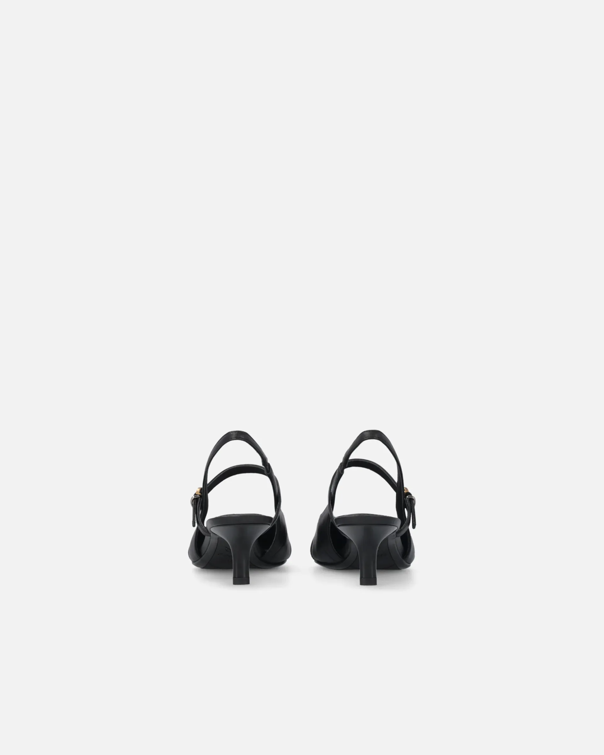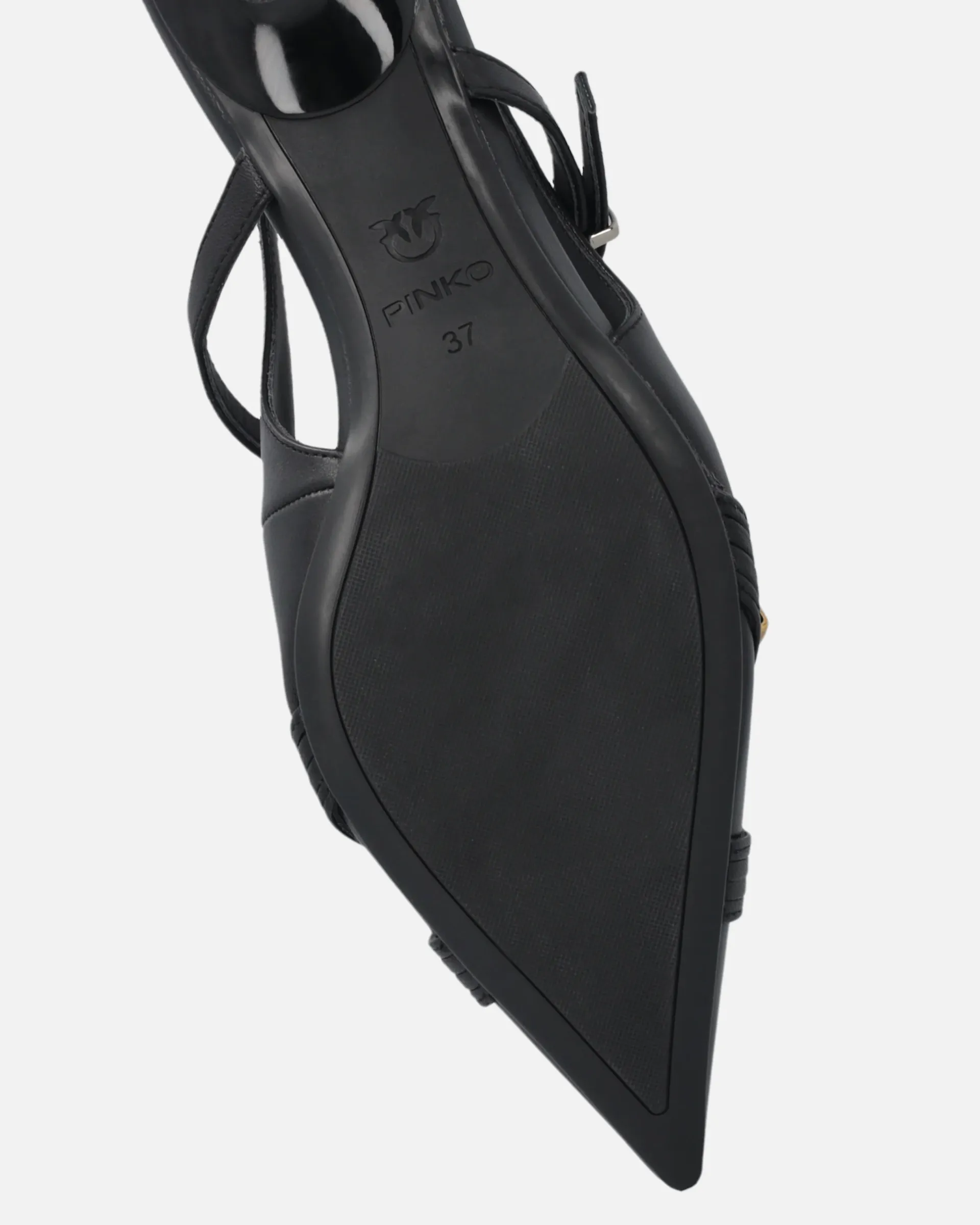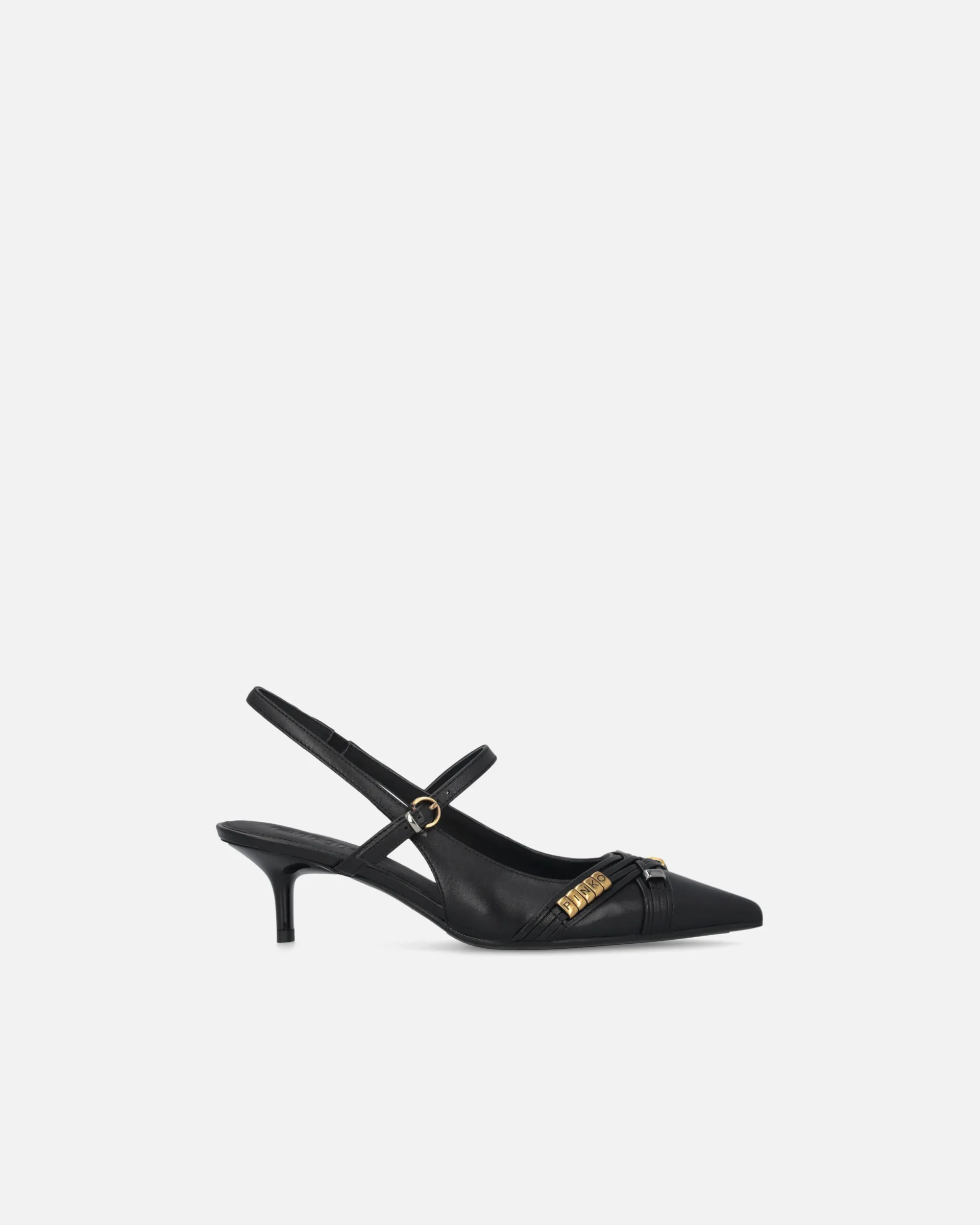 Slingbacks in soft nappa leather with low heel and a sophisticated, contemporary vibe. The tapered design with a pointed toe is accentuated by slender straps that delicately criss-cross over the foot, providing support and a touch of sensuality. The straps are enhanced with precious metal details, including gold rings arranged to form the conical PINKO logo lettering. A versatile style, ideal for formal looks, elegant evenings or to elevate a casual outfit with a bold, glamorous touch.