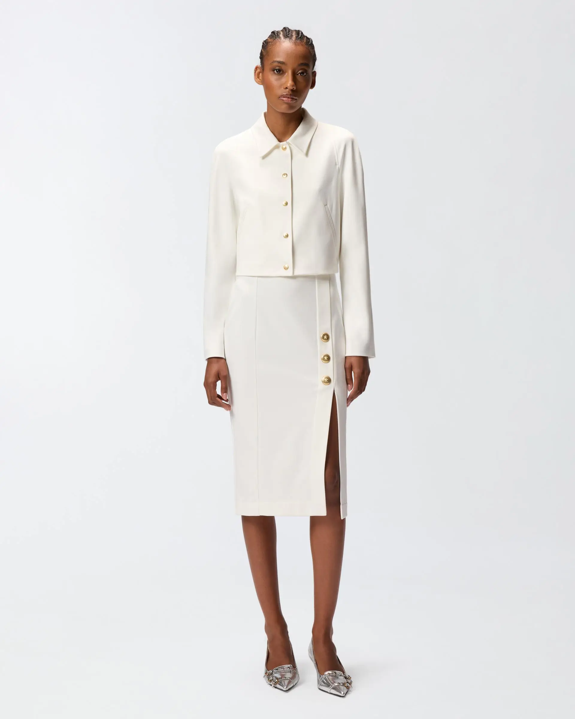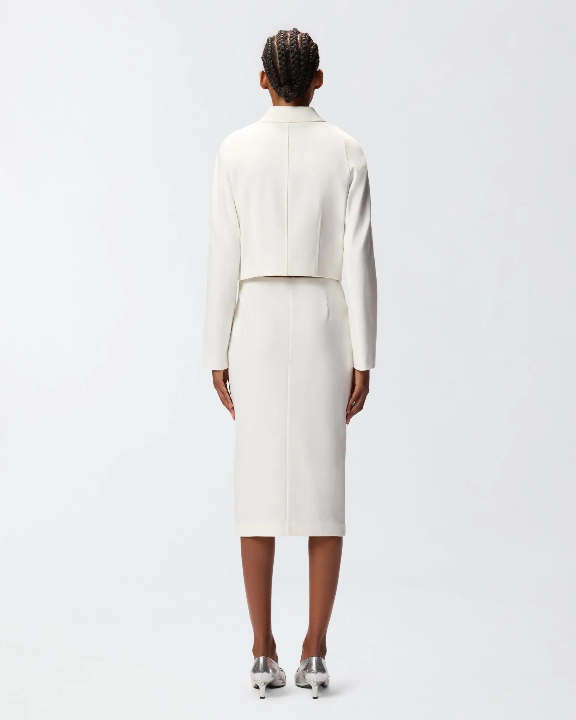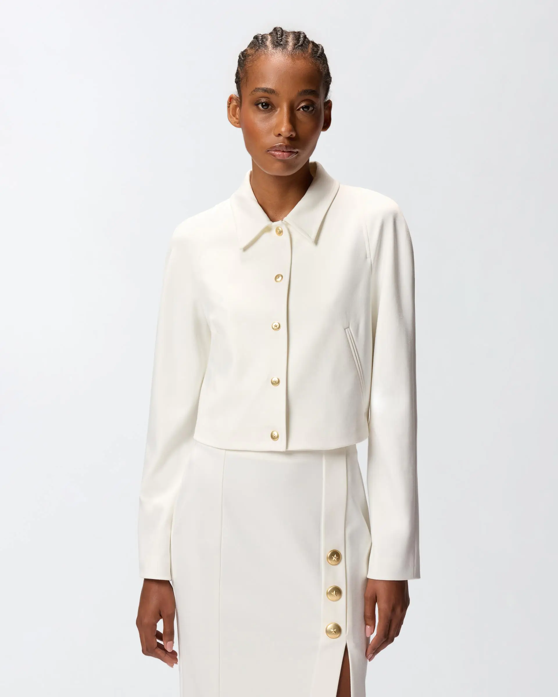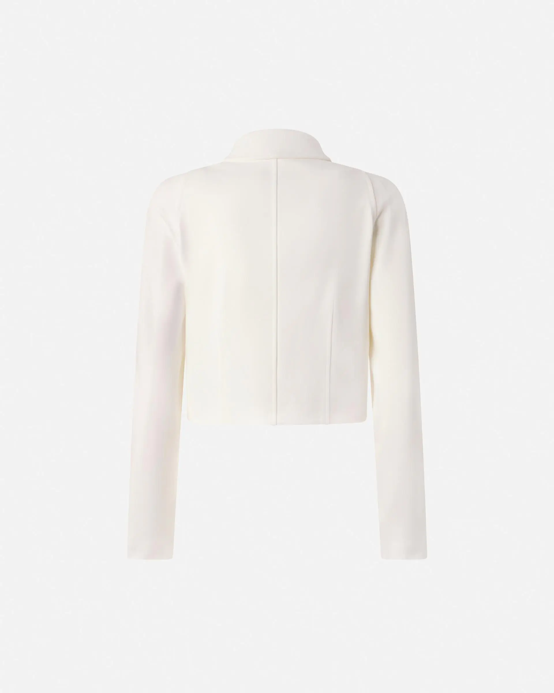 Short jacket with a straight hem and classic shirt collar made from full Milano-knit technical fabric. This style comes in a slim fit and features a design with long sleeves and no pockets for a minimalist style that has not sacrificed feminine details. This piece is the perfect solution when you are searching for a refined and effortless look, with an extra elegant touch.