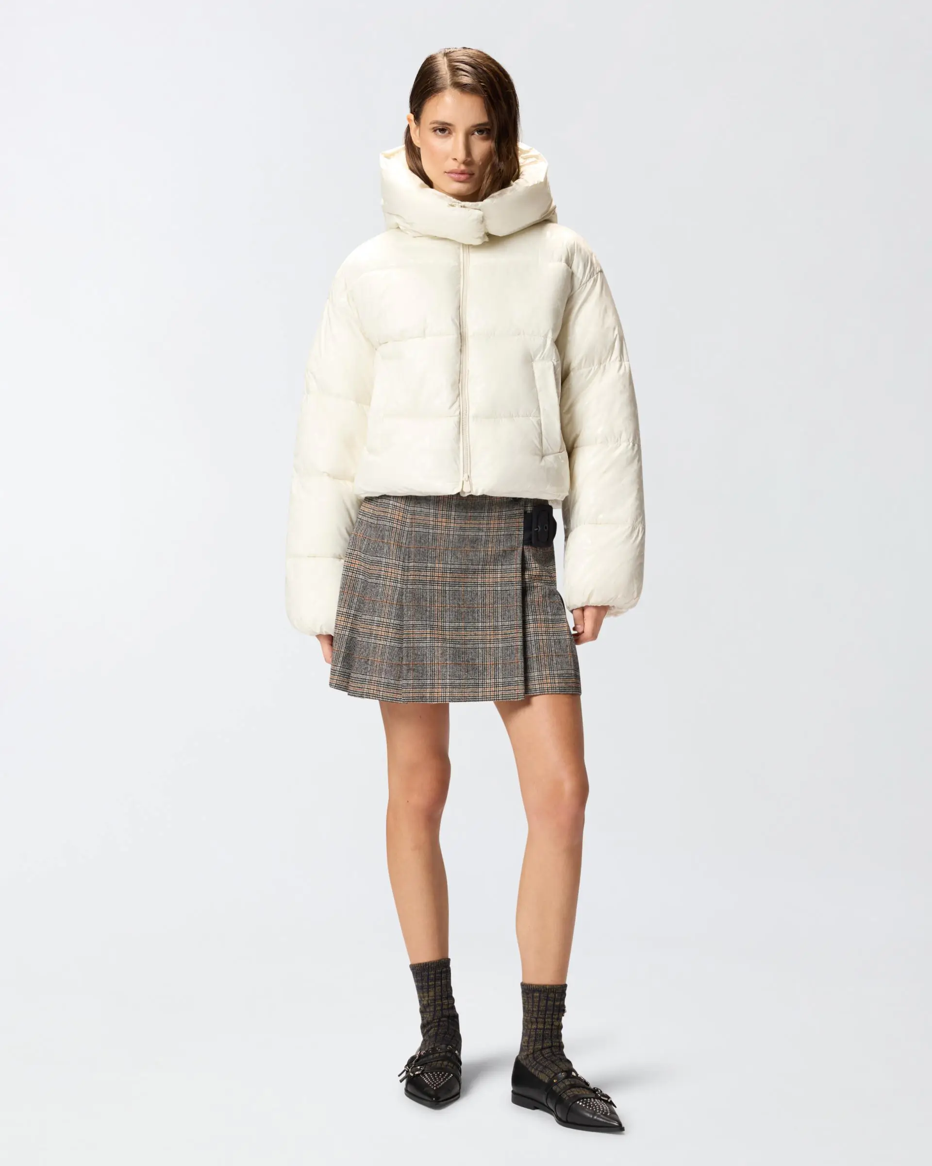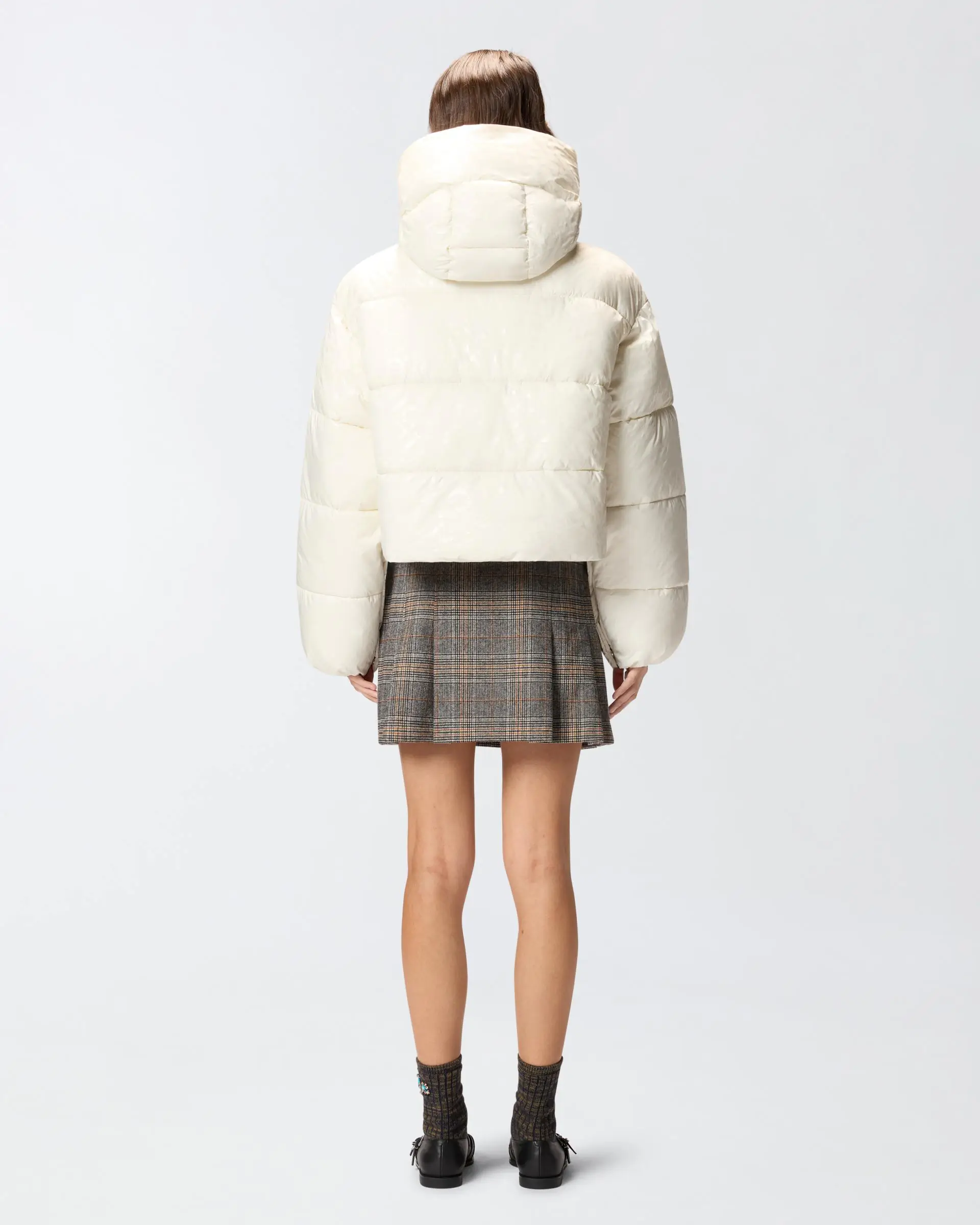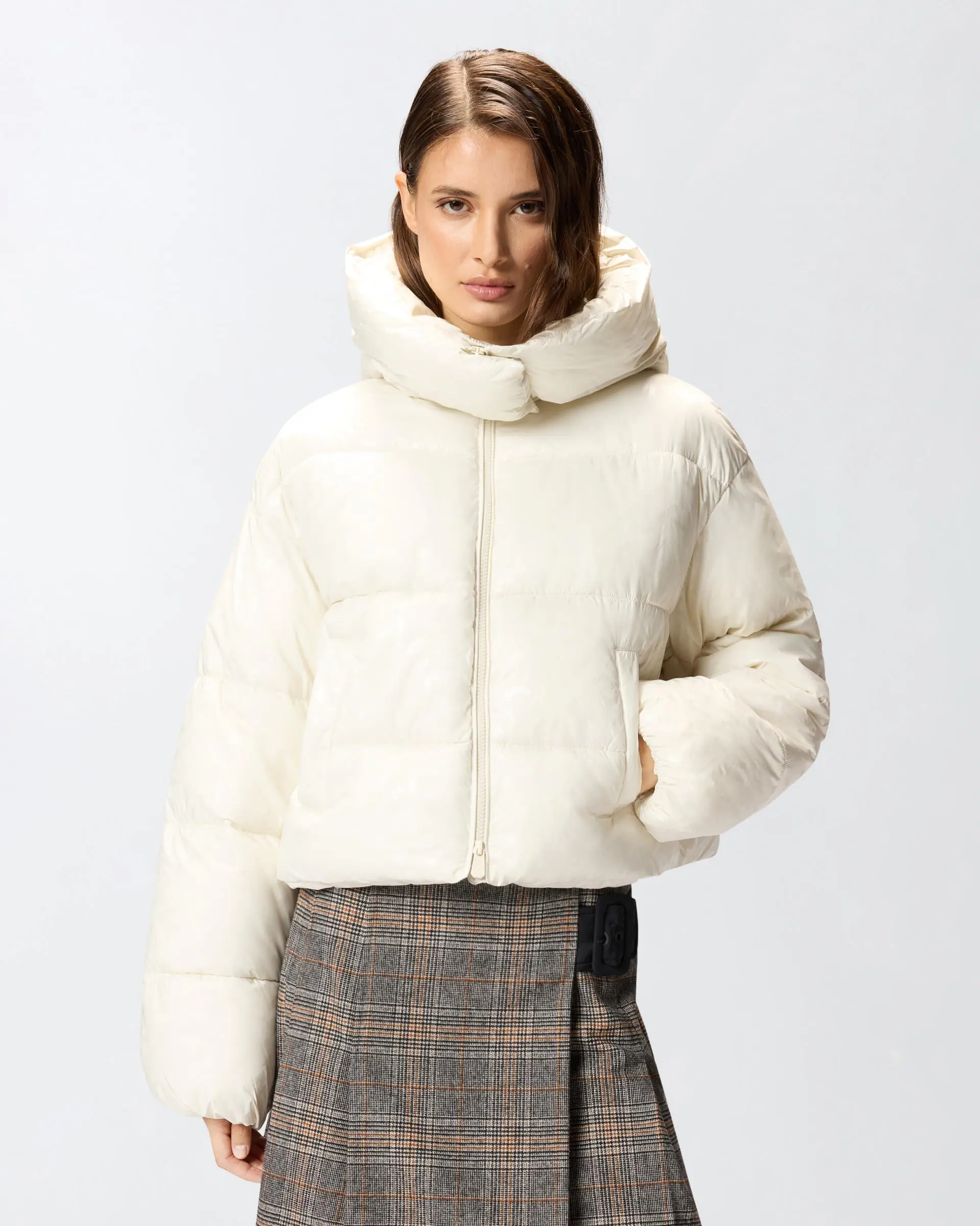 Cropped padded down jacket, made from technical canvas with horizontal quilting and customised with the all-over PINKO lettering logo print with a distinctive glossy effect. The style features a wide, cosy hood and comfortable welt pockets. Two-way zip fastening on the front. The cropped cut of the puffer jacket makes it the perfect everyday outerwear to tackle the first cold days of the season.