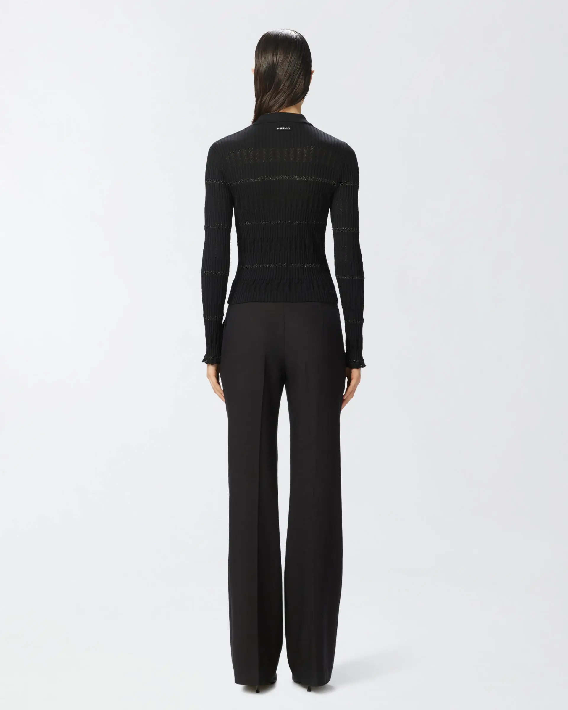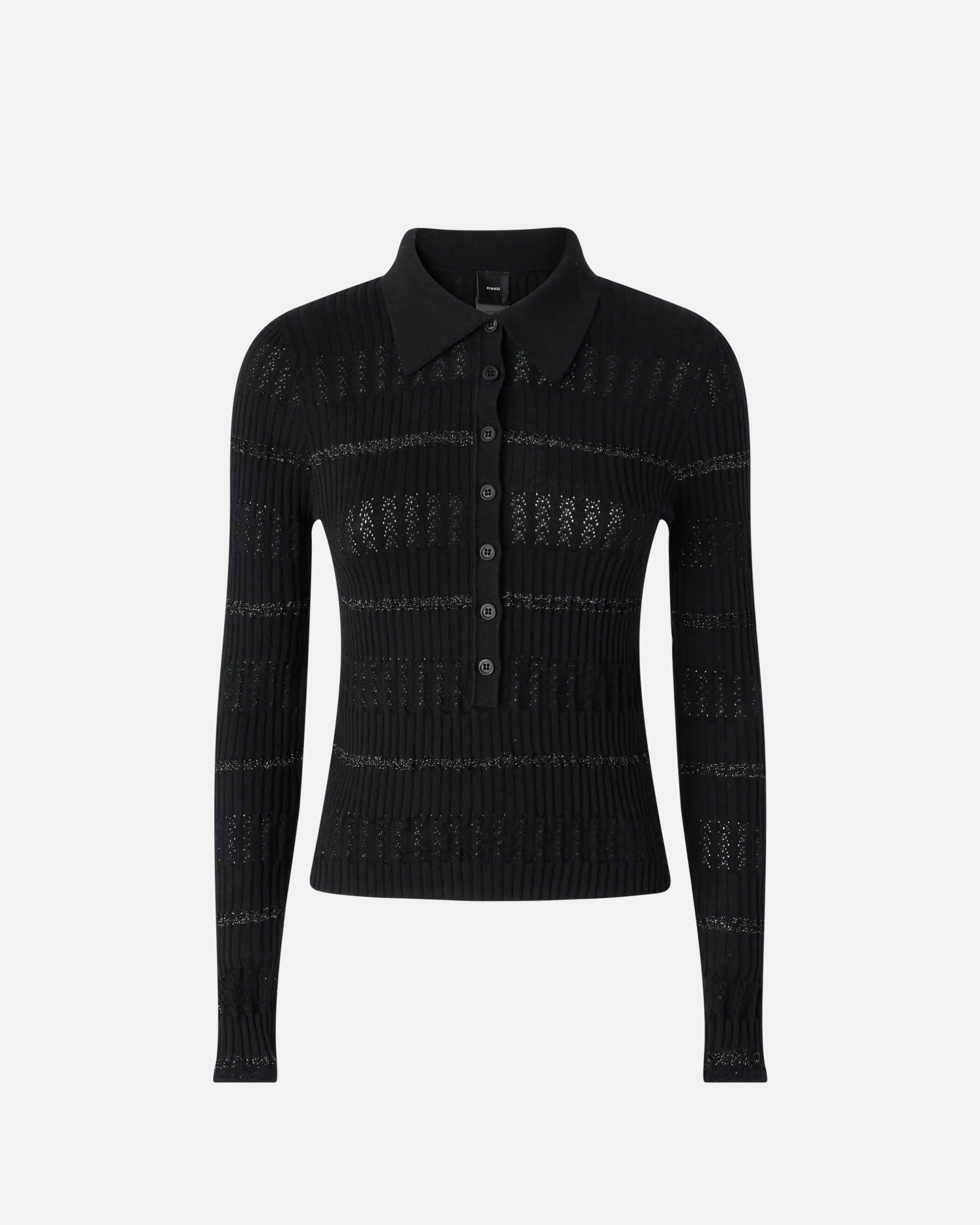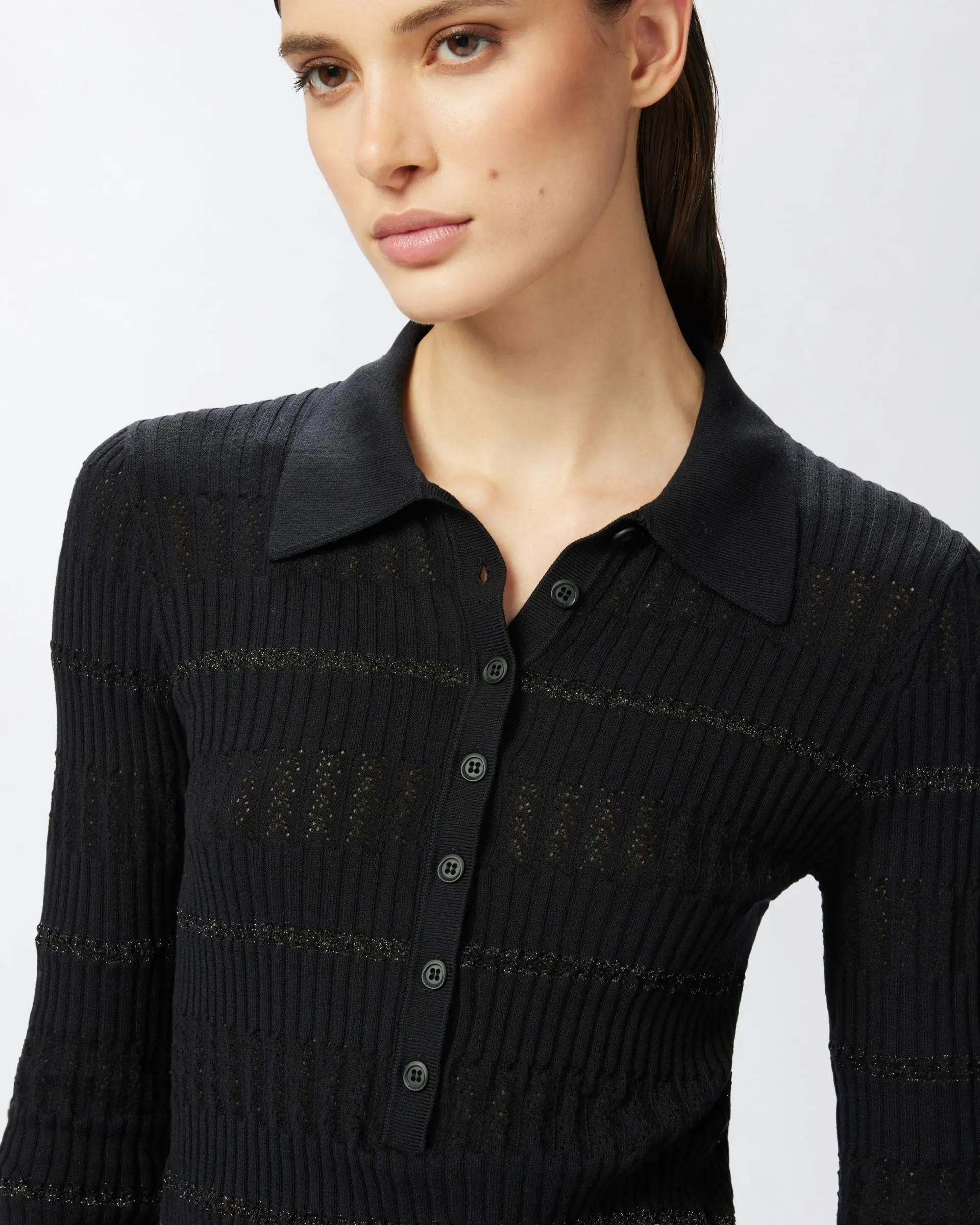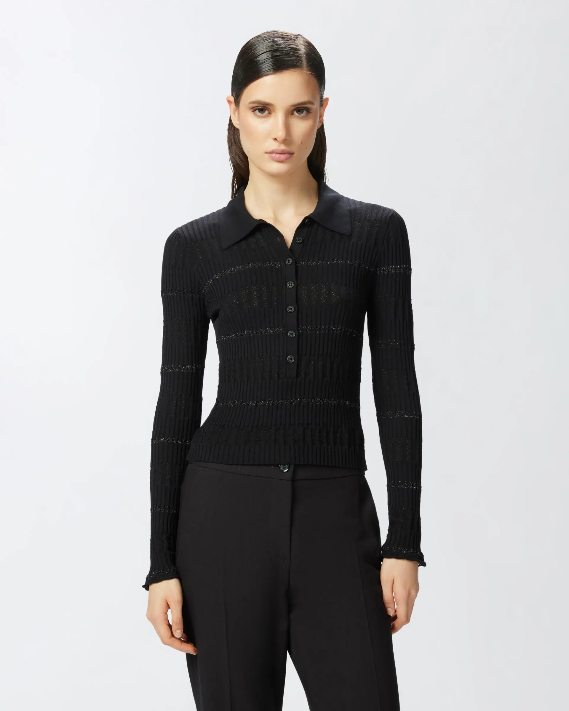 Long-sleeved polo shirt in a fine cotton and silk blend, rib-knit with a punched pattern that adds a feminine detail, and a horizontal striped pattern with metallic thread for a sparkling and original touch. This fitted polo shirt is completed by a logo label on the back of the neck.
