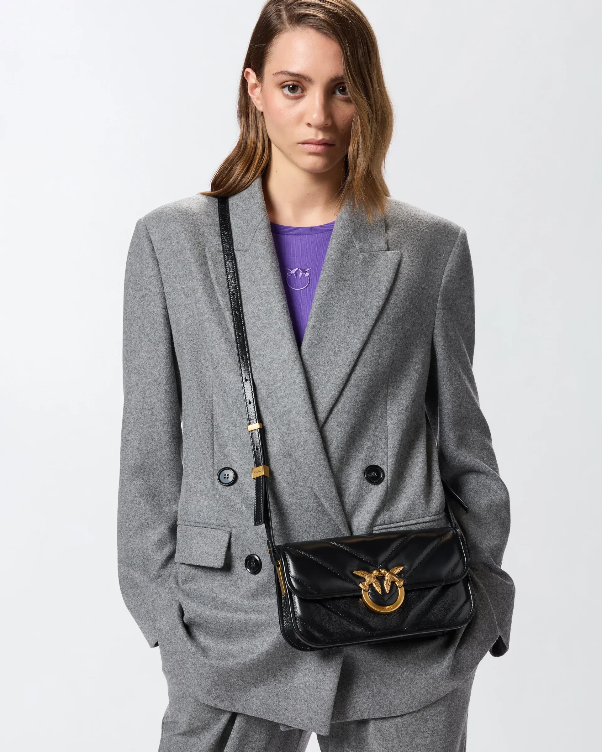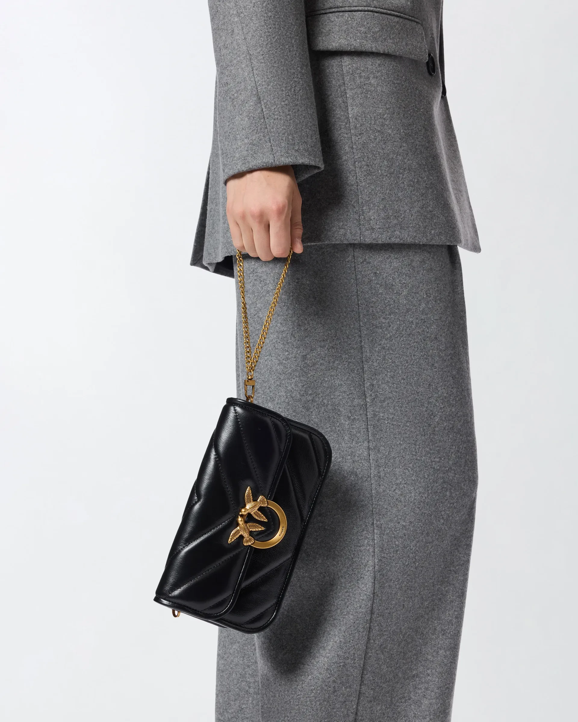 Large Love Bag Box handbag in shiny leather with chevron quilting and an elongated rectangular shape. Featuring an adjustable leather shoulder strap for shoulder or crossbody wear and a removable side chain handle for carrying by hand, this bag is extremely versatile and refined. The flap closure is completed by the timeless Love Birds Diamond Cut logo buckle. The interior is lined in cotton drill fabric and includes a zippered wall pocket. Activate your PINKO bag: verify the authenticity of your product and access the personalized experience by holding your smartphone close to the Love Birds embroidery on the back of the bag!