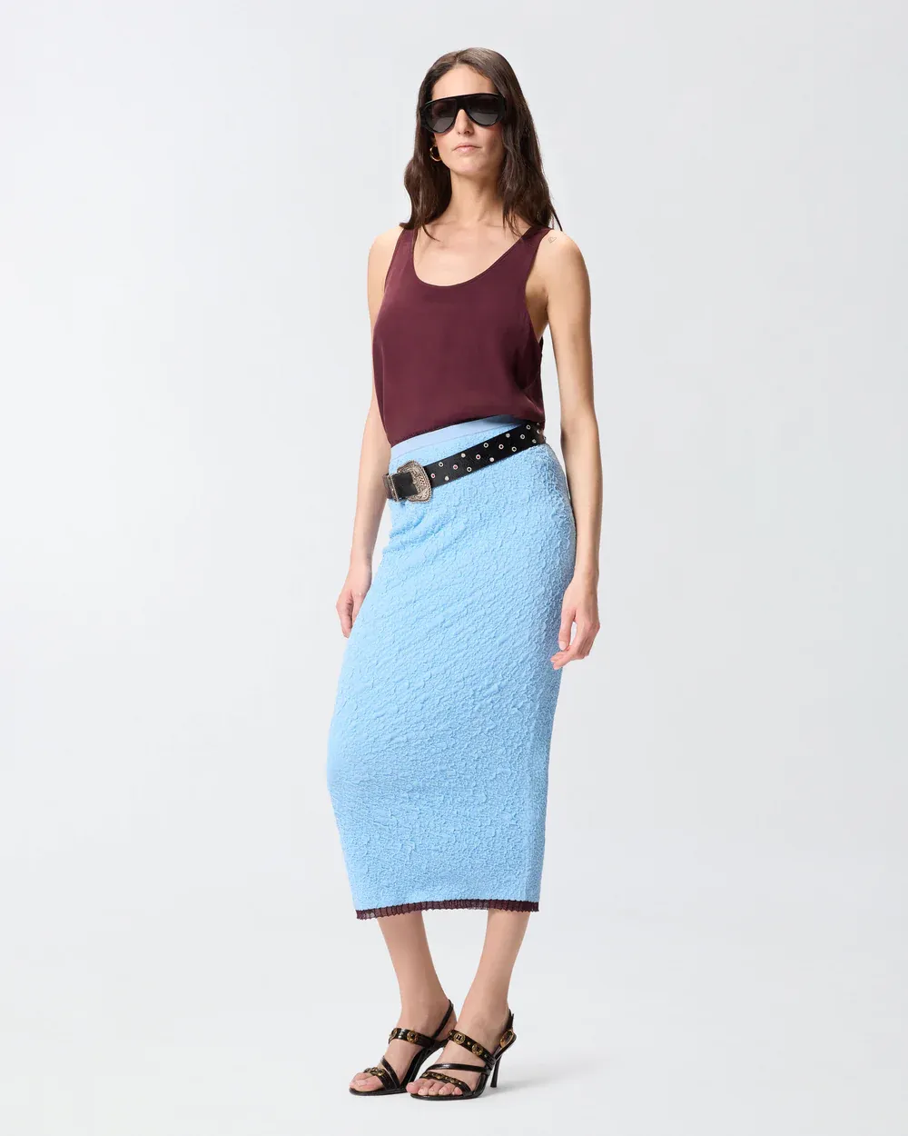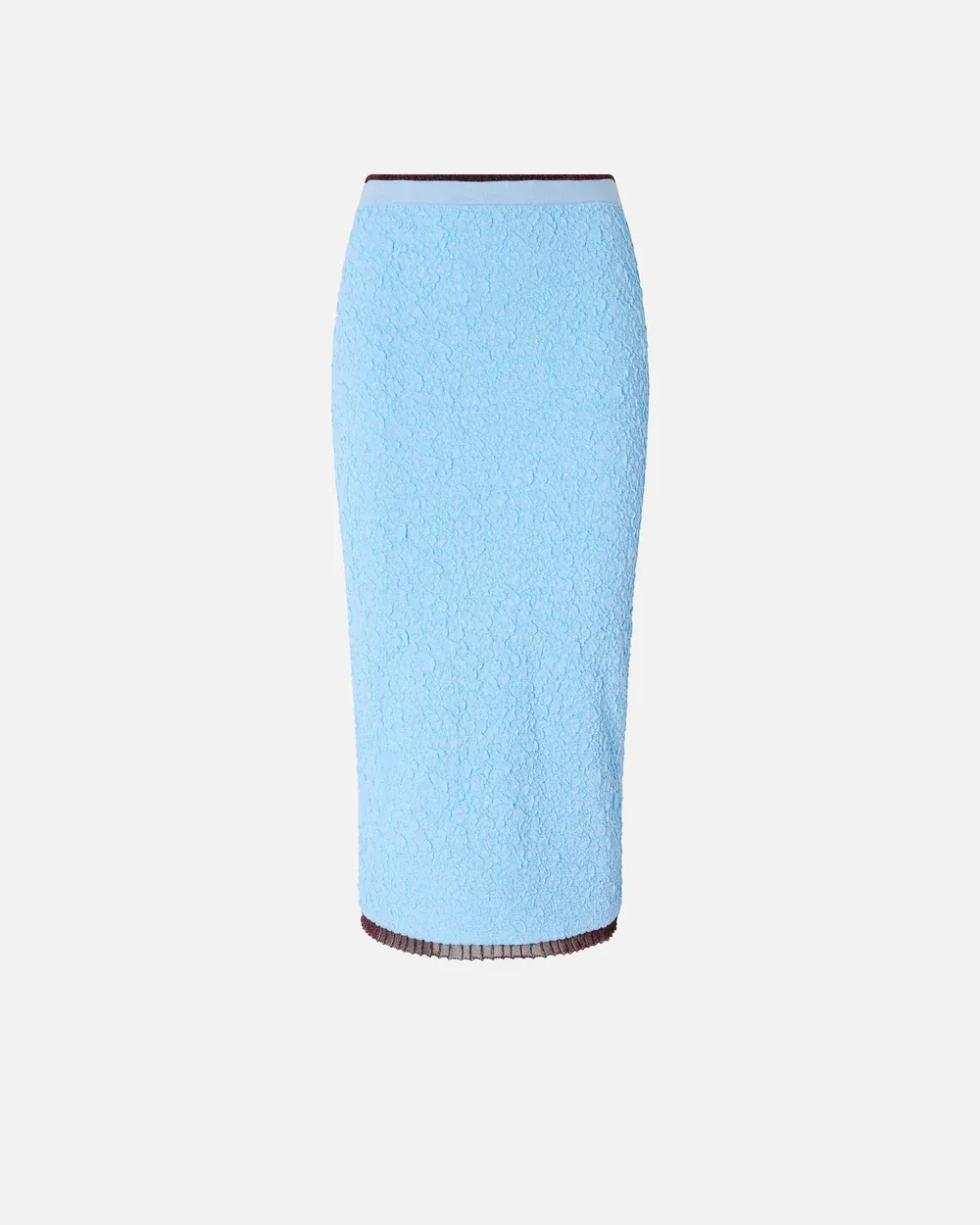 Slim-fit midi skirt with a convenient ribbed waistband that makes it even more comfortable to wear. Made from stretch viscose double Milano-knit fabric, the garment plays with texture and depth, thanks to the richness of the exterior pattern: a dense jacquard design with an embossed effect, paired with contrasting shiny trims at the top and bottom edges. The style, further customised with a PINKO logo label at the back, is perfect for creating dynamic, contemporary outfits: pair it with the matching cardigan for a summer total look that won't go unnoticed. - LUNA SKIRT