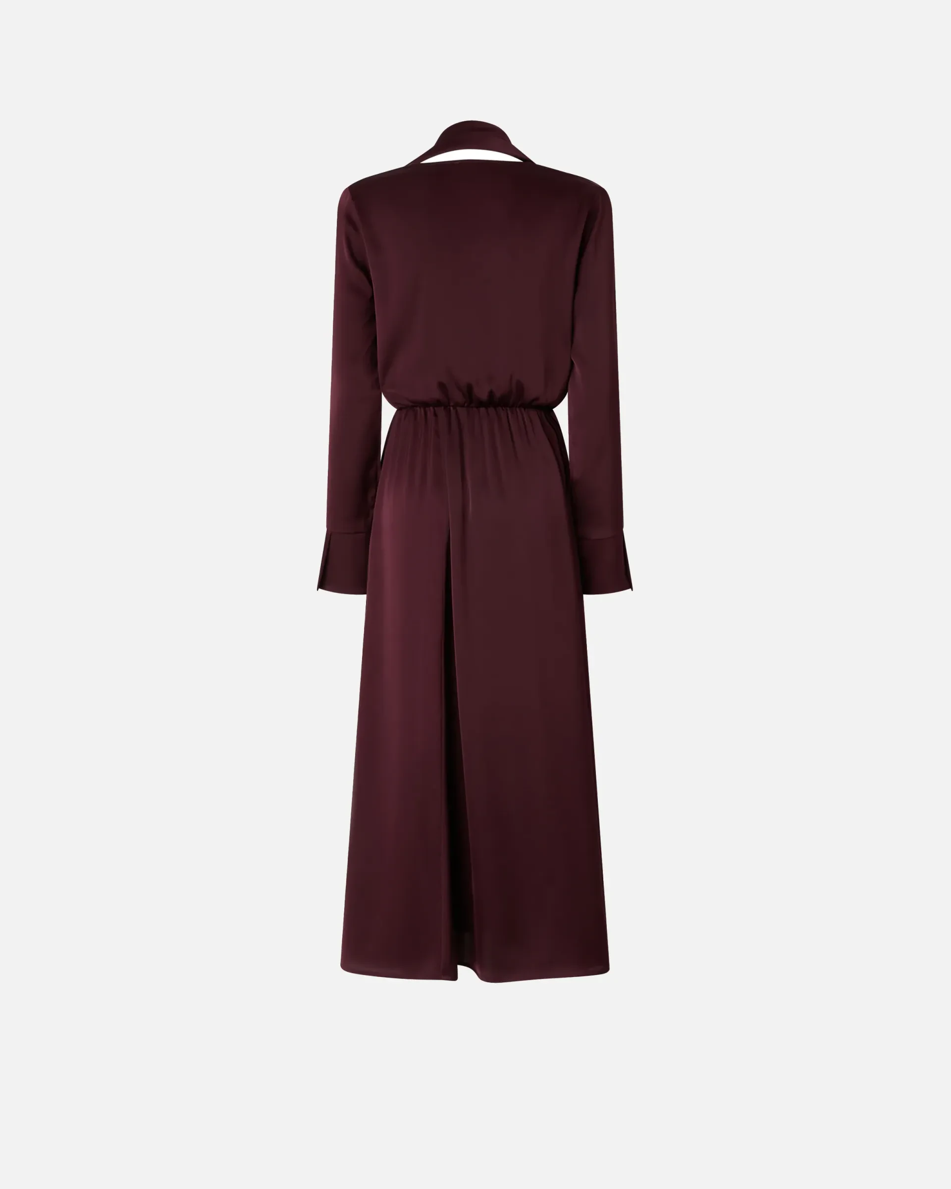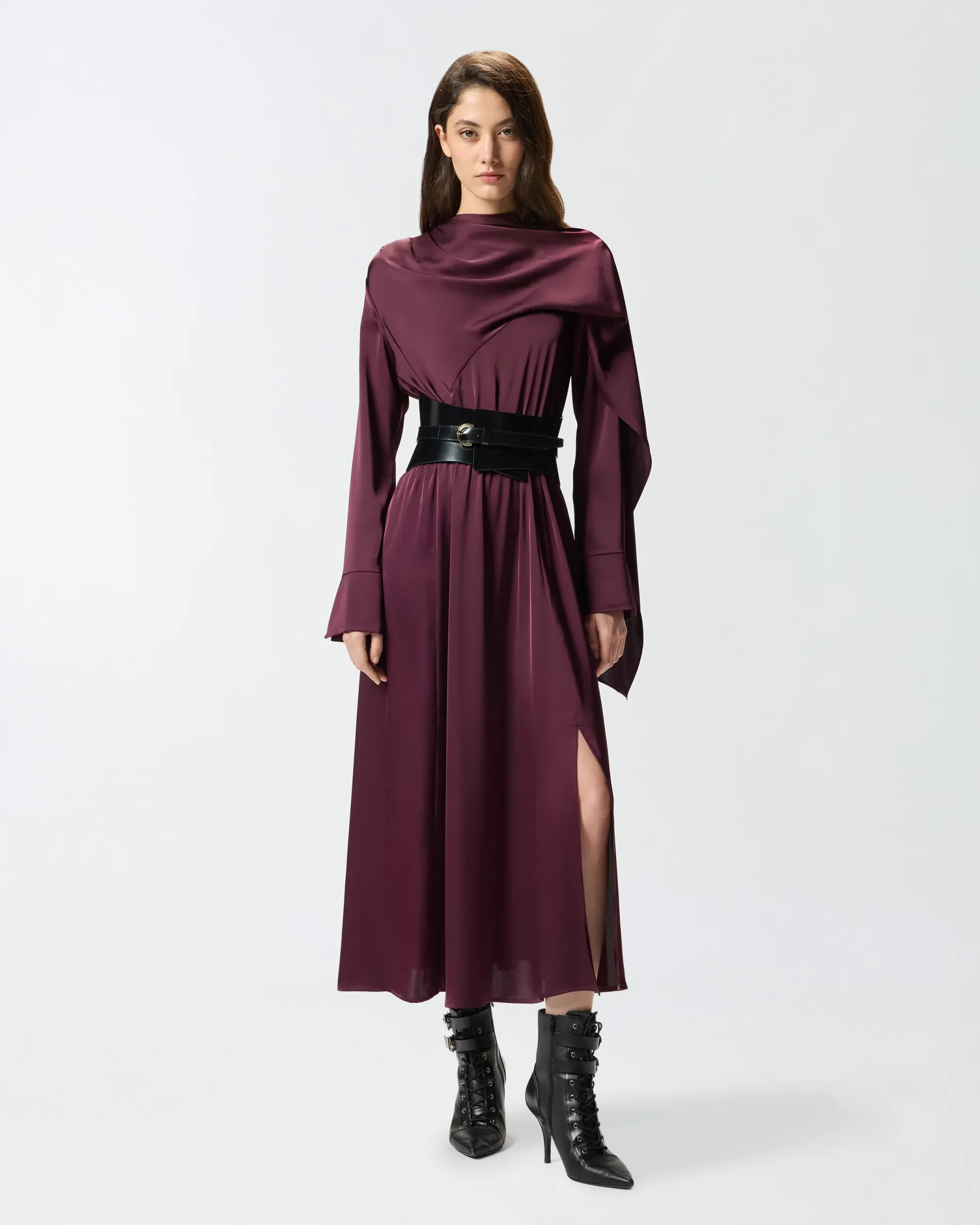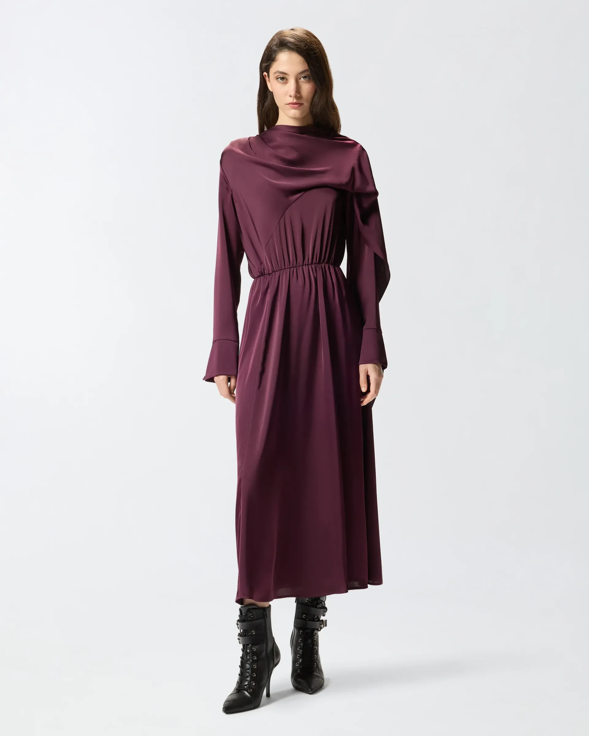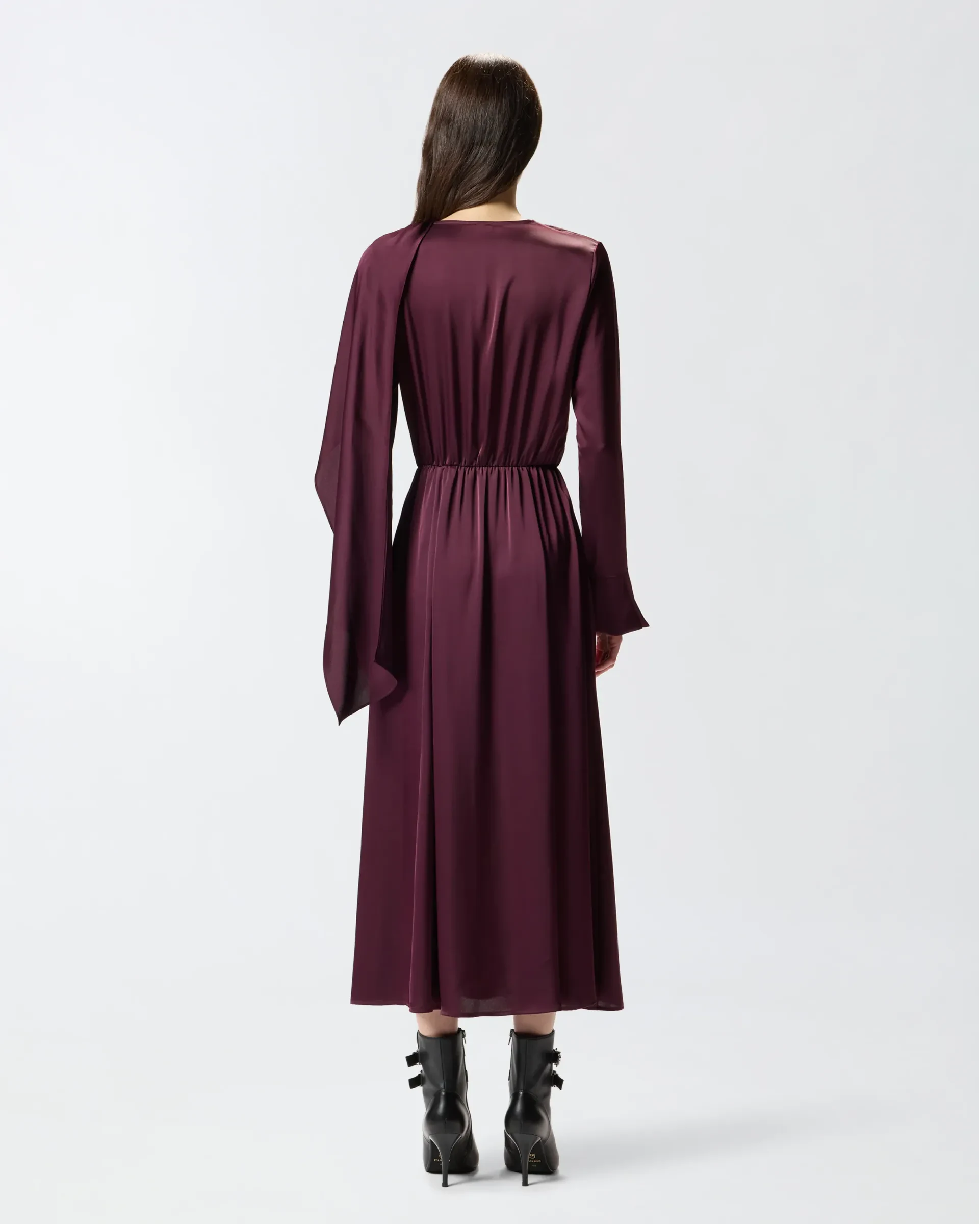 Relaxed-fit dress in satin crepe fabric with elasticated waist and side slit. This garment features long sleeves with flared cuff, a wide skirt and a neck sash that you can wear in different ways for an original, personal look with that pure PINKO style. Choose this piece for a fluid, slinky effect that brings out the female figure in an elegant, refined way.