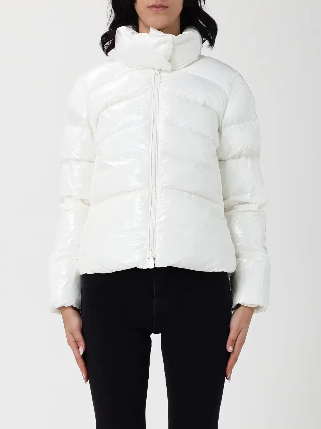 Padded pea coat in crystal-effect nylon fabric with a special glossy finish, customised with the Love Birds logo patch on one sleeve. This style features horizontal quilting, which is slightly slanted on the front, and has a wraparound high collar with hidden buttons to protect you from the cold. Two-way metal zip fastening at the front.