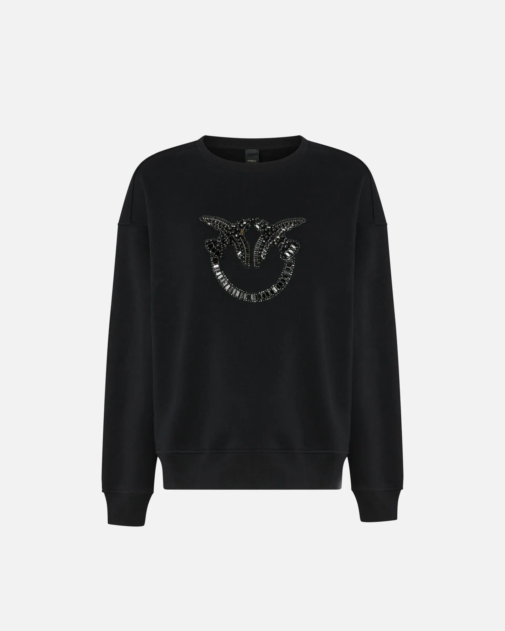 Women's long-sleeved cotton crew-neck sweatshirt. This piece is embellished with the Love Birds logo decorated with hand-embroidery consisting of pearls, crystal chain with a baguette cut and rhinestones in different shapes attached with special claws on the sides to make them more secure. This sweatshirt is ideal for casual early-season looks, delivering original style for all-day wear.