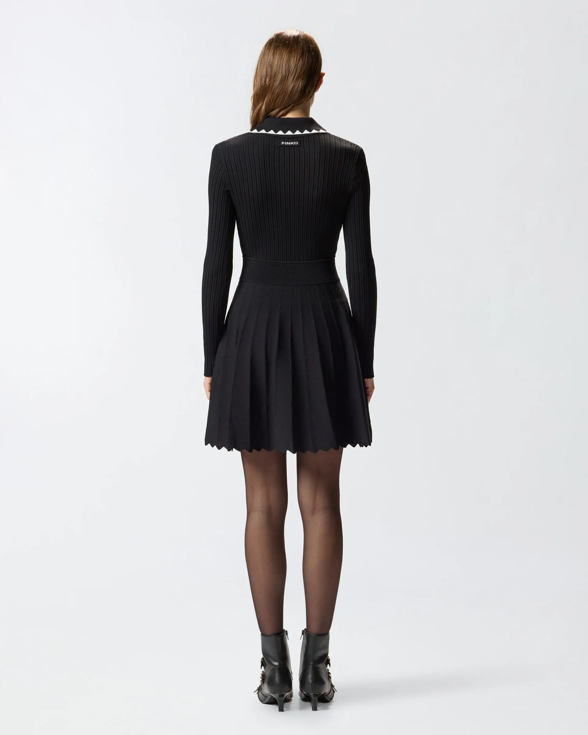 Long-sleeved viscose-blend dress with a contrasting polo collar and three-button fastening. The piece features an embroidered waistband and is completed by a wide, pleated skirt, embellished by a scalloped hem. The final touch is given by the tone-on-tone label with PINKO lettering logo behind the neck. The piece has undergone finishing tests to minimise the possible formation of pilling, ensuring greater fabric softness and durability. The perfect dress for elegant style that does not compromise on comfort.