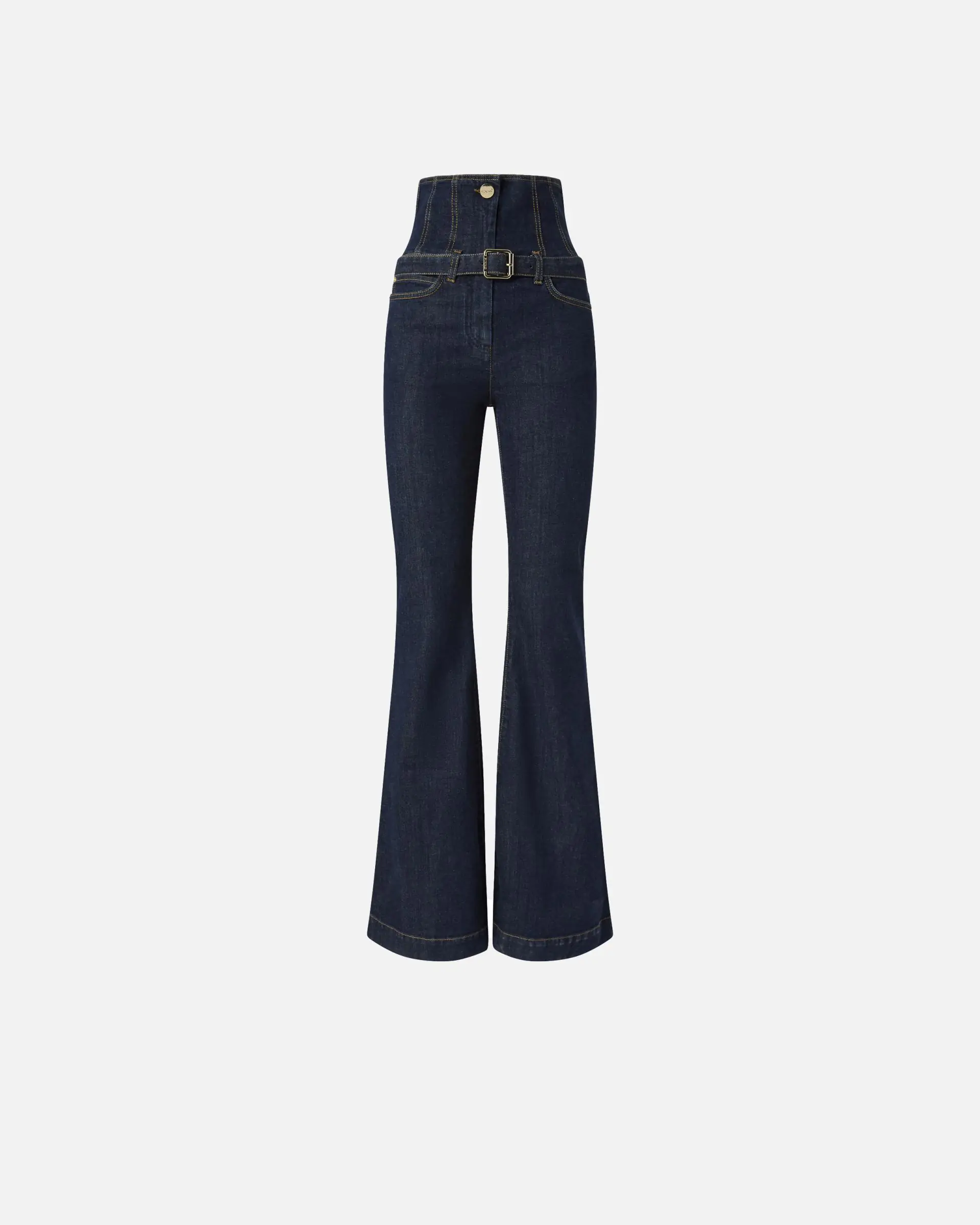 Flared five-pocket jeans with a leg that is fitted to the knee and loose and flared on the hem, distinguished by a very high-waisted design with top-stitching that resembles the boning in women’s bustiers. This piece is made from cotton comfort denim with a delicate blue rinse wash. The lettering logo embroidered on the back right pocket adds pure PINKO style to the design. The piece is completed by the belt loops, the matching belt with branded metal buckle and the hidden front fastening. Try the total look with the matching bustier for a bold, feminine outfit.