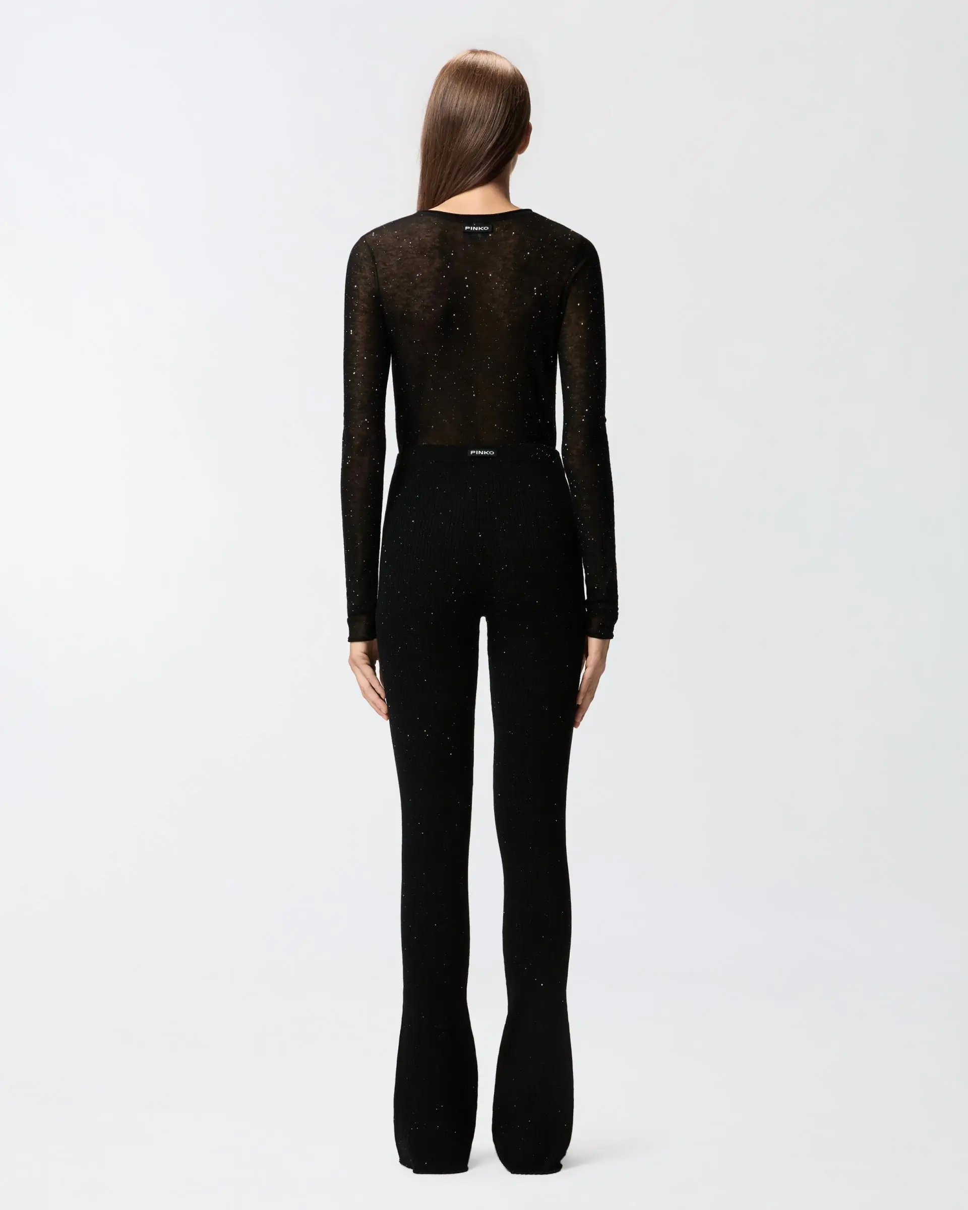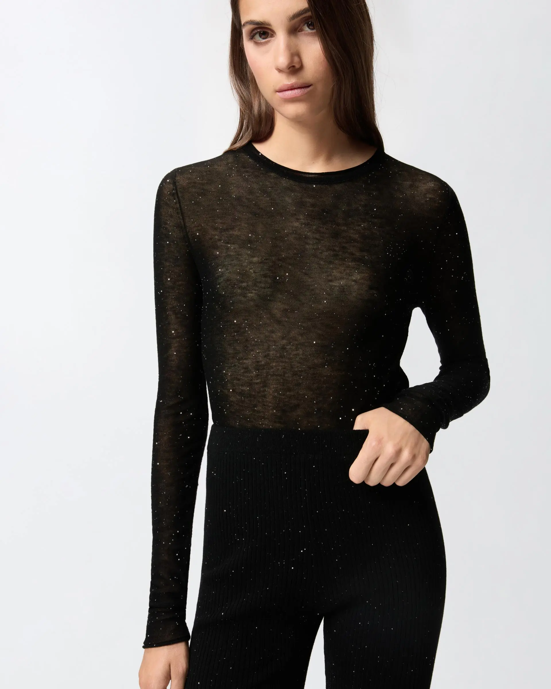 Crew-neck sweater made from a semi-sheer wool blend: a lightweight and soft yarn that is almost impalpable, which helps create a sensual and striking look. The design is embellished with micro-sequins inserted in the thread and manages to be shiny and understated and extremely comfortable to wear. The piece has undergone finishing tests to minimise the possible formation of pilling, ensuring greater fabric softness and durability. The final touch is given by the label with PINKO lettering logo on the back.