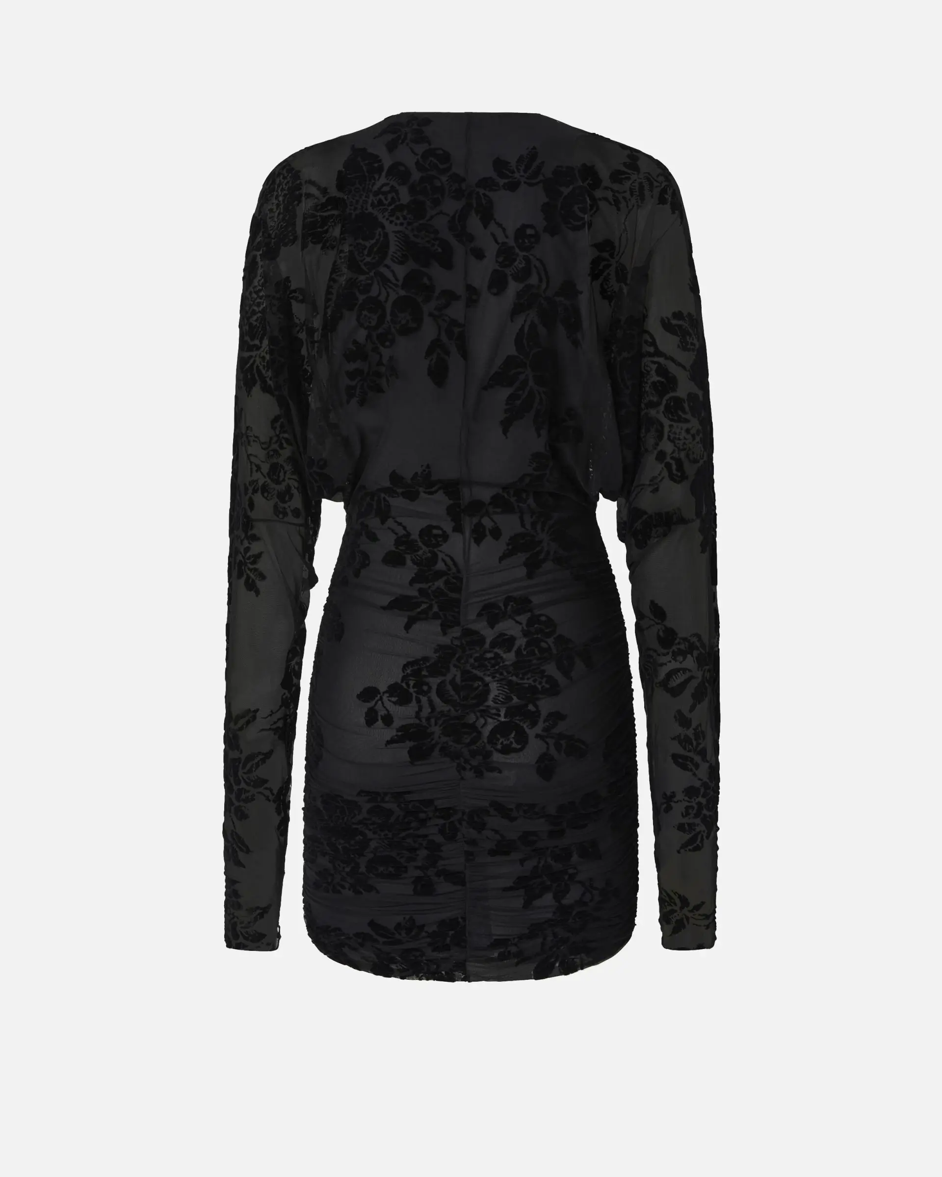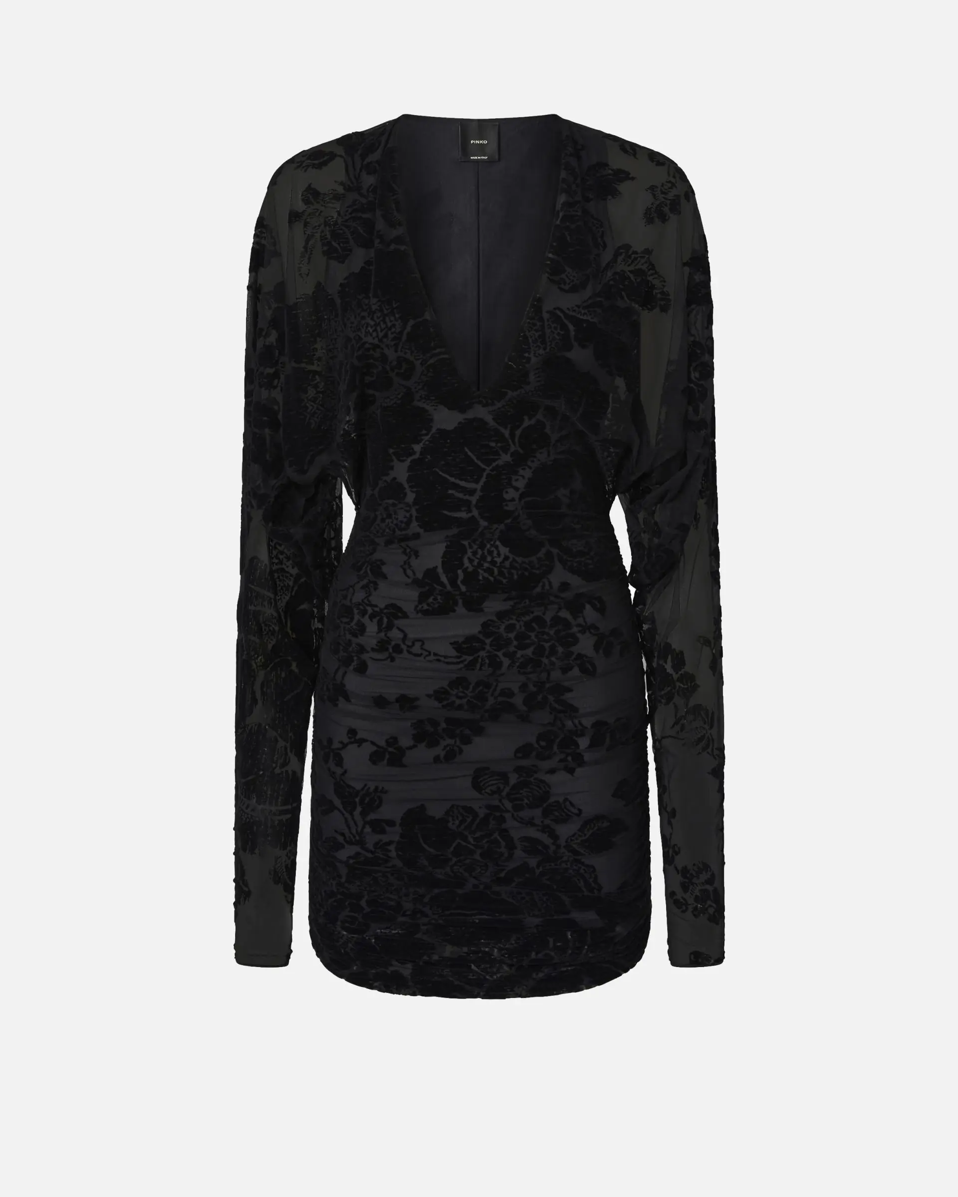 Short, fitted tulle dress with a V-neck with a print inspired by tapestry motifs but with a contemporary edge. The run-resistant mesh is a very durable fabric that has undergone special treatment to prevent the stitching from unravelling when torn. The dévoré effect is achieved through the flock print that enhances the floral design that is rich in ramage and intricate details, creating sophisticated detailing that gives the surface depth and a feeling of three-dimensionality. The contrast between the softness of the texture and the complexity of the floral pattern creates a striking look and a refined, sensual feel.