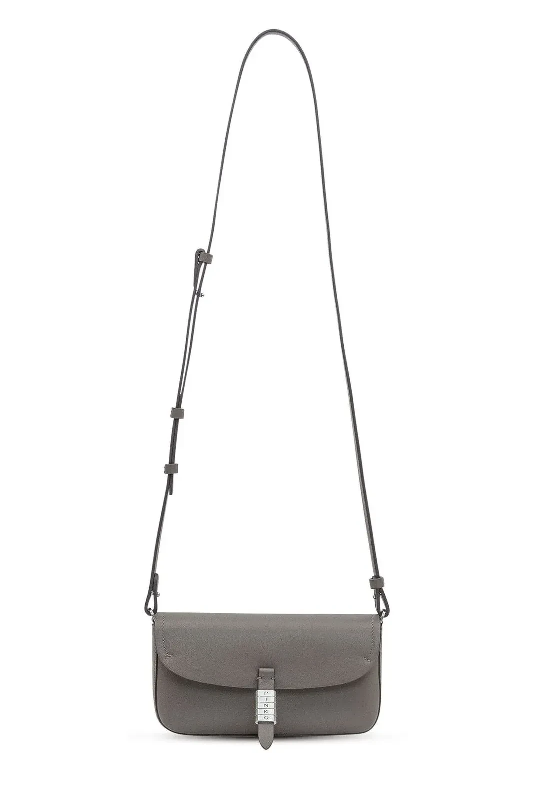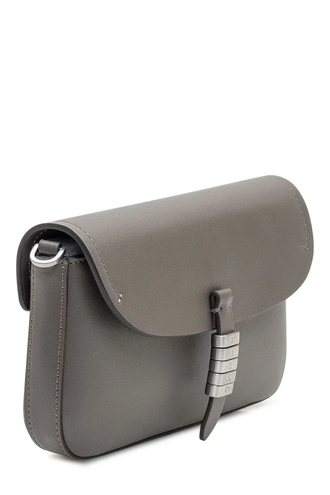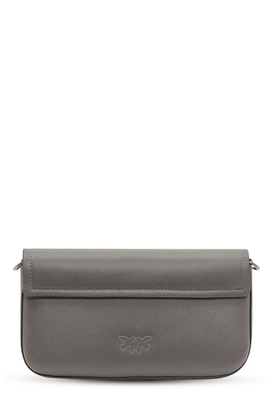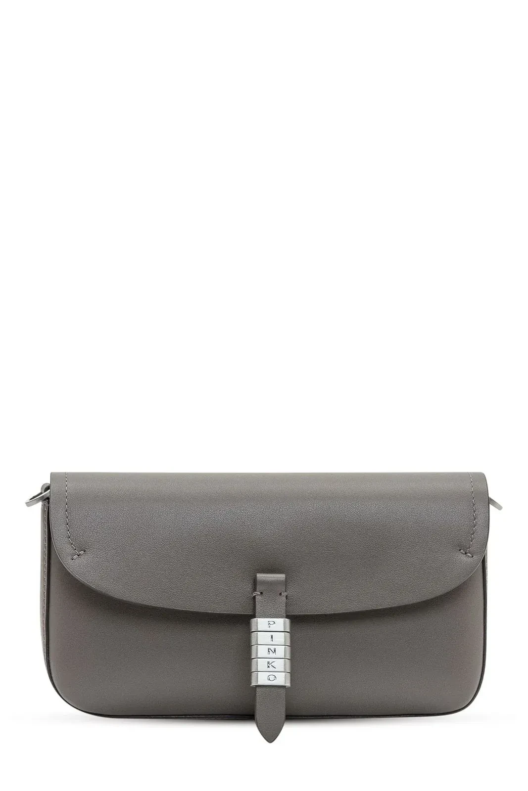 Pinko Saddle Flat gray leather with adjustable shoulder strap, metal buckle closure and engraved logo.