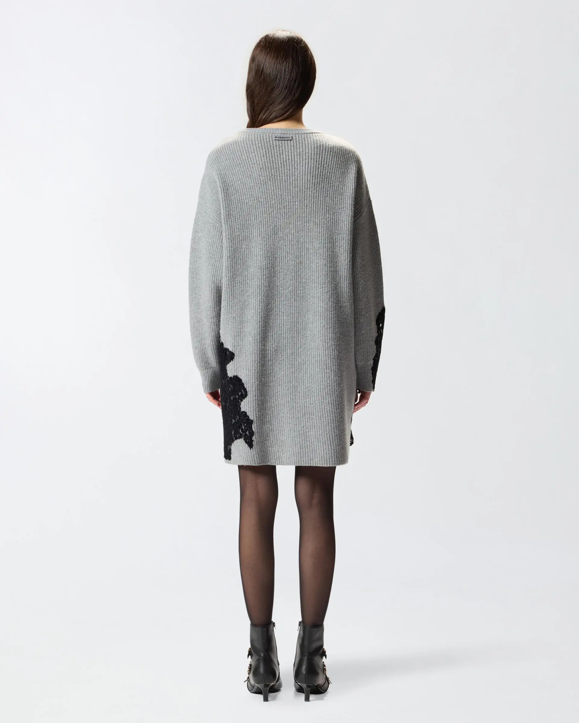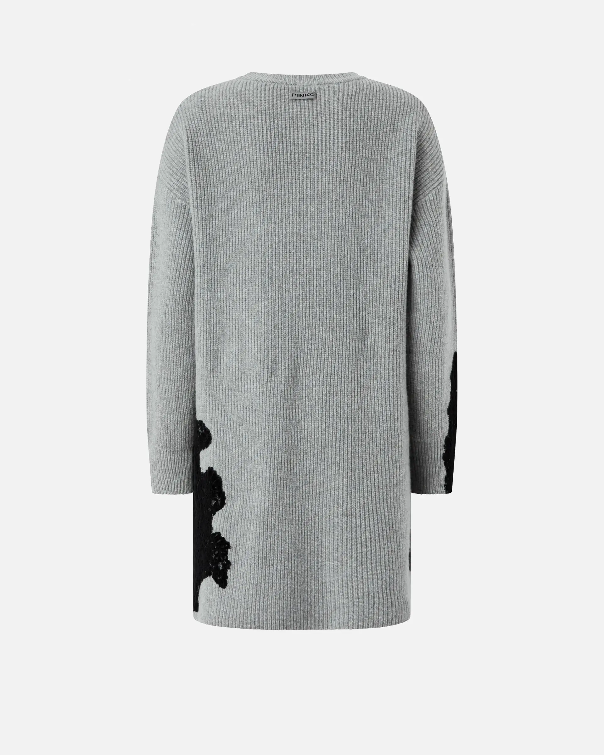 Short dress in rib-knit wool-blend fabric: a yarn that offers a perfect balance between comfort and softness. The detail that embellishes the design is the hand-worked flocked lace inlay on one sleeve and on the hem. The piece has undergone finishing tests to minimise the possible formation of pilling, ensuring greater fabric softness and durability. The final touch is given by the tone-on-tone label with PINKO lettering logo behind the neck. Add this design to your wardrobe to give your winter outfits a twist.