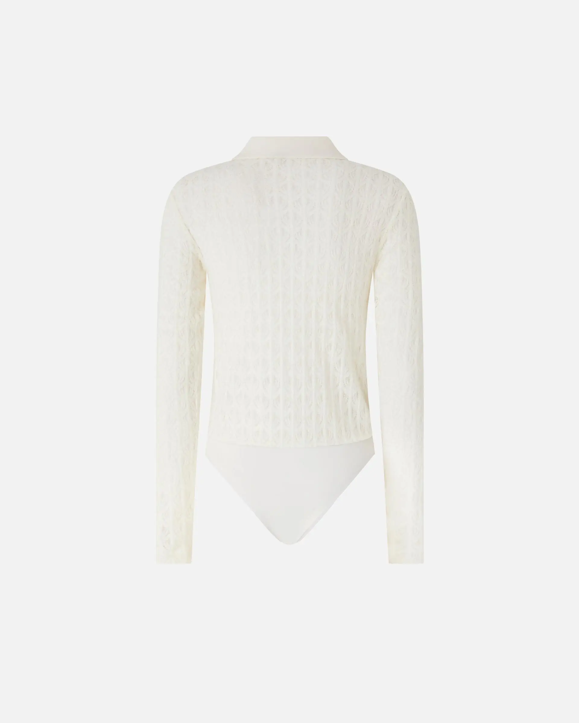 Long-sleeved knit bodysuit in warm, enveloping lace. This garment is inspired by two different designs: a polo shirt with collar and button placket at the top, and a classic bodysuit at the bottom. The semi-sheer lace, punctuated by vertical ribbing, combines the two styles in a sophisticated way. If you're after the perfect piece to complete your casual-chic outfits, look no further!