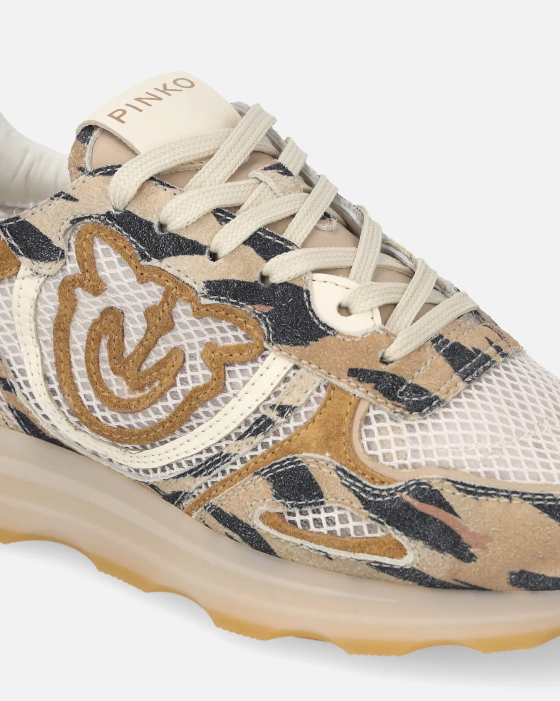 Lace-up sneakers featuring a refined interplay of tactile and visual contrasts combined with mesh, smooth leather details and suede inserts with an eye-catching tiger pattern. The PINKO logo lettering adorns the heel, while the Love Birds logo appears on the sides of the sneakers. The rubber and EVA sole with grooves on the tread ensures convenience and grip while the leather insole guarantees maximum comfort. Thanks to the bold, contemporary aesthetic, an expression of the brand's DNA, these sneakers are ready to become the highlight of your casual outfits.