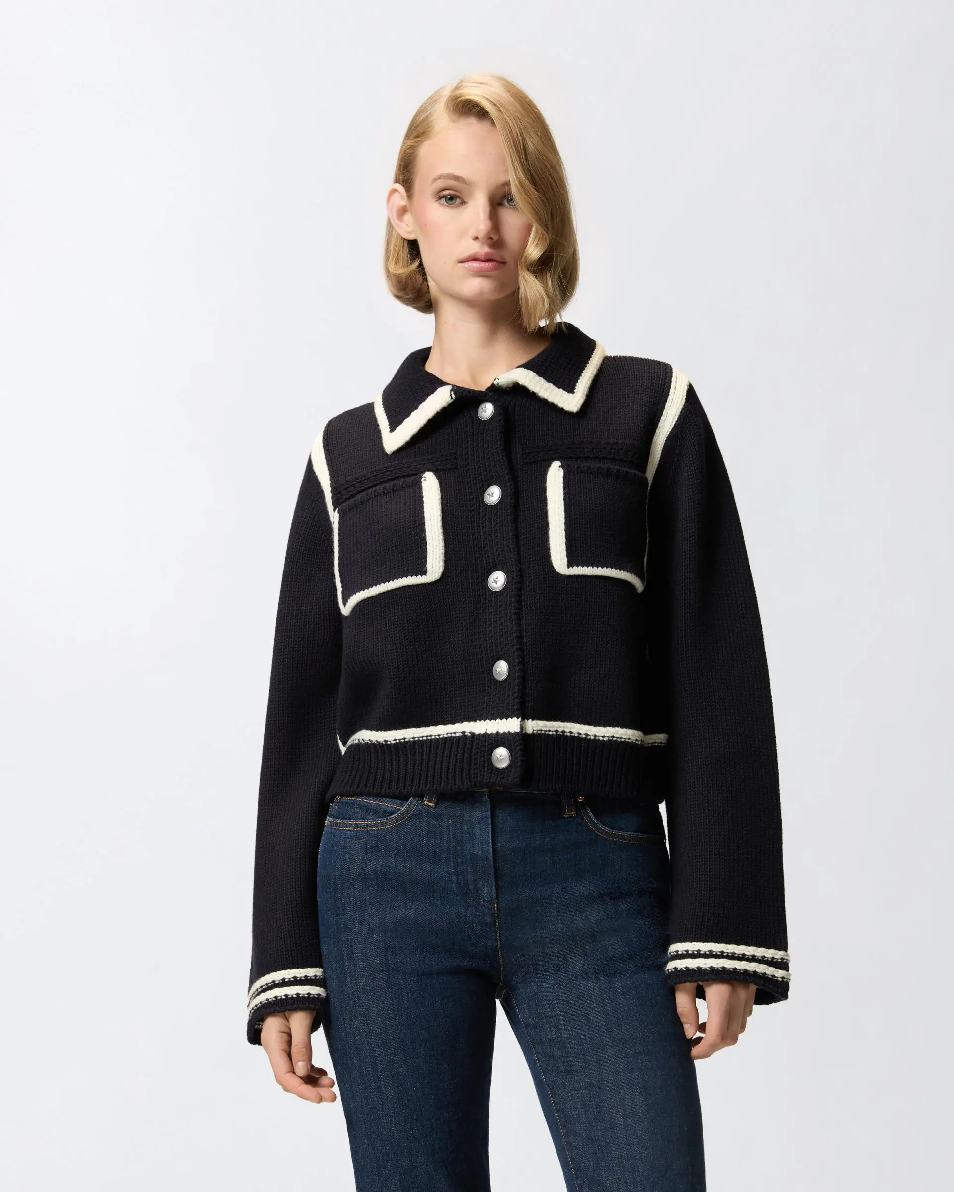 Preppy-style cardigan in fine and soft merino wool. The design features a contrasting yarn that highlights the cuffs, yoke, hem, collar and front pockets. The final touch is given by the tone-on-tone label with PINKO lettering logo behind the neck. The piece has undergone finishing tests to minimise the possible formation of pilling, ensuring greater fabric softness and durability. Front fastening with star-decorated metal buttons. Practical, original and on-trend: this style is destined to become the real ace up your sleeve in your wardrobe.