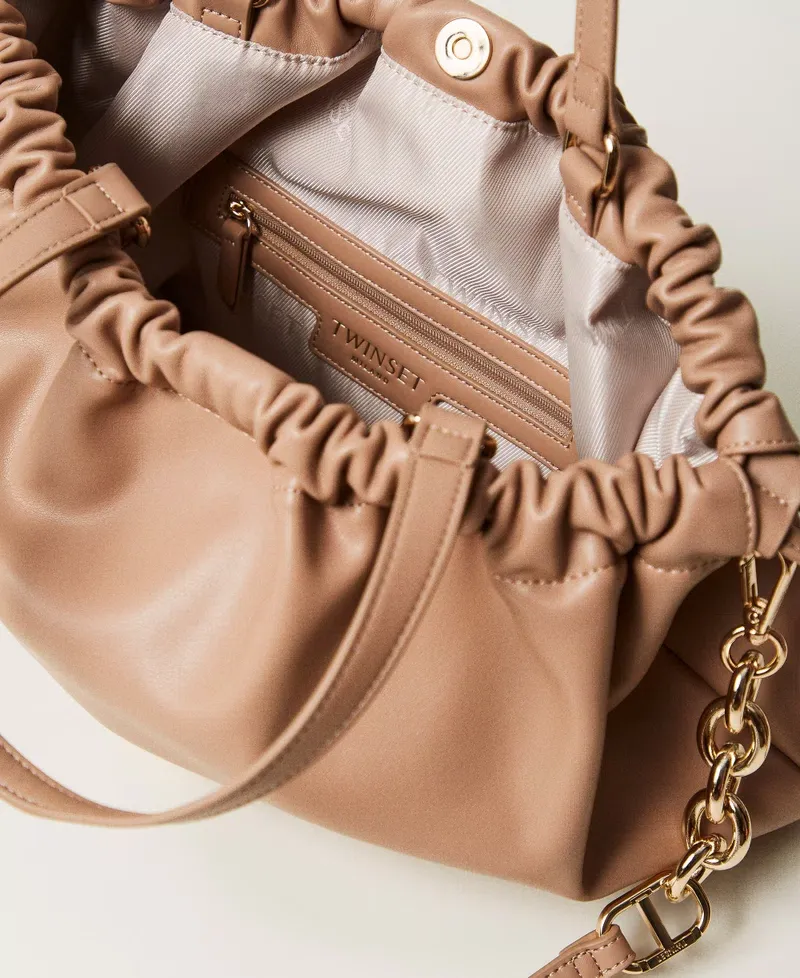 Shopper in smooth, soft faux nappa leather material with ruching. Drawstring and magnet fastening, double grab handle and removable shoulder or cross-body strap, metal Oval T logo on the front, lining.