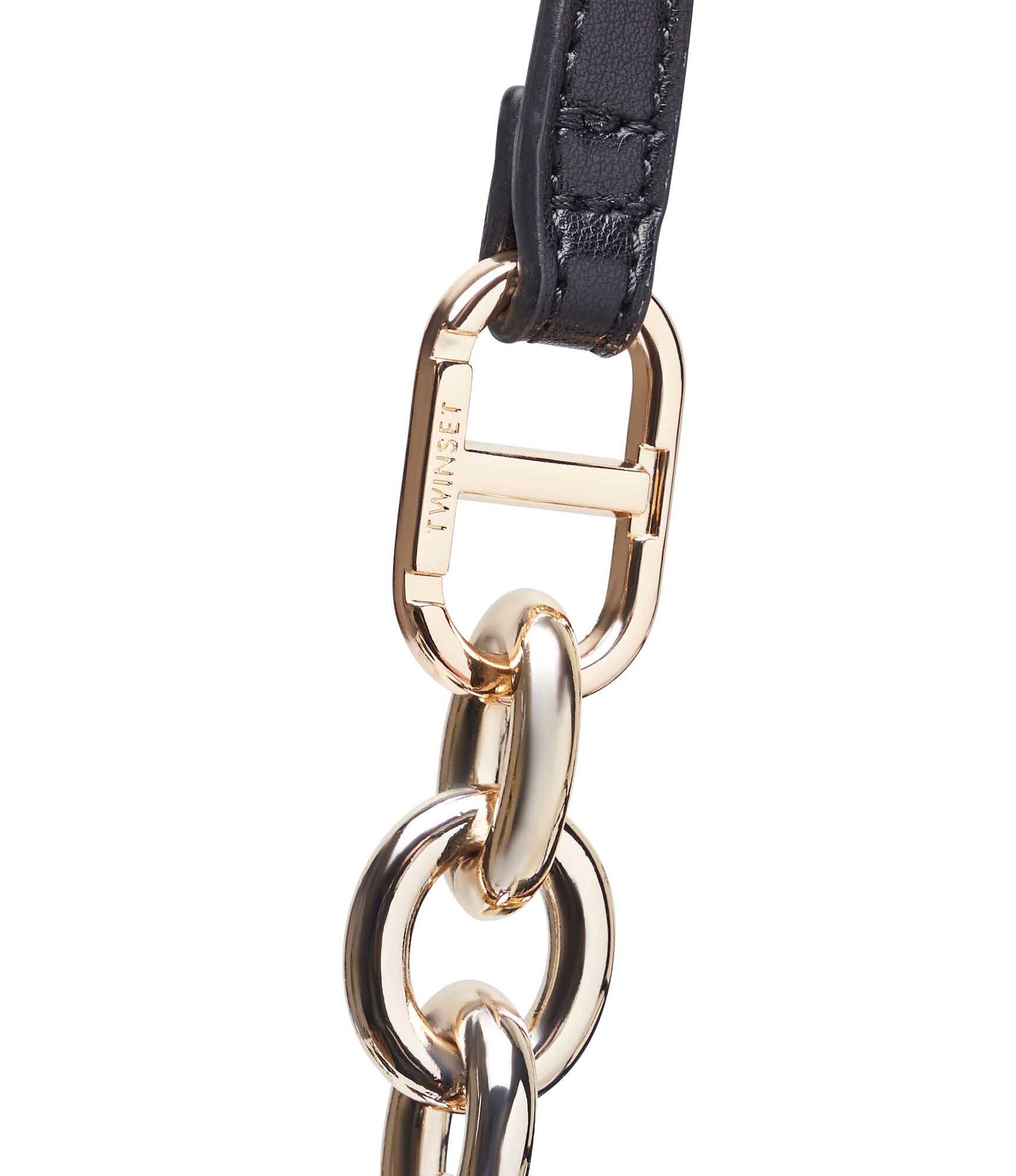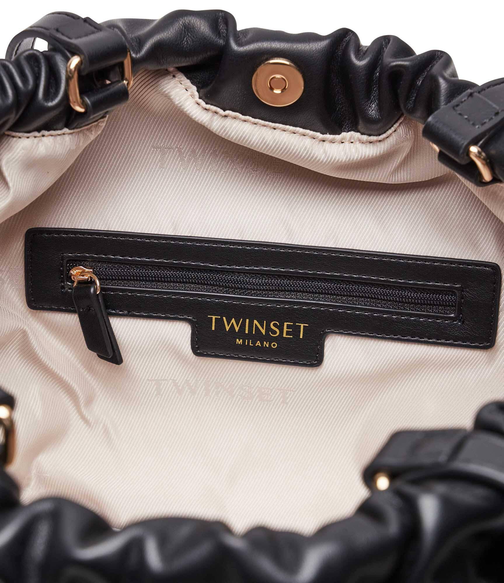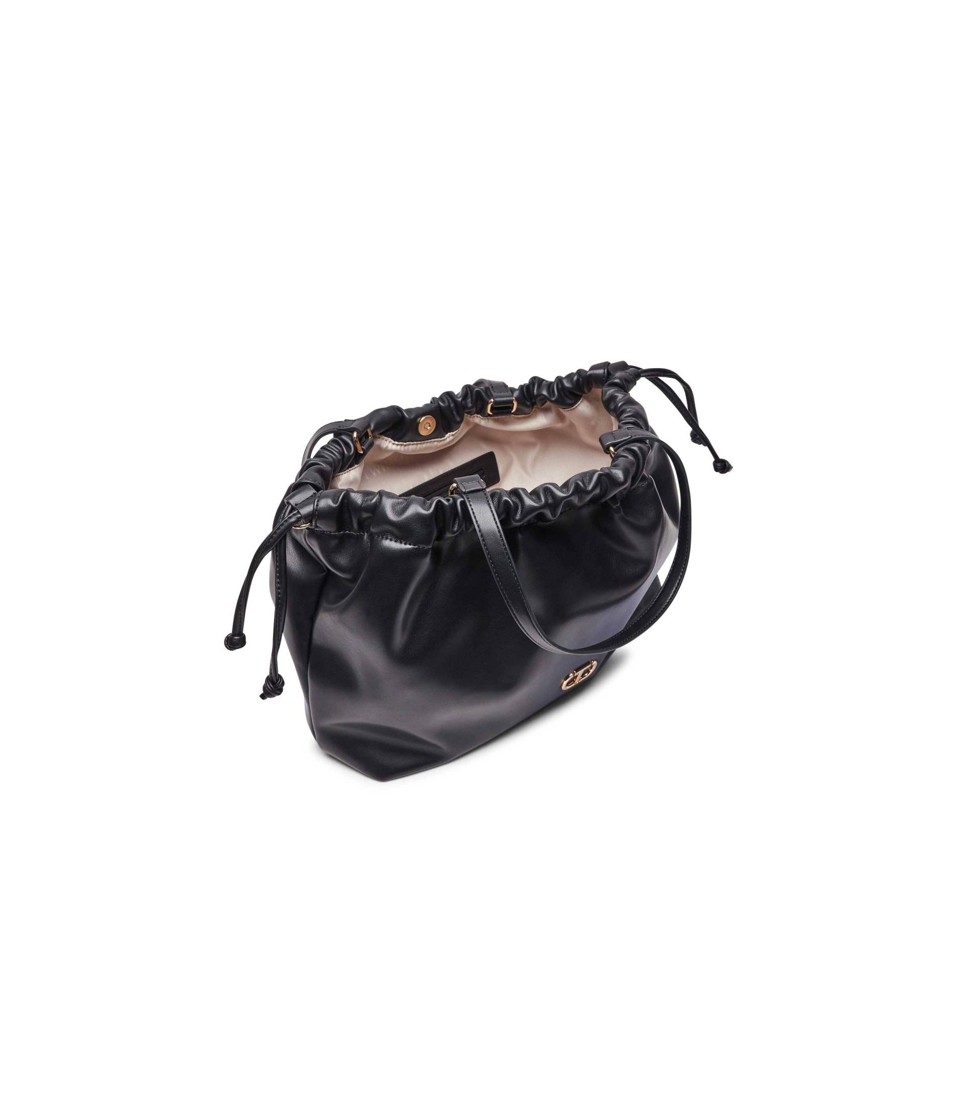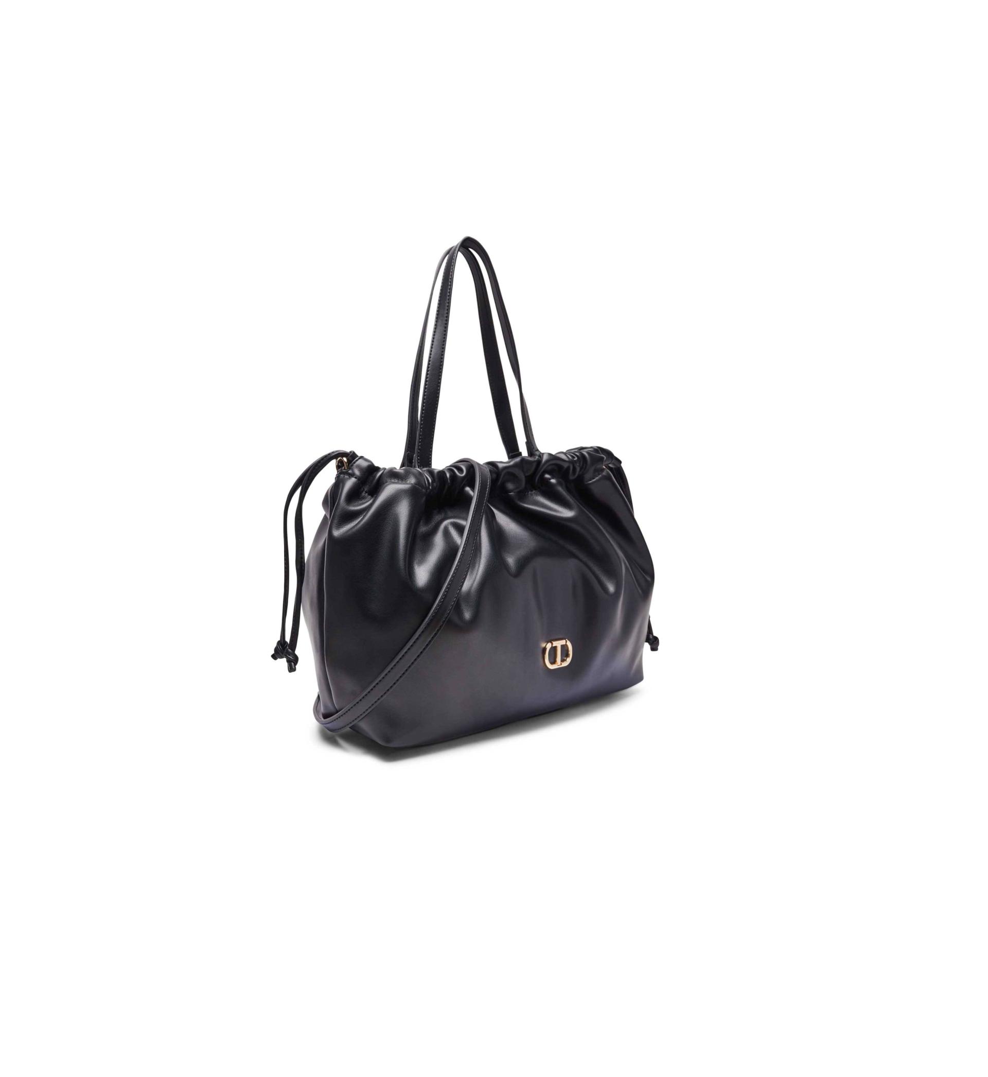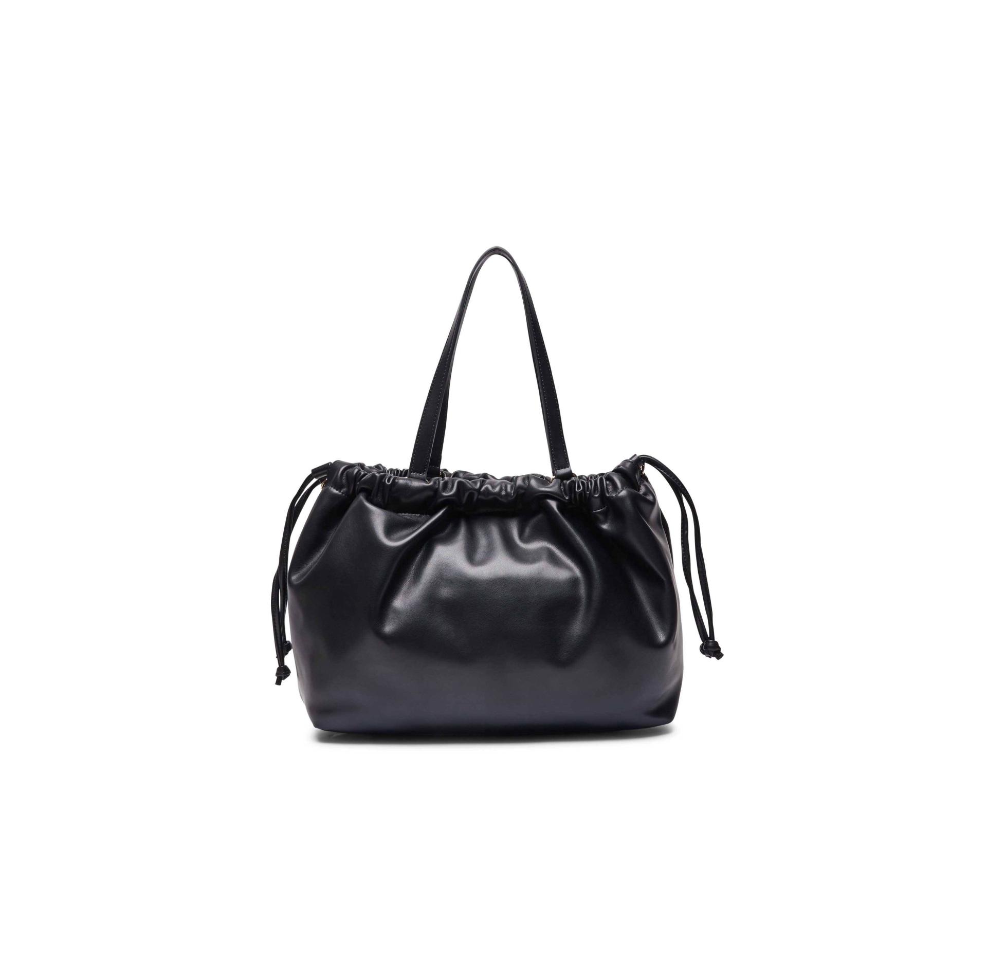 Shopper in smooth, soft faux nappa leather material with ruching. Drawstring and magnet fastening, double grab handle and removable shoulder or cross-body strap, metal Oval T logo on the front, lining.