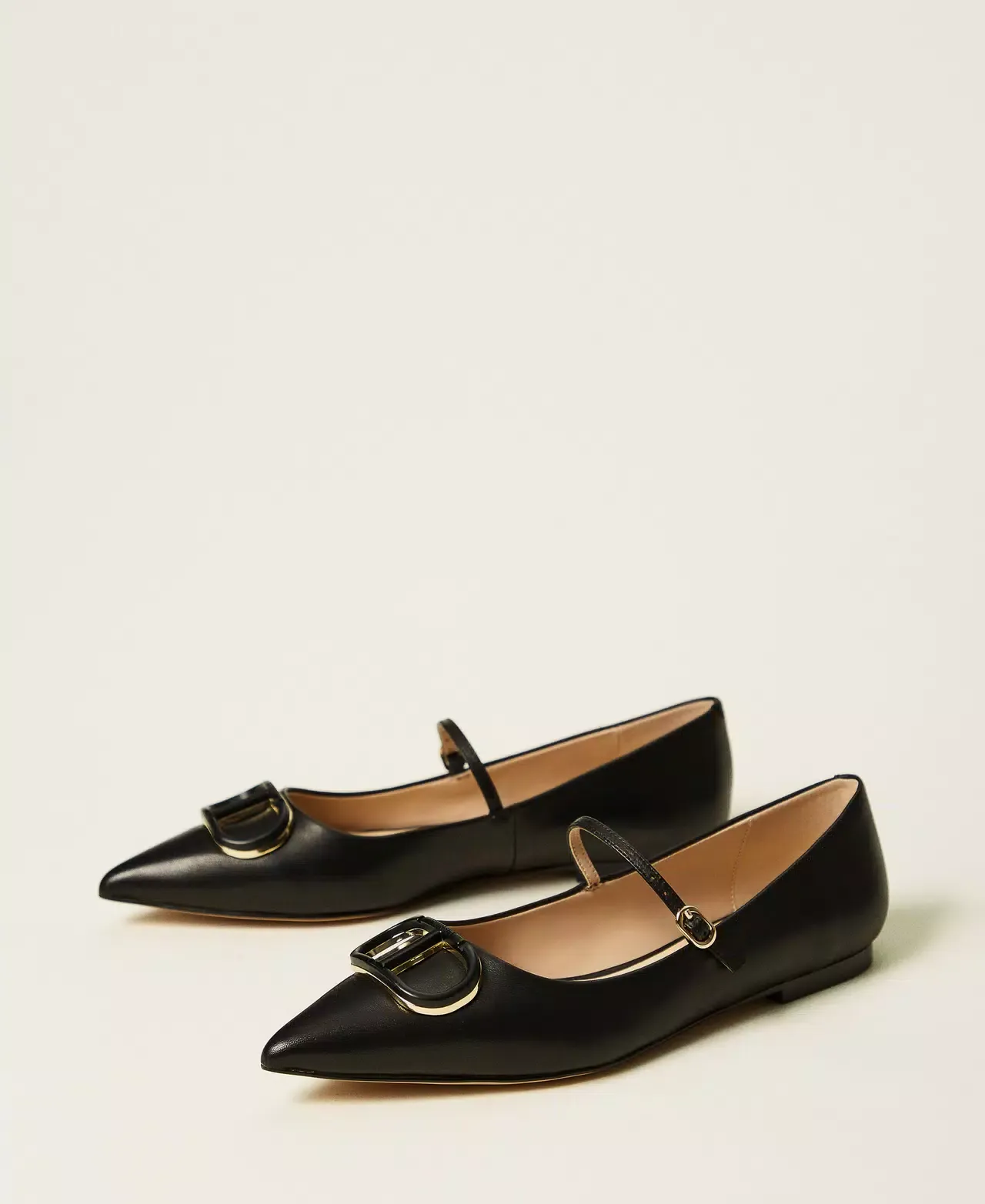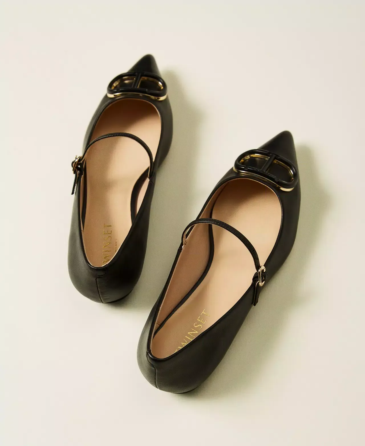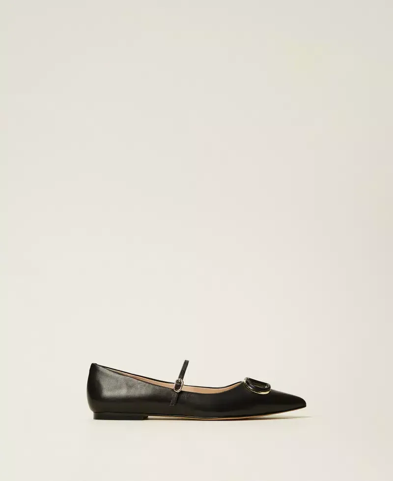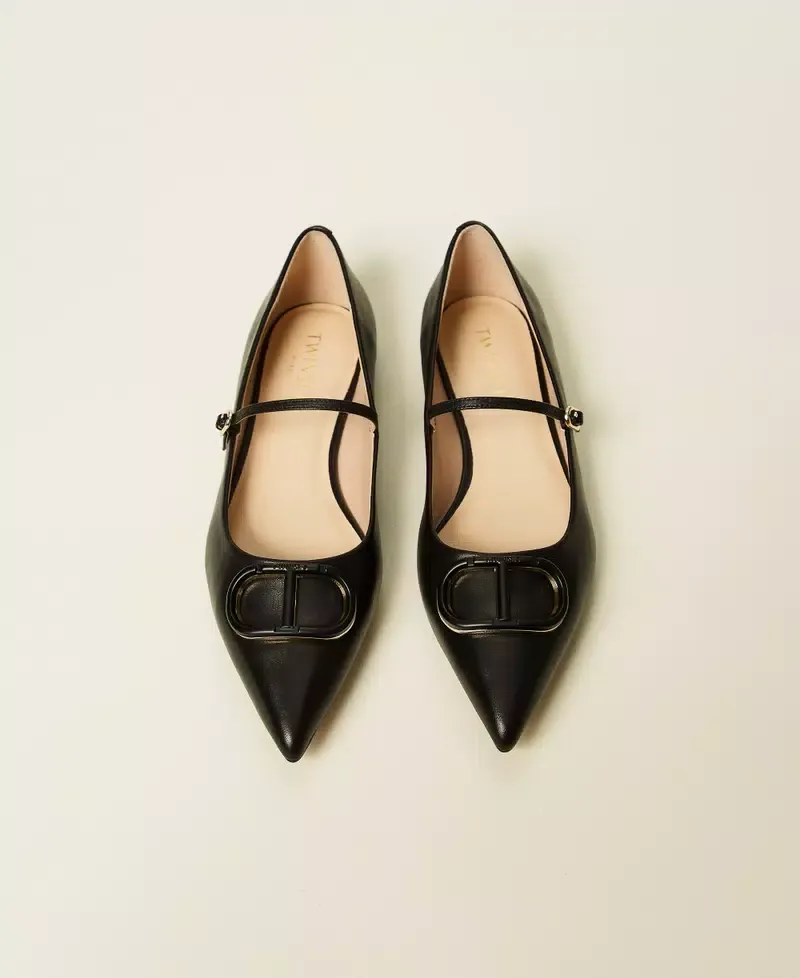 Mary Jane leather ballet flats with matching enamelled Oval T, tapered toe, tunit sole.