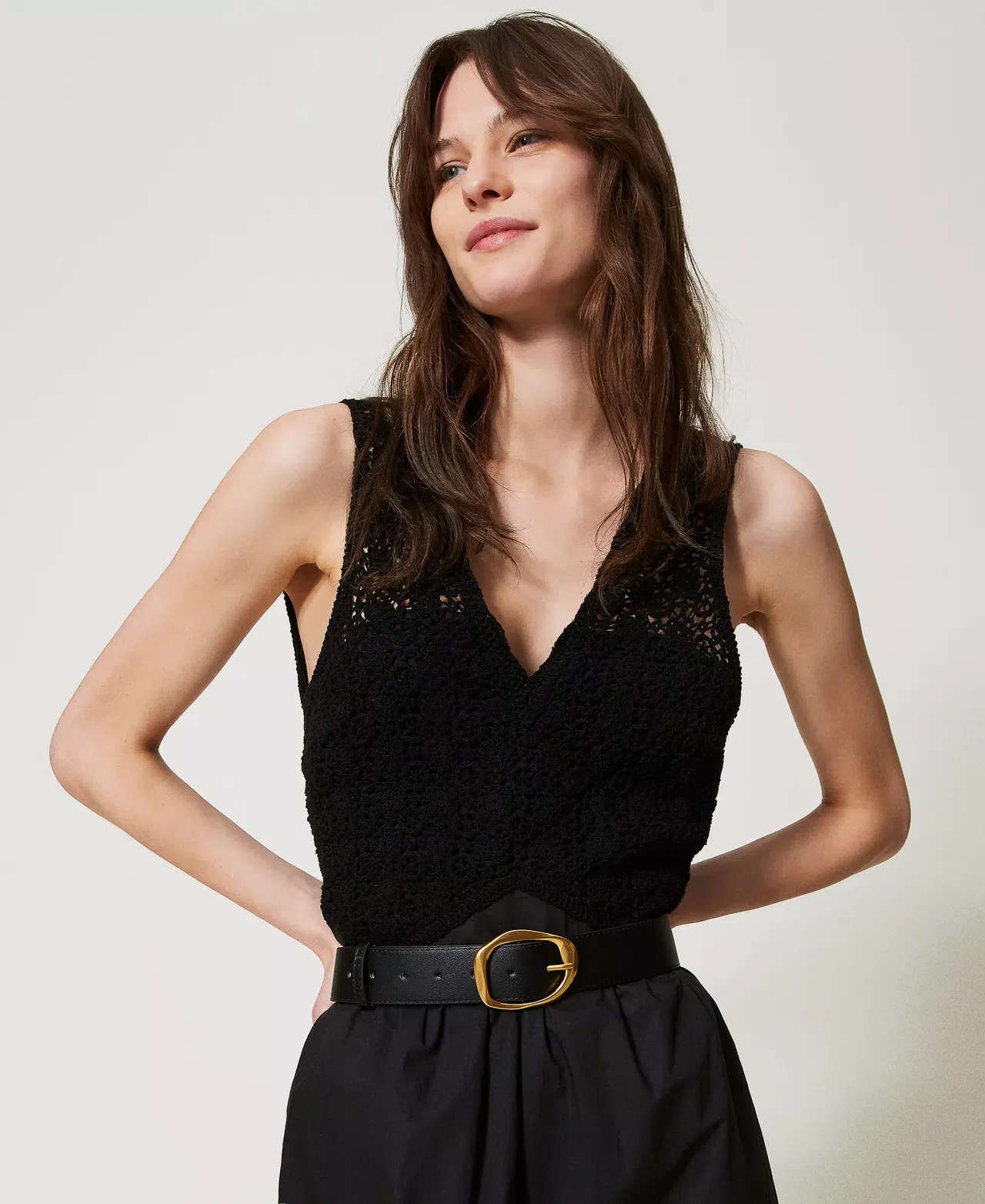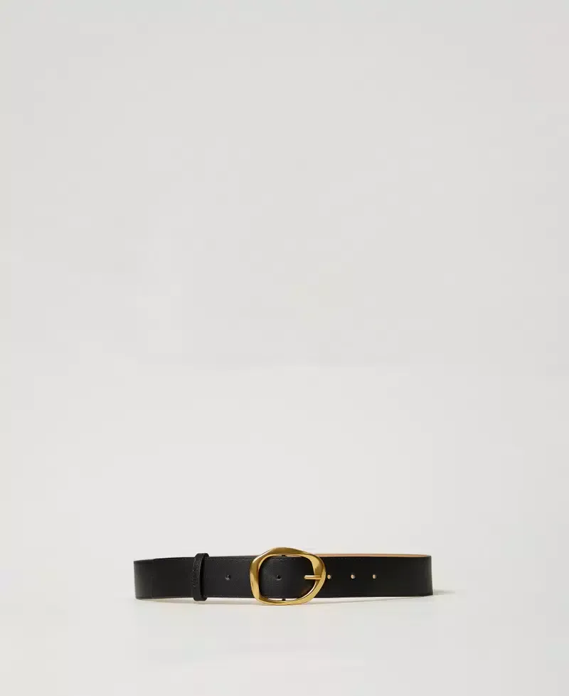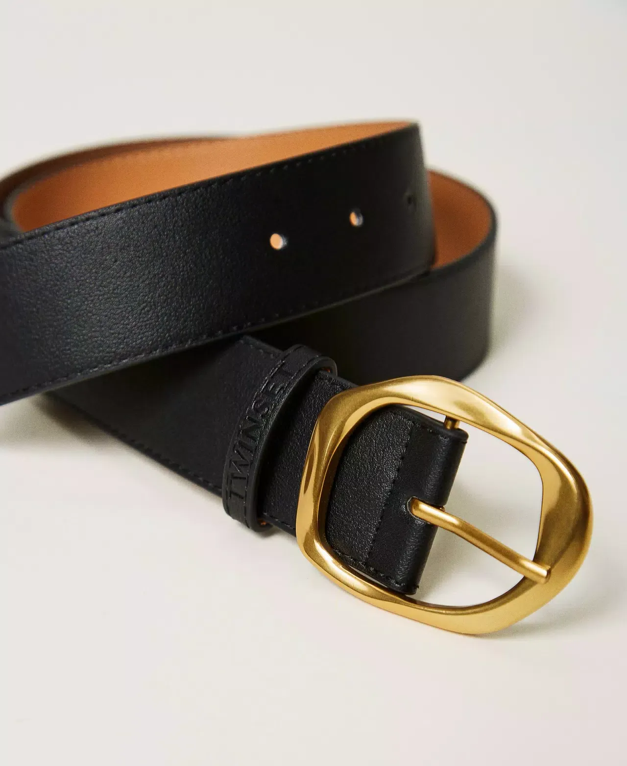 Low waist belt with aged brass-toned modelled buckle with hammered-effect, pin fastening.