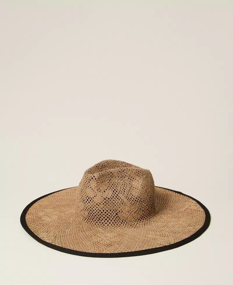 Wide brim, straw-effect perforated fabric hat with floral motif and contrasting trim and lettering logo. Adjustable internally.