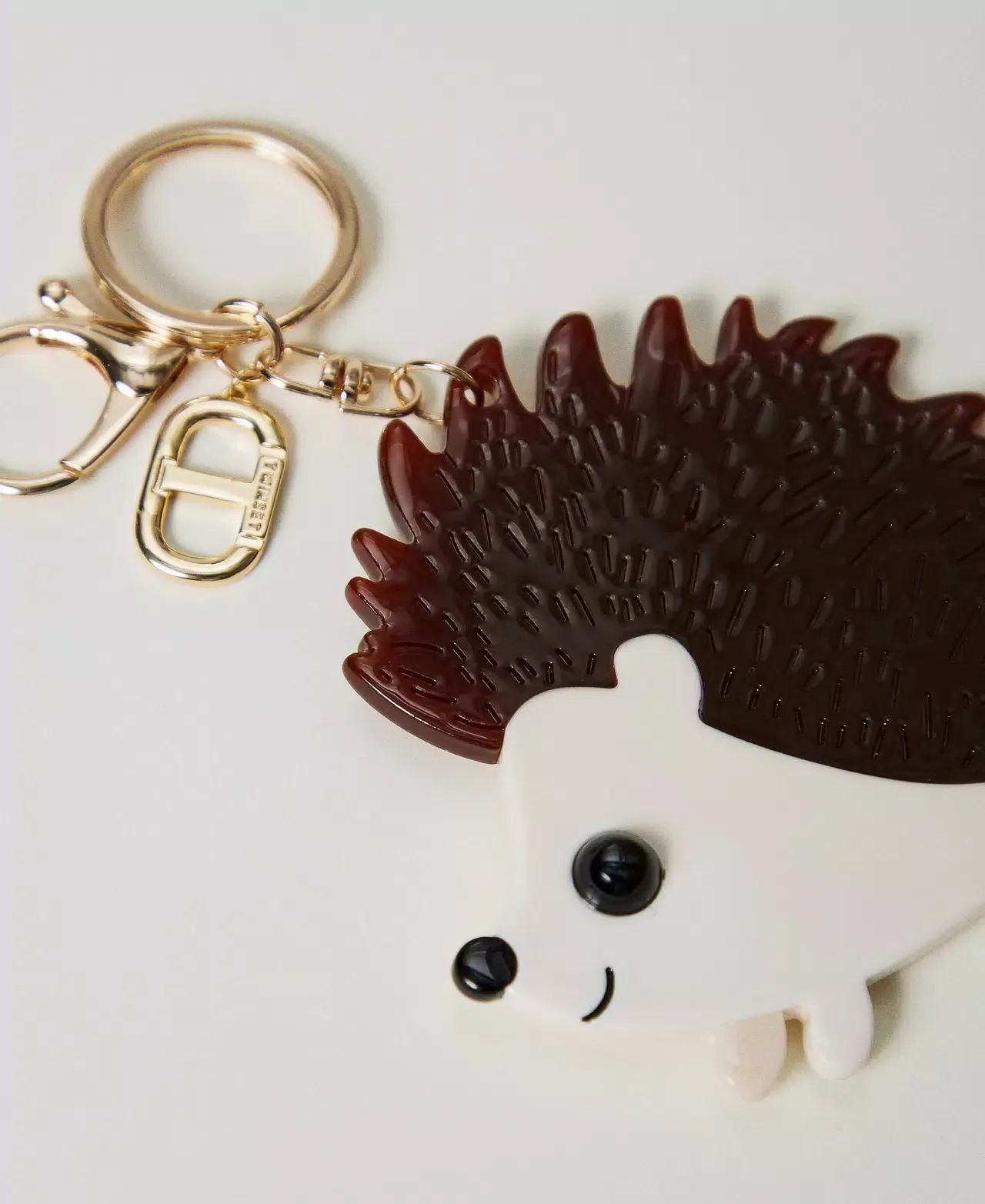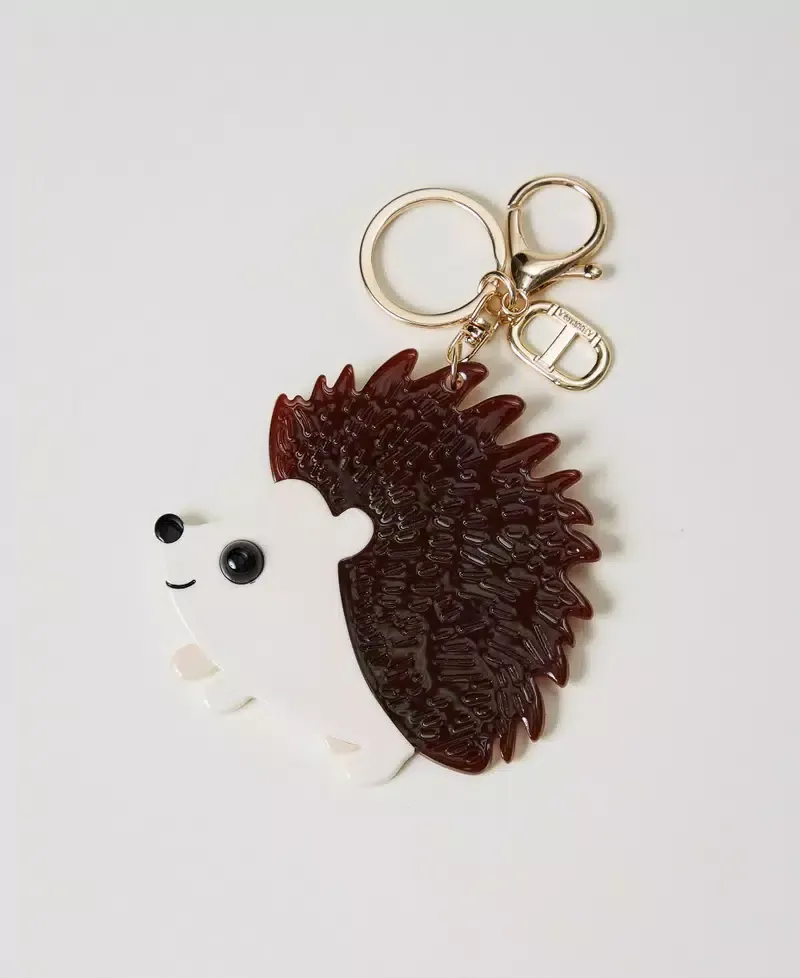 Coloured acetate resin key ring in the shape of a hedgehog. Gold-tone metal karabiner, ring and Oval T charm.