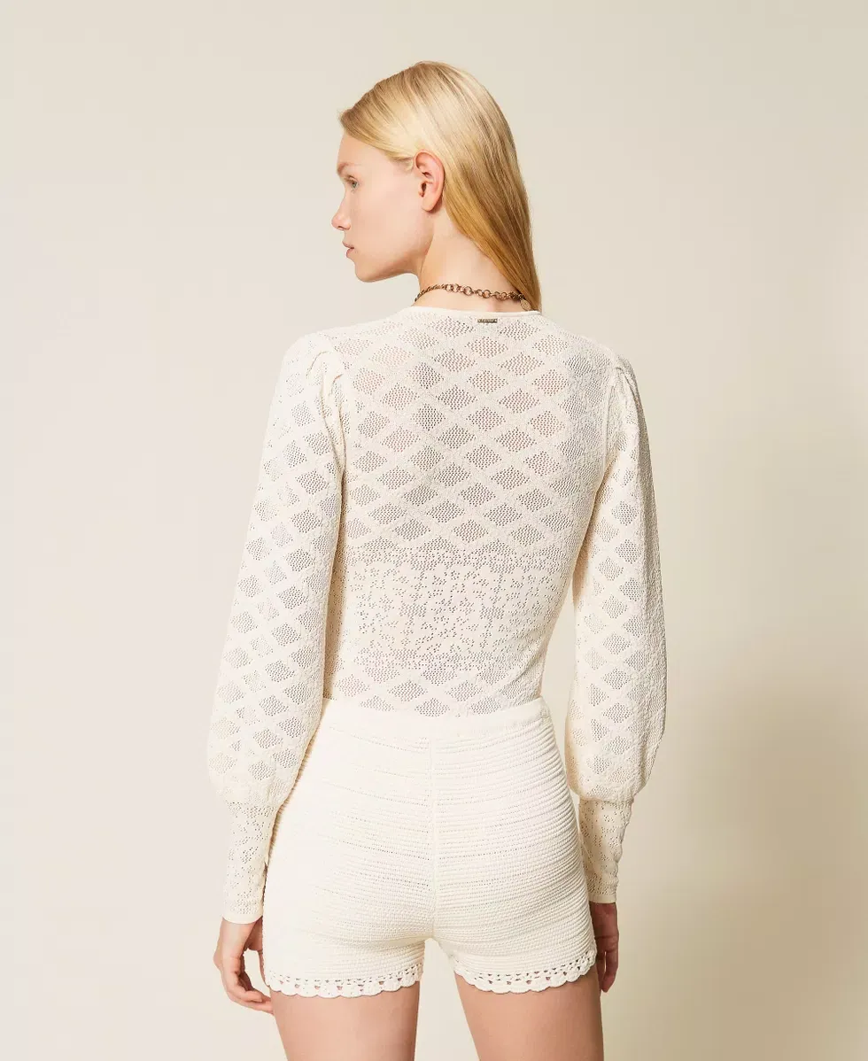 Stretch viscose openwork knit bodysuit with diamond and floral pattern with lace effect. Deep crew neck, long wide sleeves, fitted.