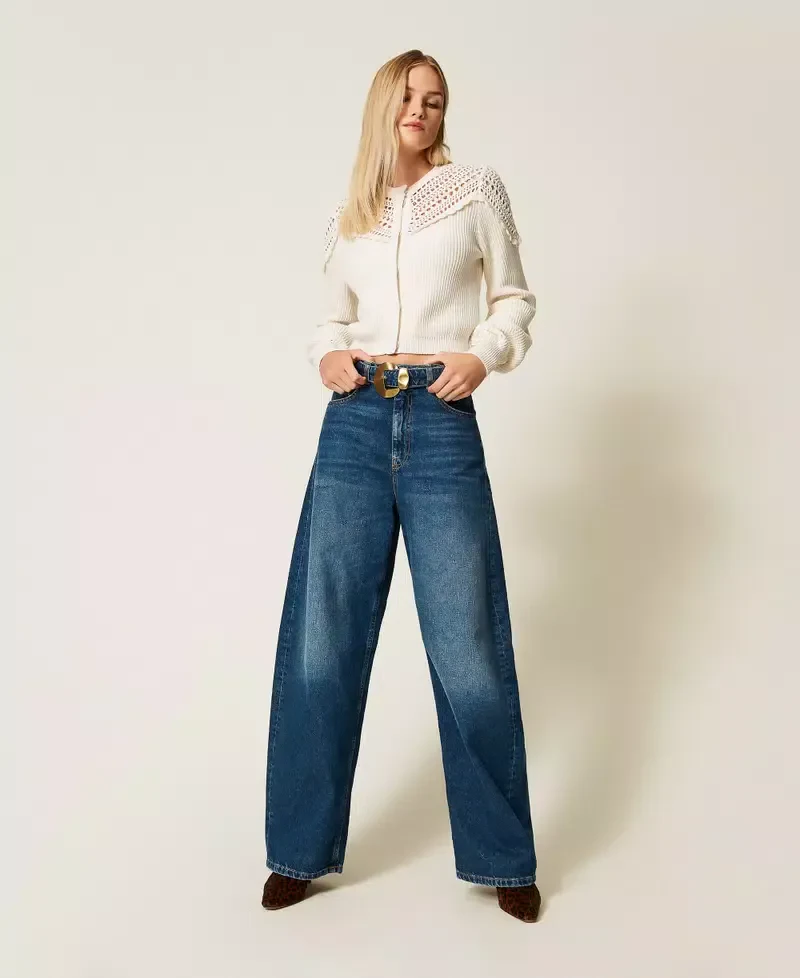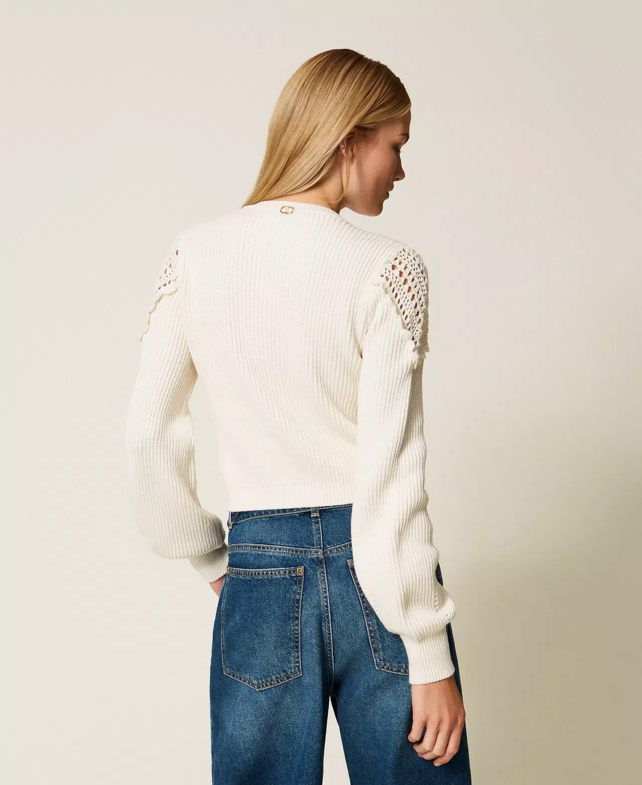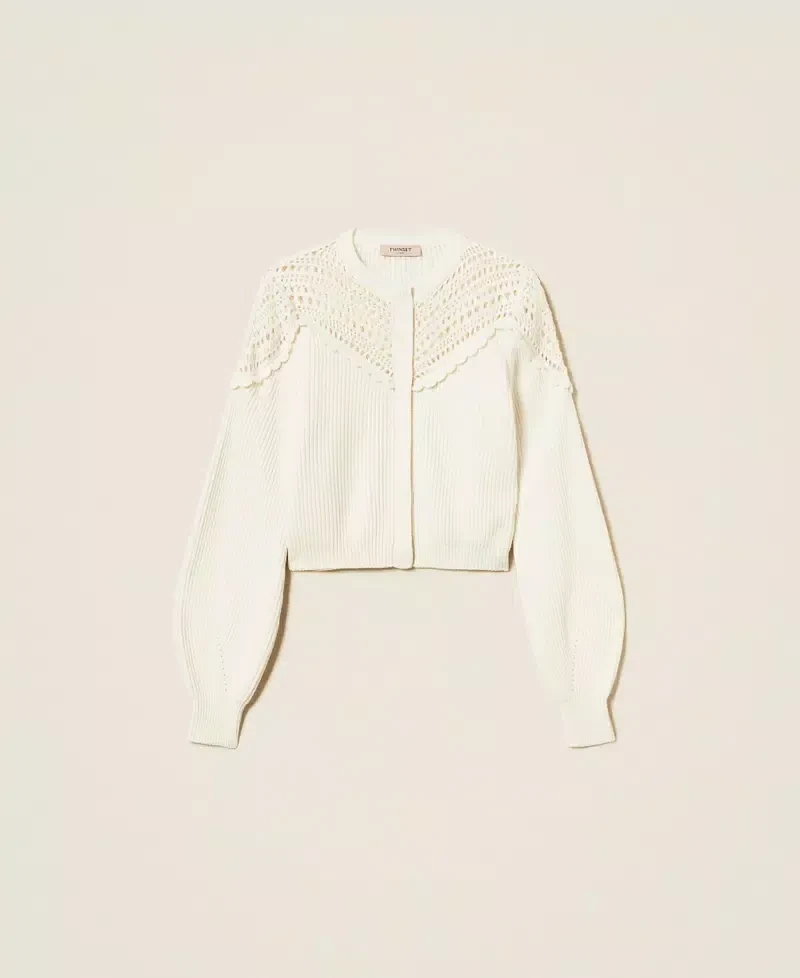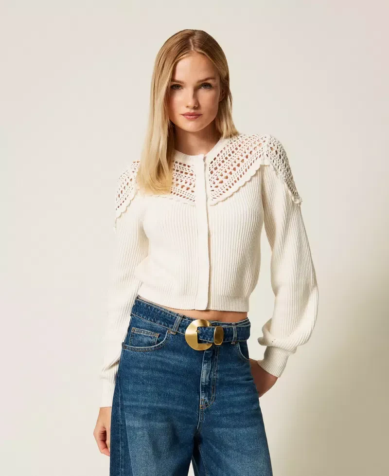 Wool and cotton blend cob stitch cardigan with hand scalloped crochet insert at the yoke. Round neck, long wide and slightly puffed sleeves, snap button fastening, Oval T logo plate on the back, loose fitting.